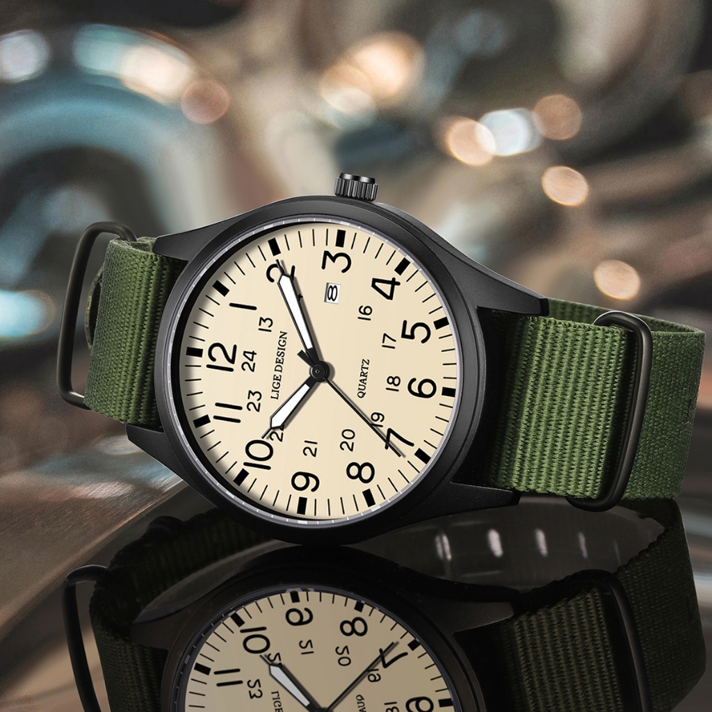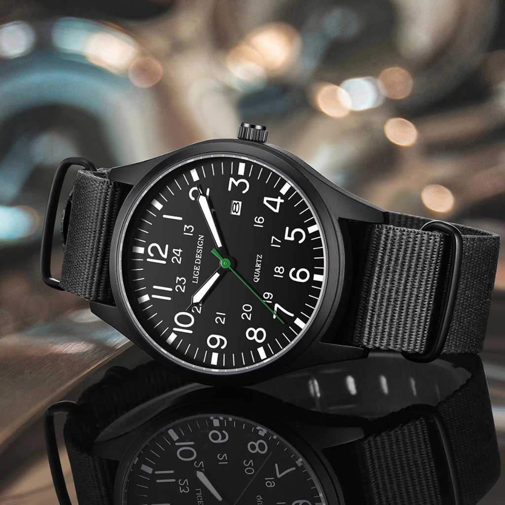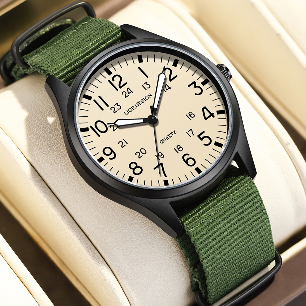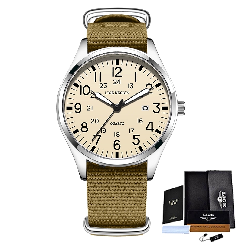 LIGE นาฬิกาข้อมือผู้ชาย แค่ นาฬิกาสําหรับผู้ชายกันน้ําเรืองแสงกีฬาควอตซ์ปฏิทินหนังนาฬิกาข้อมือ