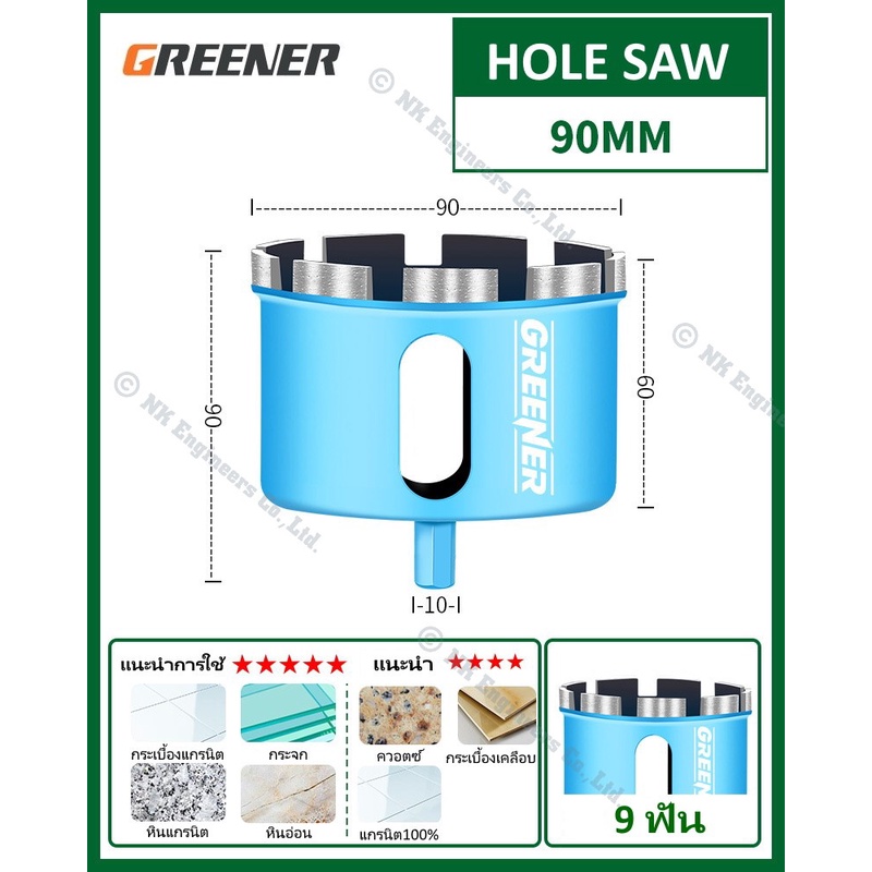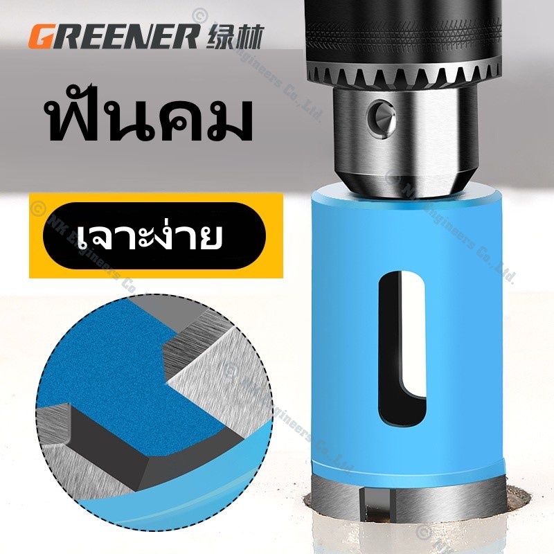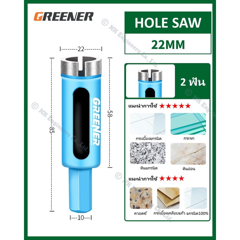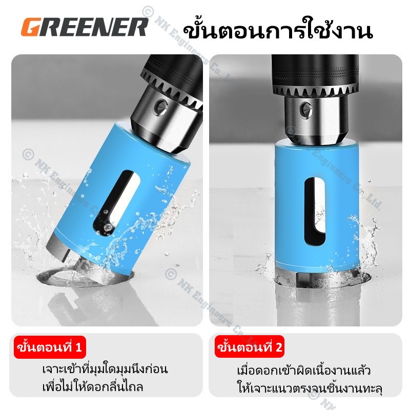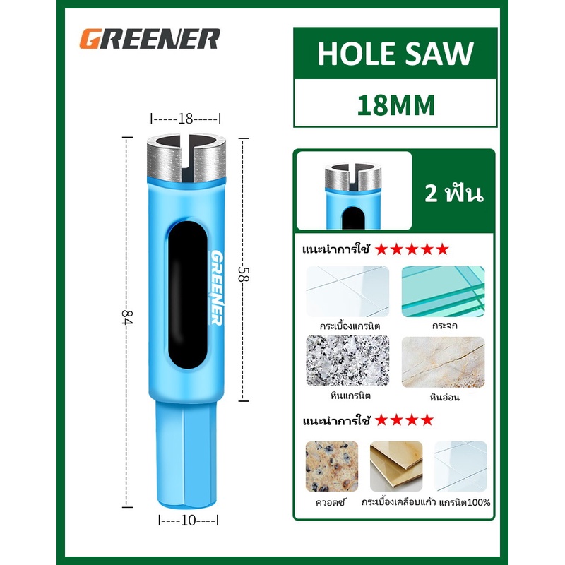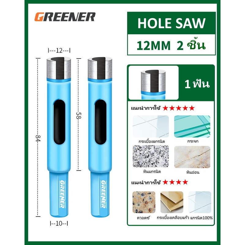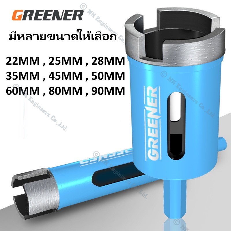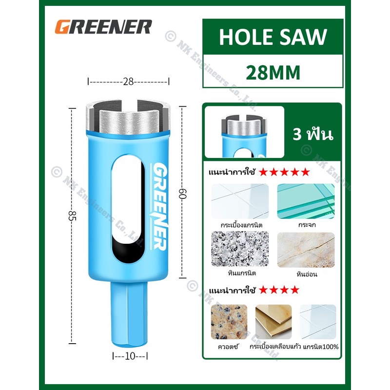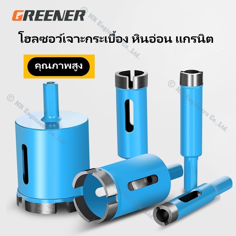 Hole Saw Greener โฮลซอว์สำหรับเจาะกระเบื้อง แกรนิต หินอ่อน กระจก เซรามิก อิฐ และอื่นๆ มีขนาด 22MM - 90MM