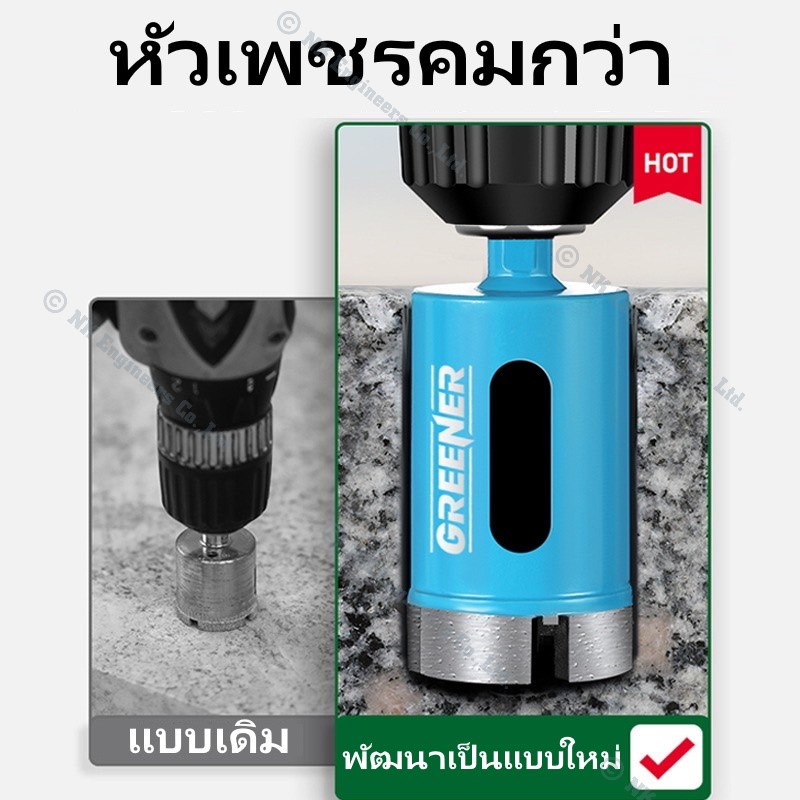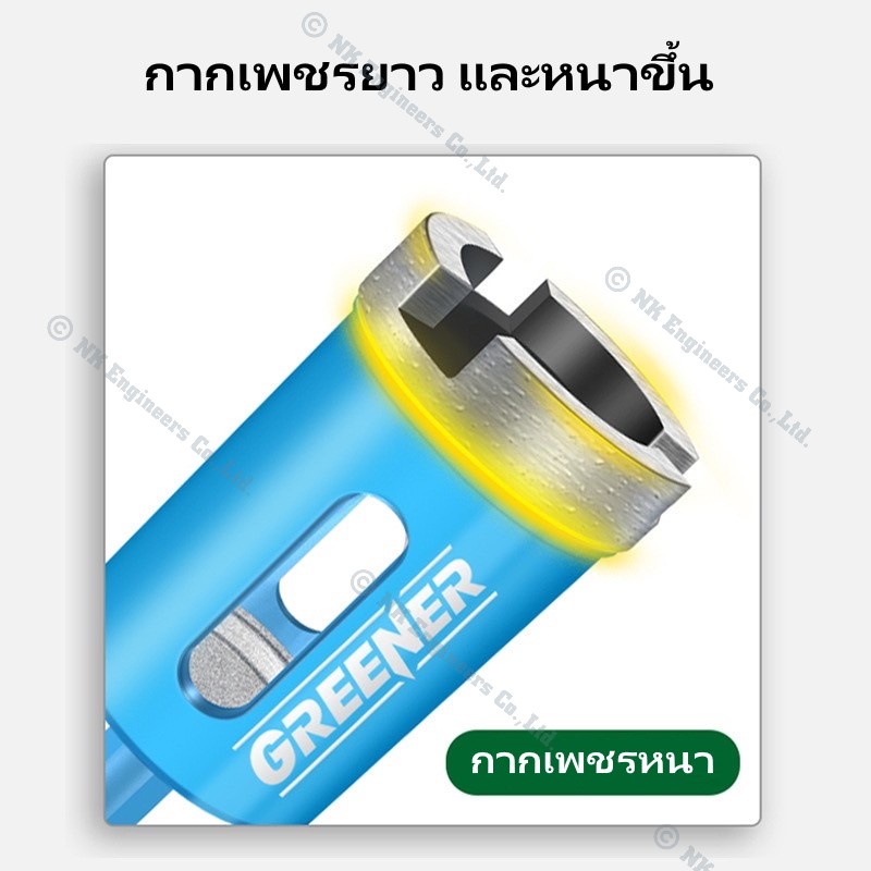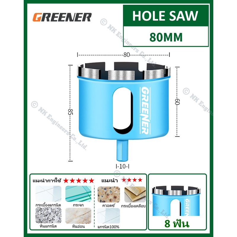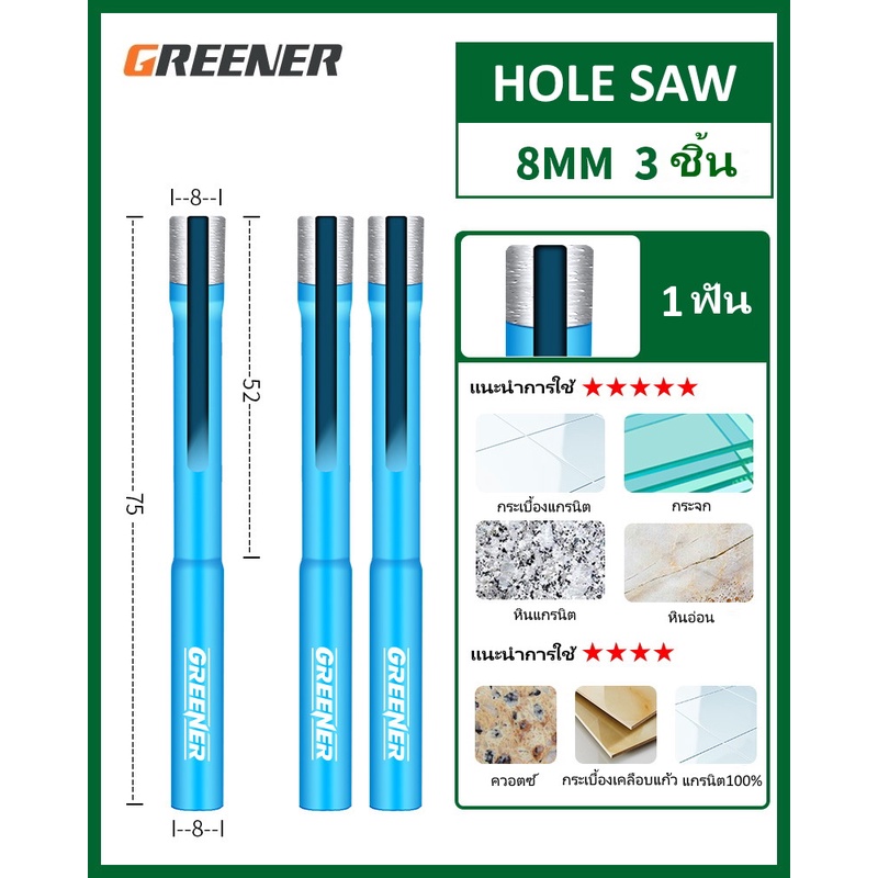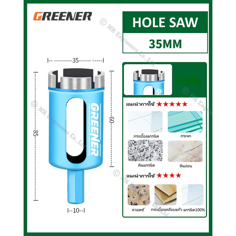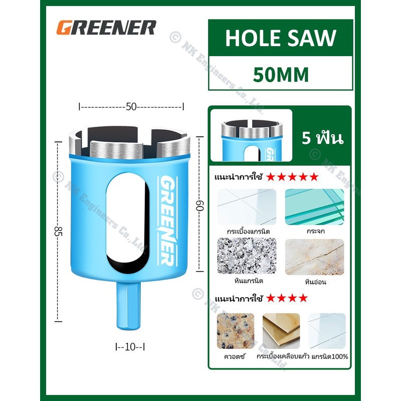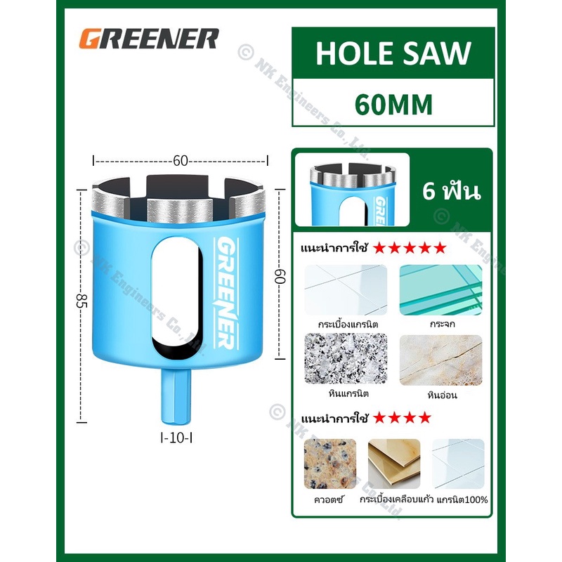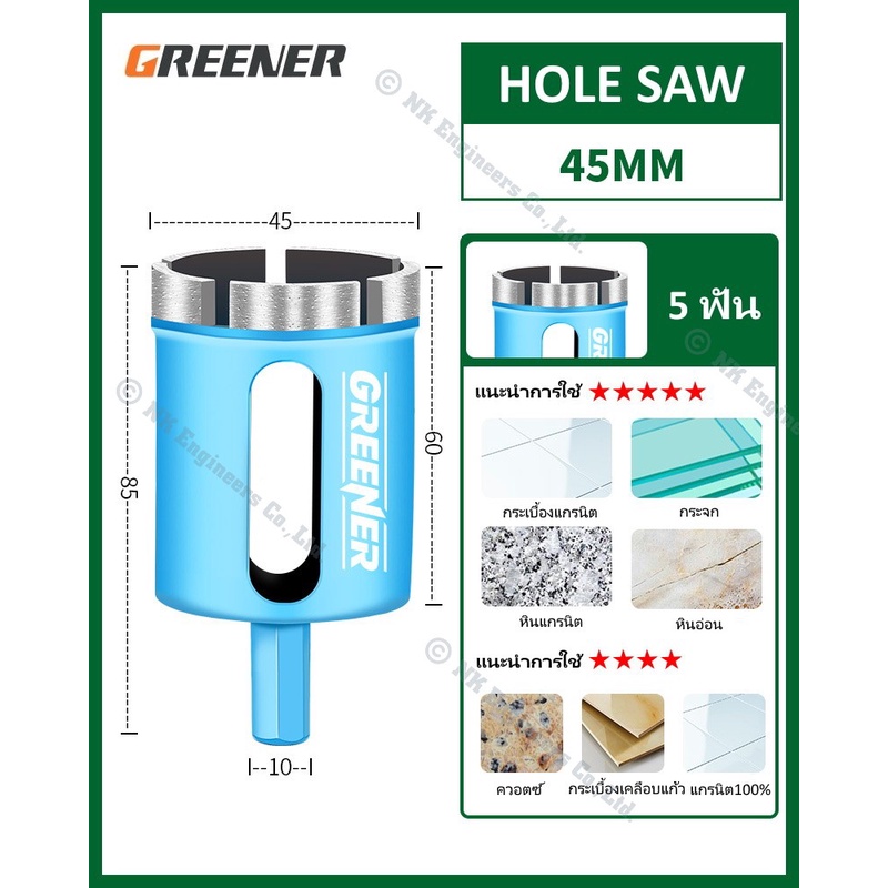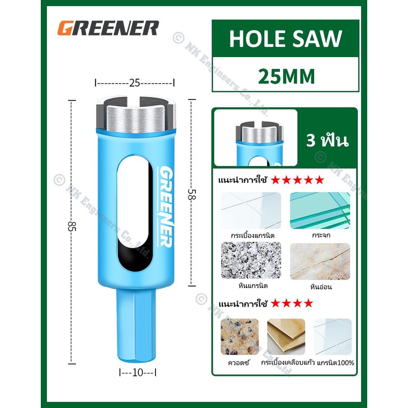 Hole Saw Greener โฮลซอว์สำหรับเจาะกระเบื้อง แกรนิต หินอ่อน กระจก เซรามิก อิฐ และอื่นๆ มีขนาด 22MM - 90MM