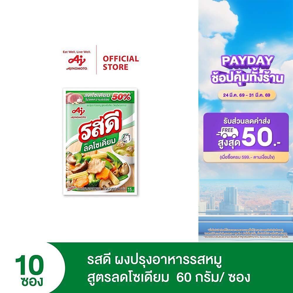 รสดีเมนูผงปรุงรสอาหารรสหมู สูตรลดโซเดียม 60 กรัม X10 ซอง