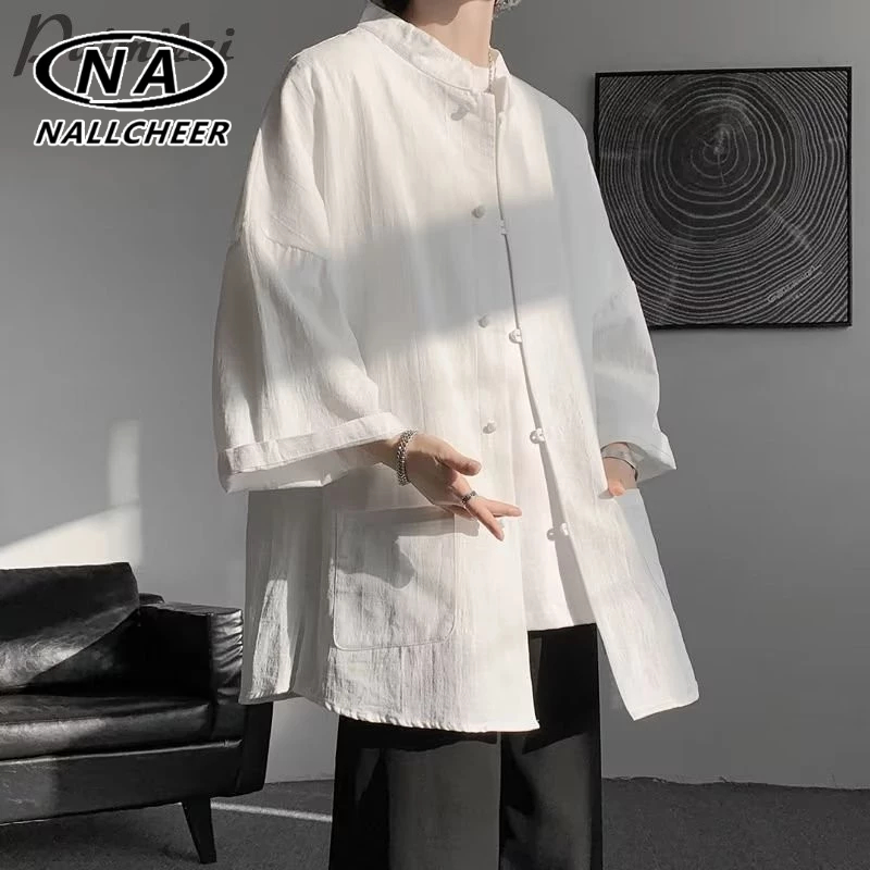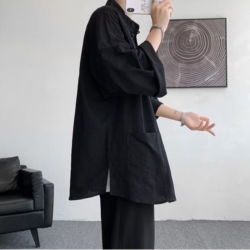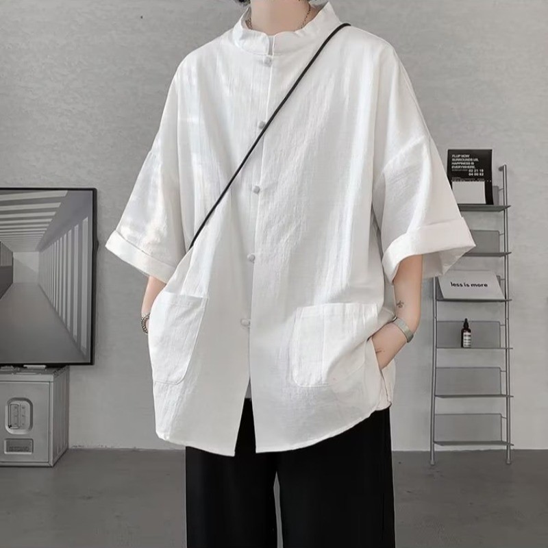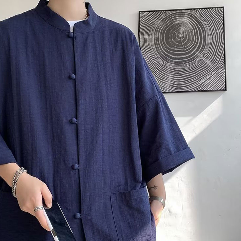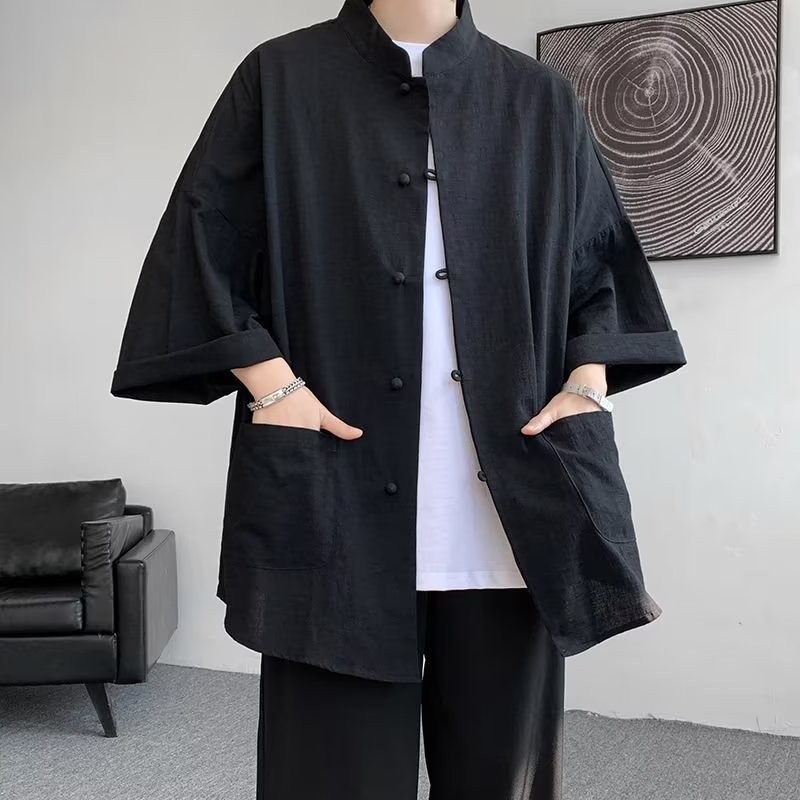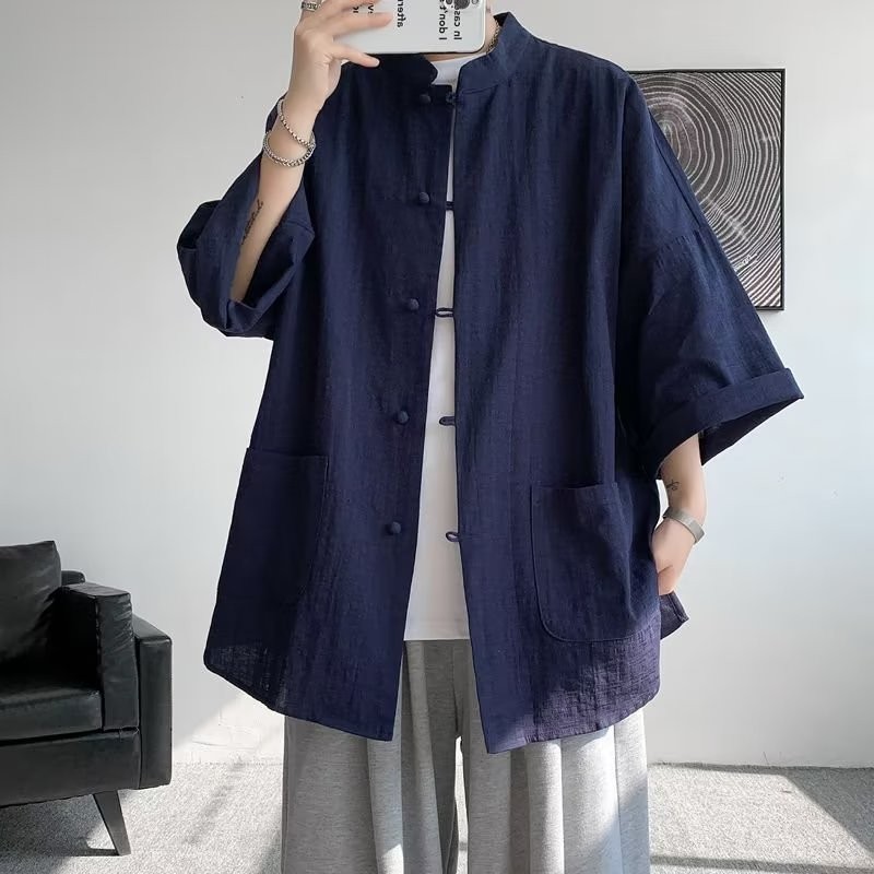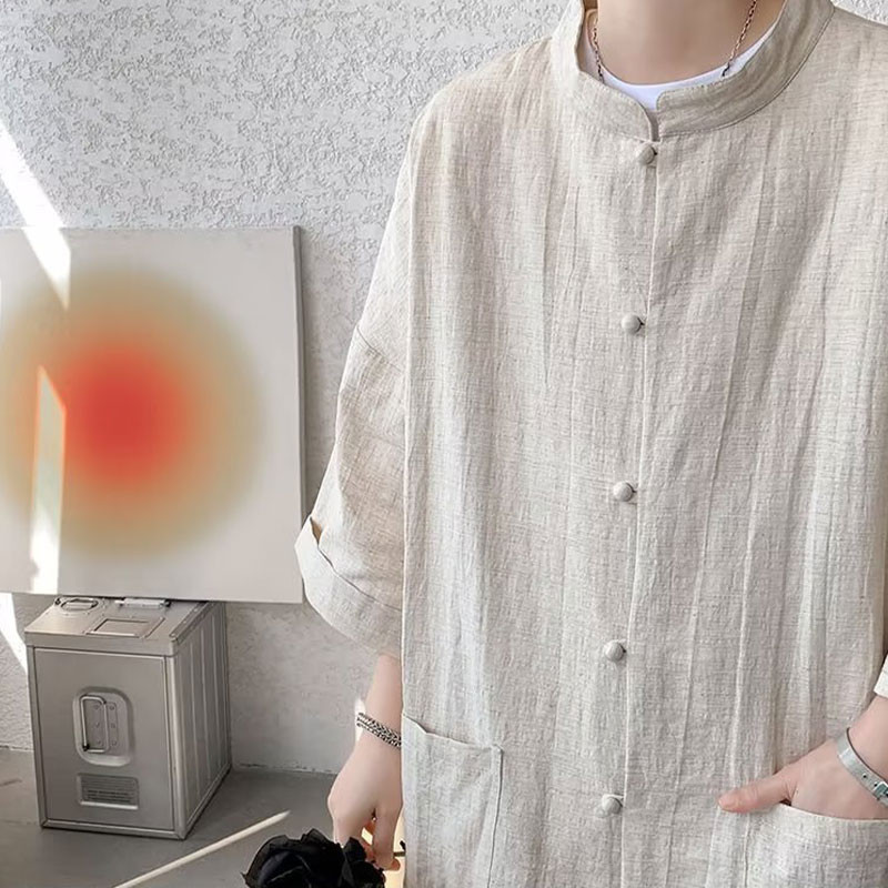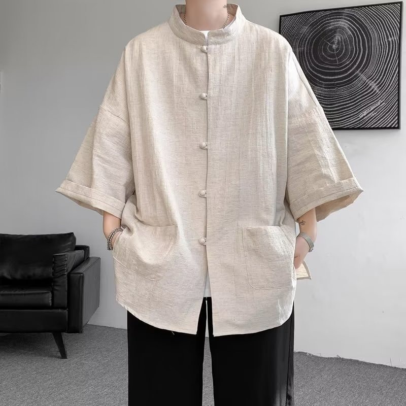 เสื้อเชิ้ตแขนสั้นผ้าลินินของผู้ชายสไตล์จีนใหม่ แจ็คเก็ตแขนยาว Hanfu สไตล์จีน
