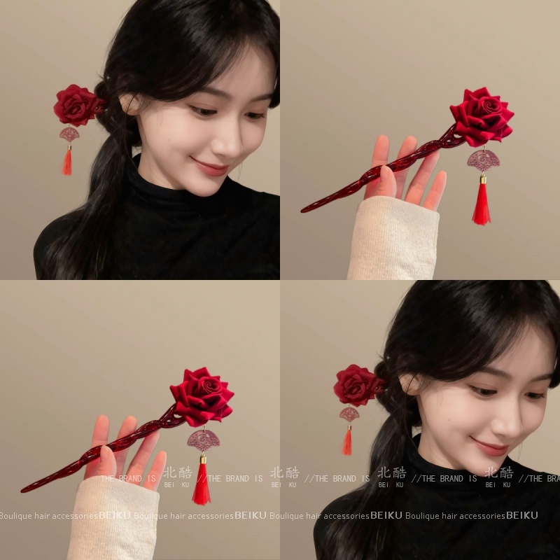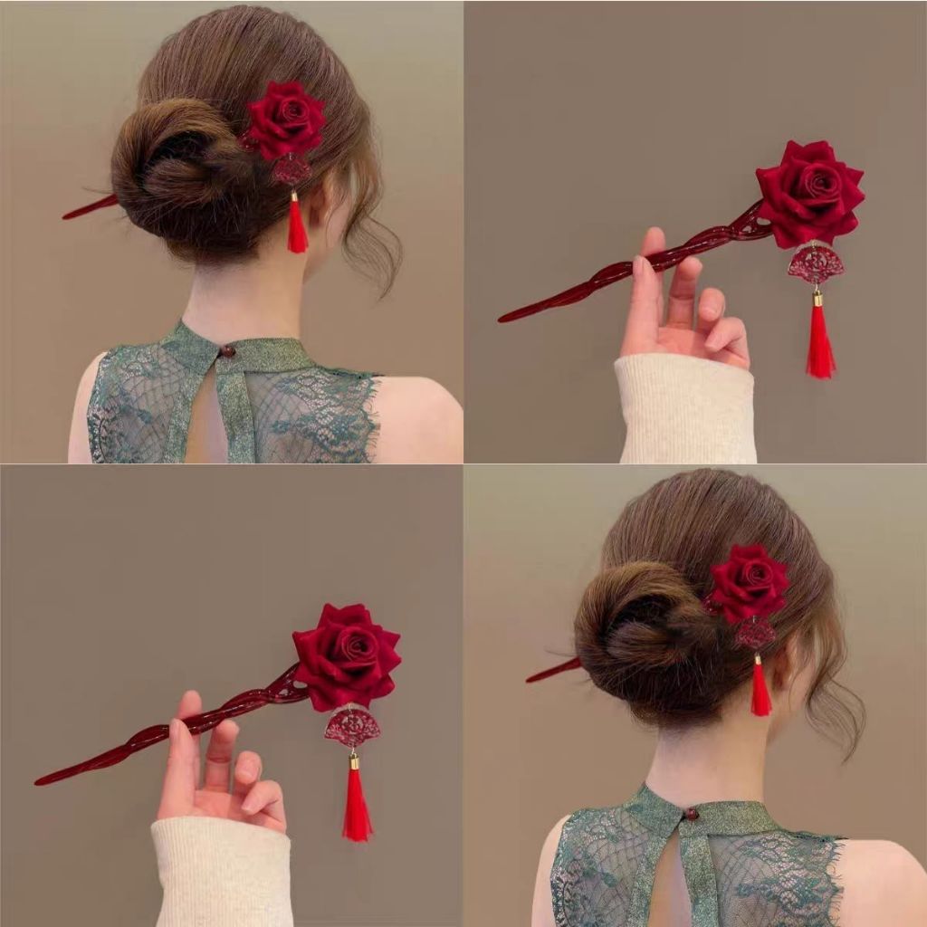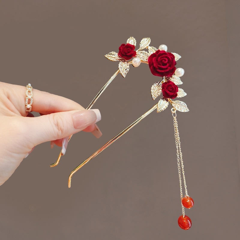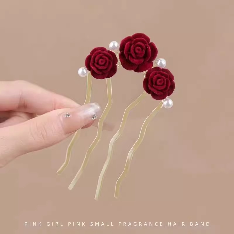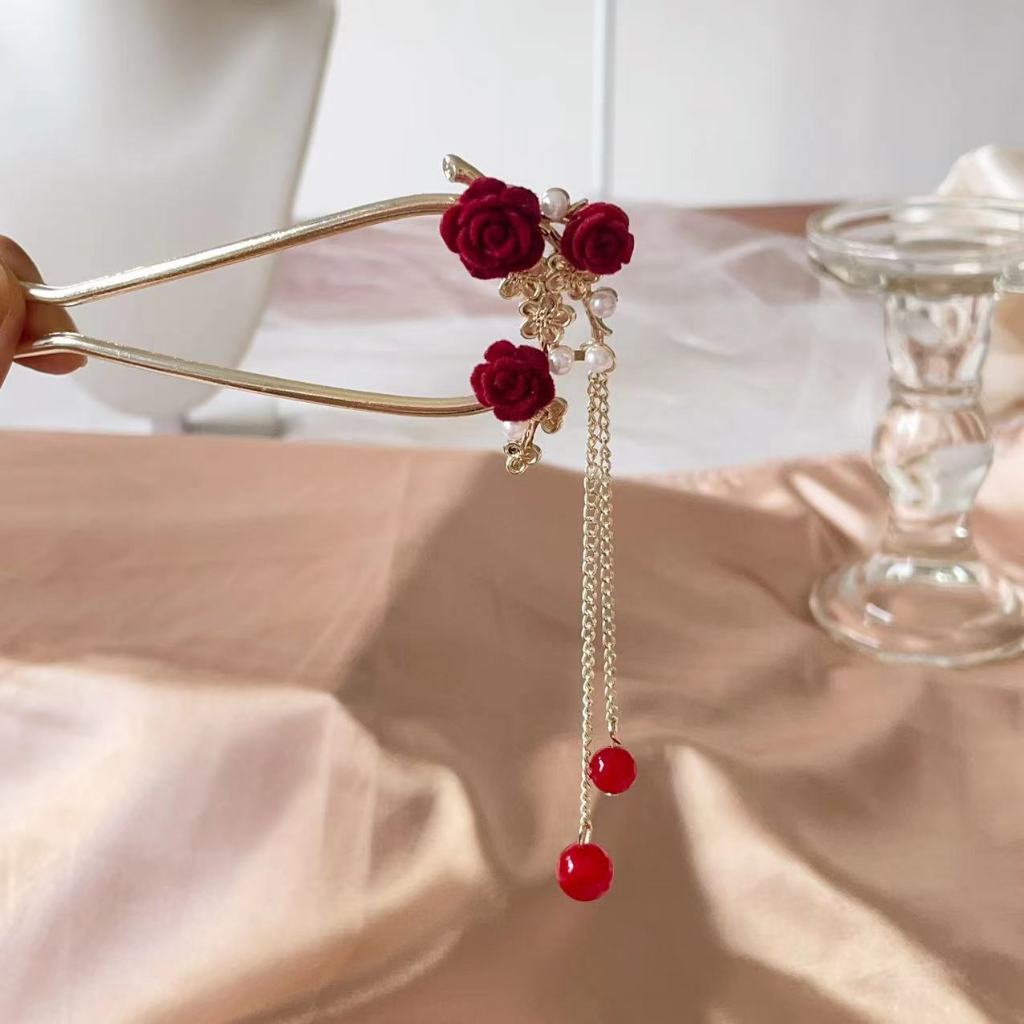 พู่กิ๊บและผ้าโพกศีรษะสไตล์ใหม่สำหรับผู้หญิง ตกแต่งด้วยกุหลาบสีแดง