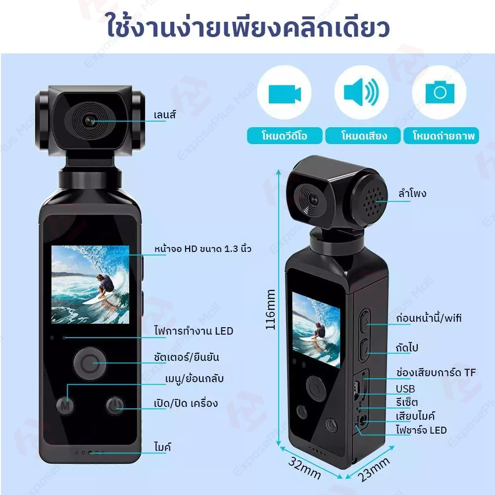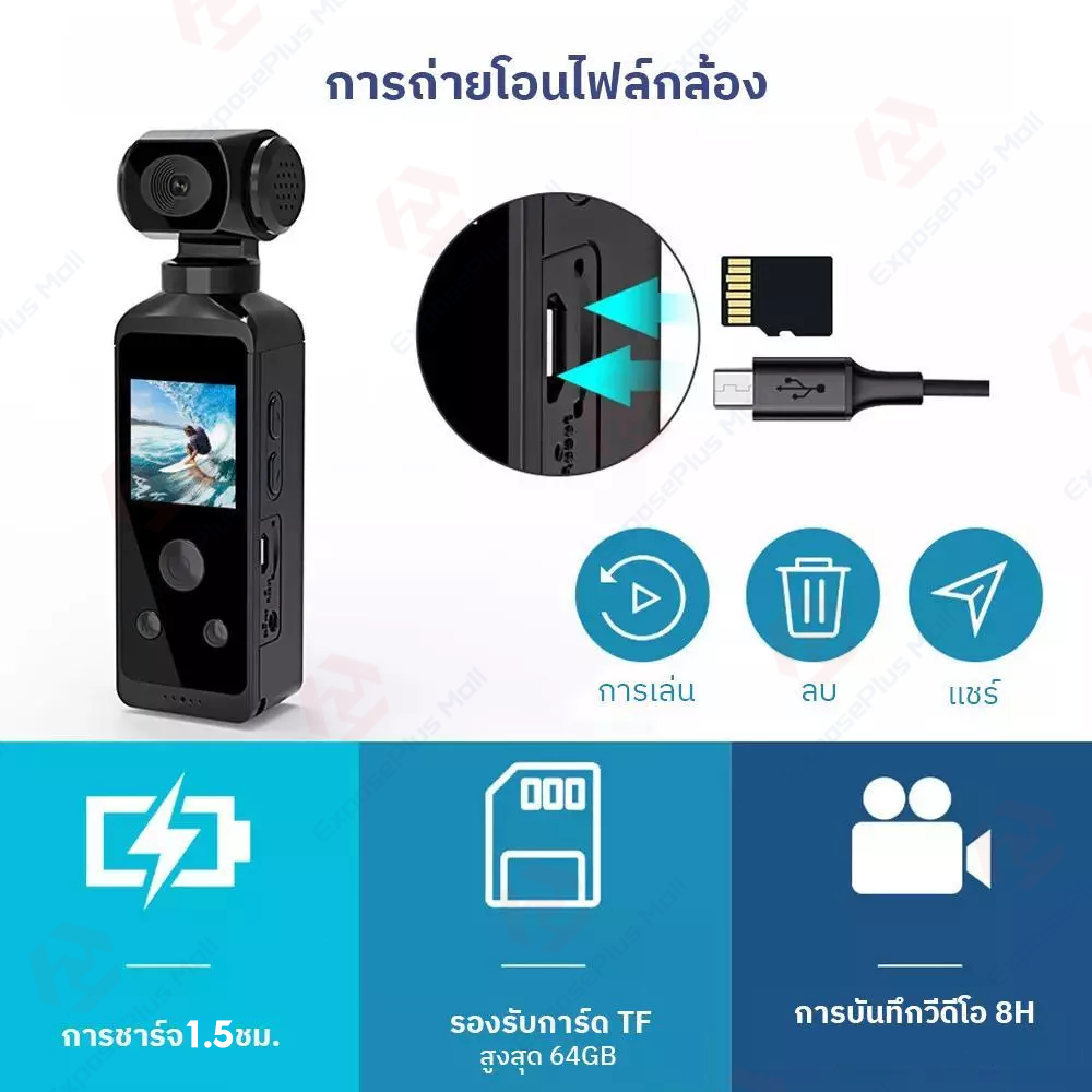 กันน้ำ💦 WiFi Pocket Gopro กล้องถ่ายรูปวีดีโอ 4K กล้องโกโปร กันน้ำกันสั่น หมุนได้ 270°กล้องติดตัว