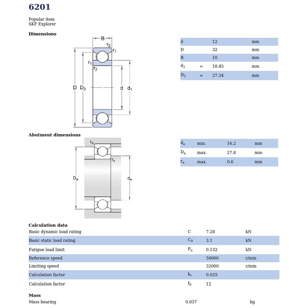 6201 SKF ตลับลูกปืนเม็ดกลมล่องลึก ฝาเปิด 6201 (12mm x 32mm x 10mm)