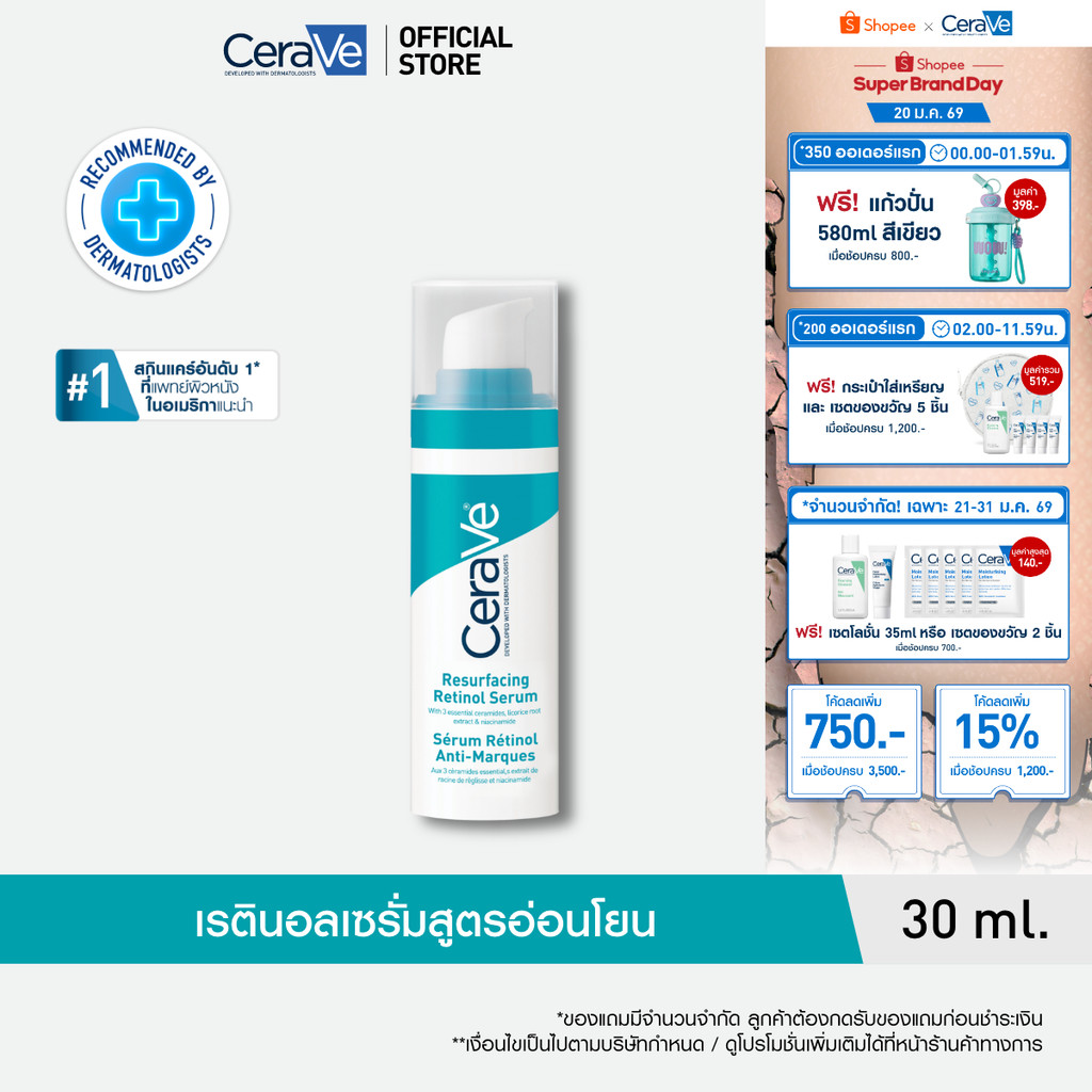 เซราวี CERAVE Resurfacing Retinol Serum เรตินอลเซรั่ม 30ml. ผลิตภัณฑ์บำรุงผิวหน้าสำหรับผู้มีปัญหารอยดำรอยสิว