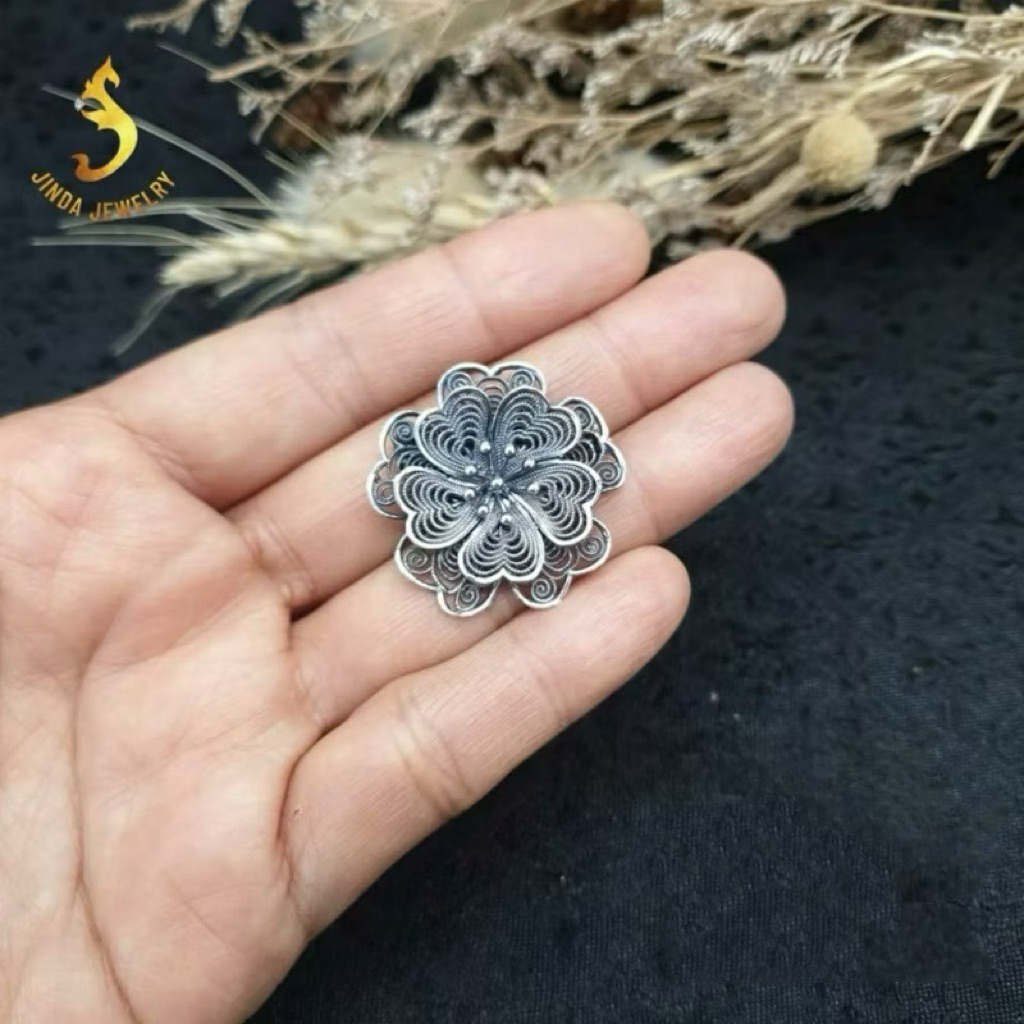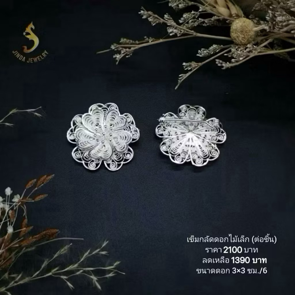 (JindaJewelry)เข็มกลัดดอกไม้เกลียวฉลุเงินแท้92.5%
