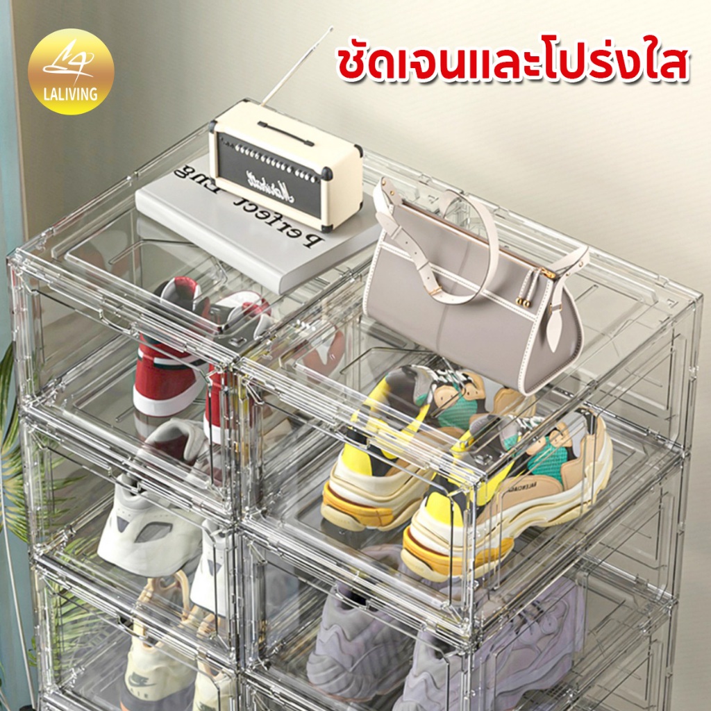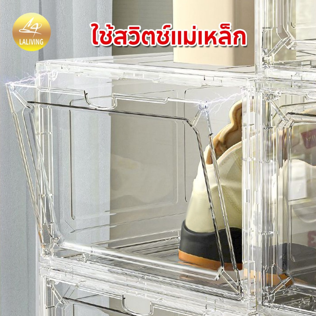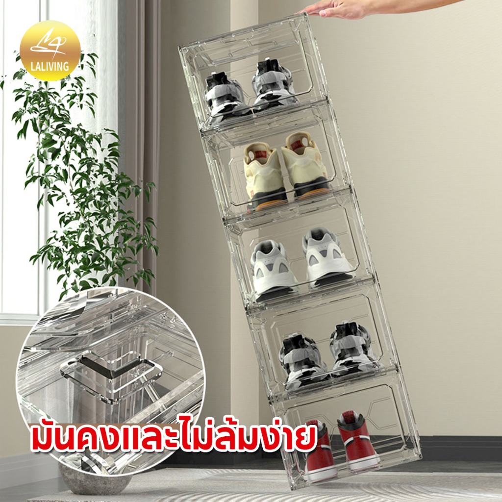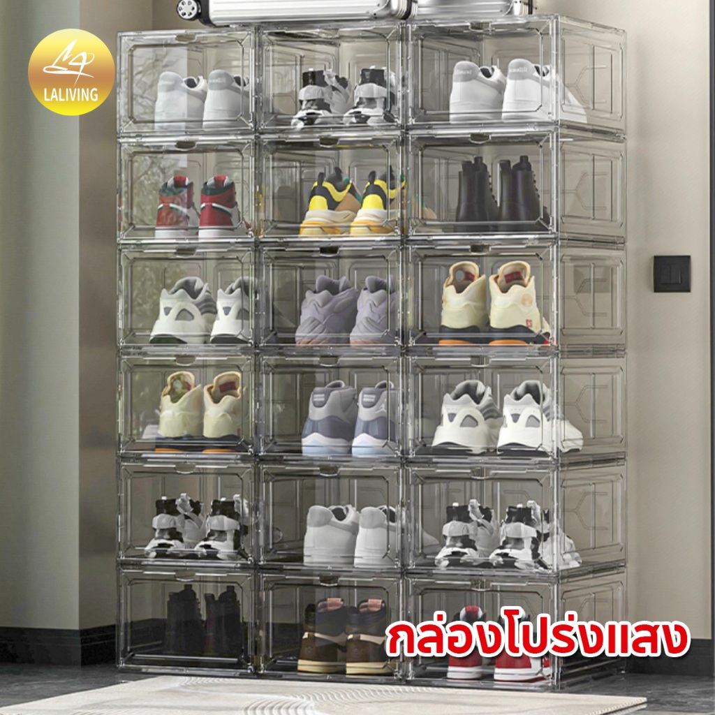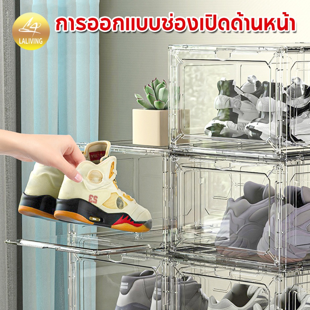 LA กล่องใส่รองเท้าพลาสติกแข็ง วัสดุแบบอะคริลิคใส tower shoe box ออกแบบฝาหน้าแม่เหล็ก เก็บวางรองเท้า