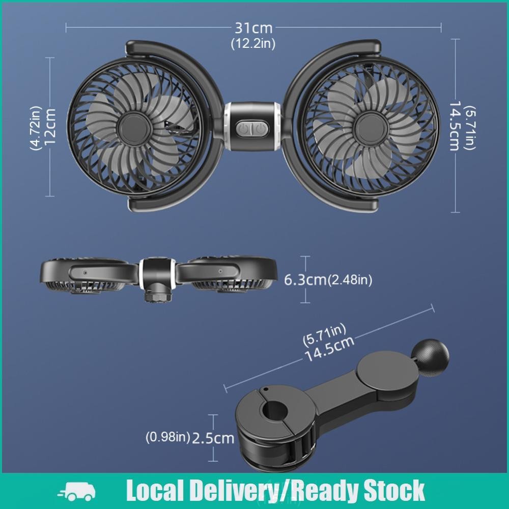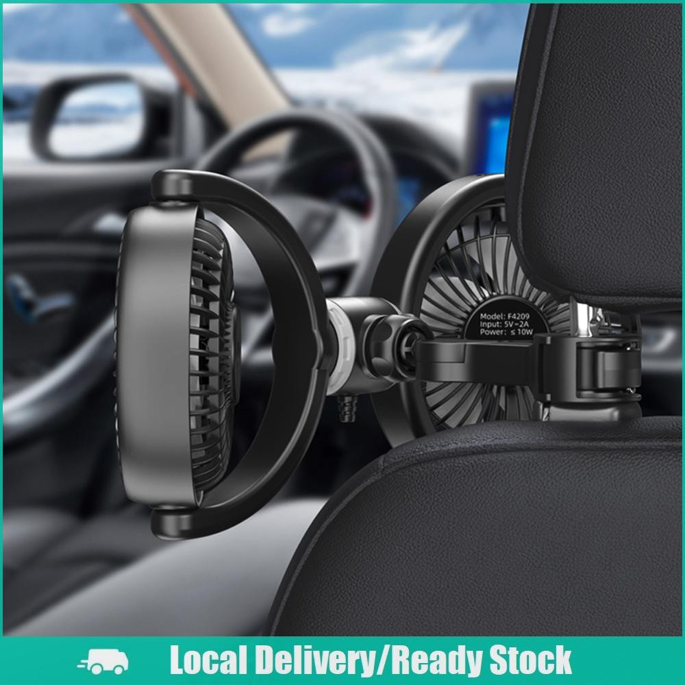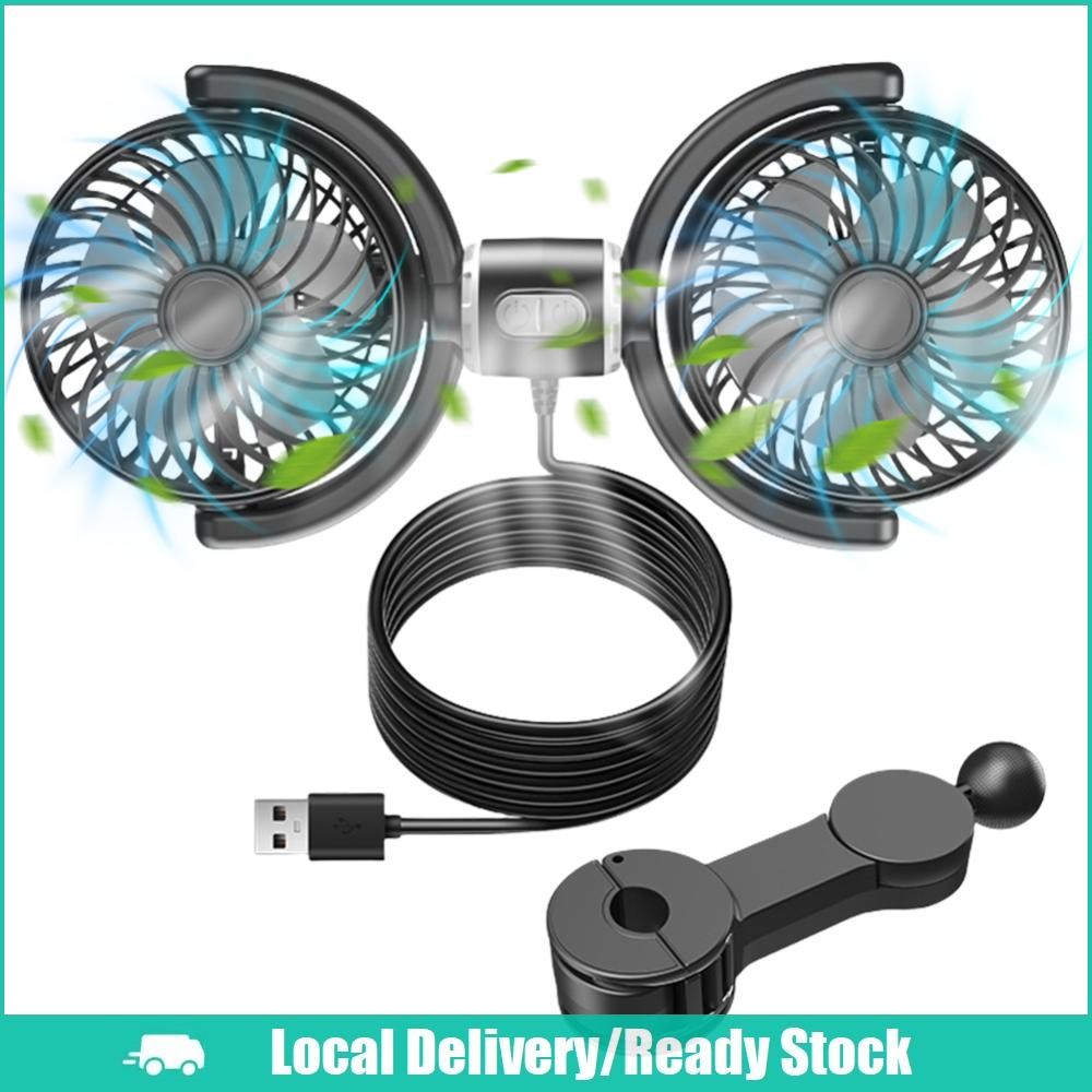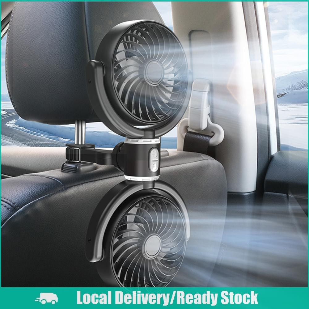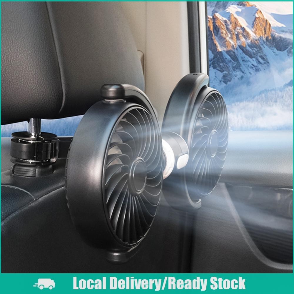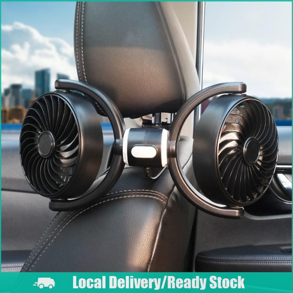 [จัดส่งในพื้นที่] 12V/24V รถที่นั่งกลับพัดลมระบายความร้อน USB ชาร์จอัตโนมัติพนักพิงศีรษะระบายอากาศพัดลมสองหัวไฟฟ้ารถยนต์พัดลมระบายความร้อน 360 องศาหมุนสำห