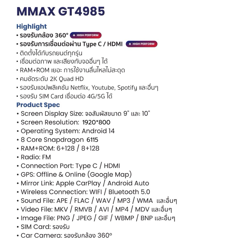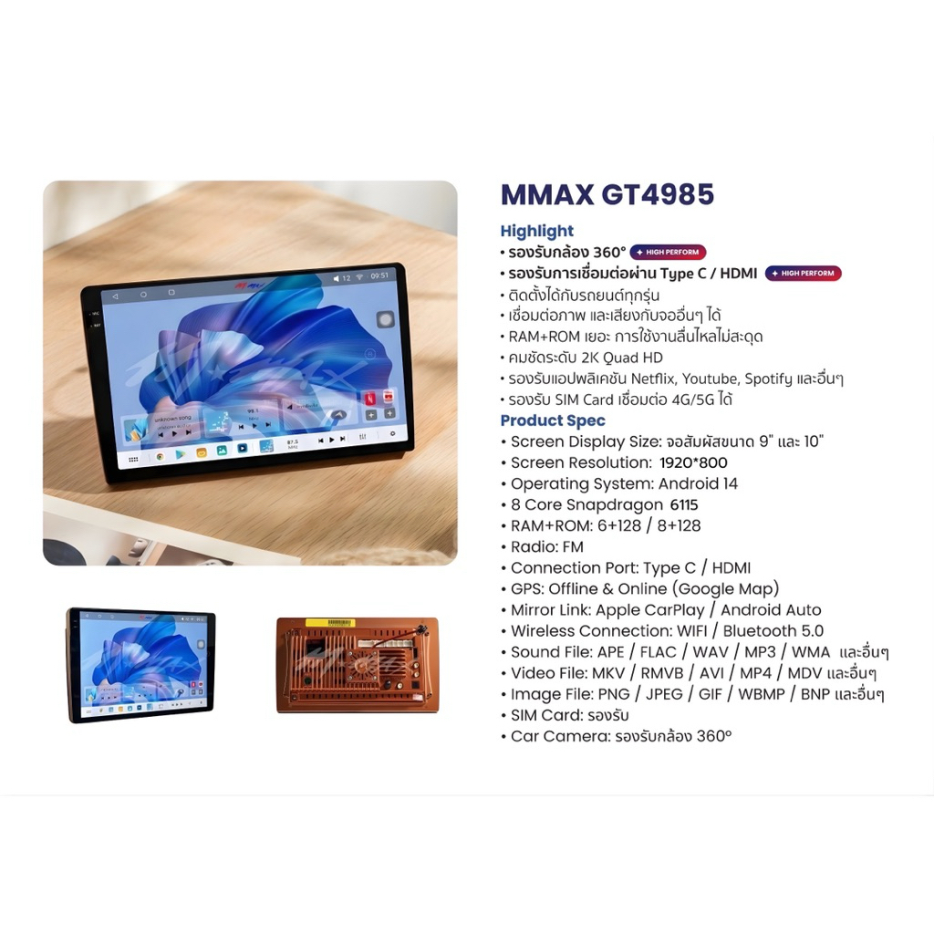 จอแอนดรอย MMAX GT-4985 แรม 8 รอม128 ใส่ซิมได้ รองรับกล้องรอบคัน ขนาด 9“ และ 10”