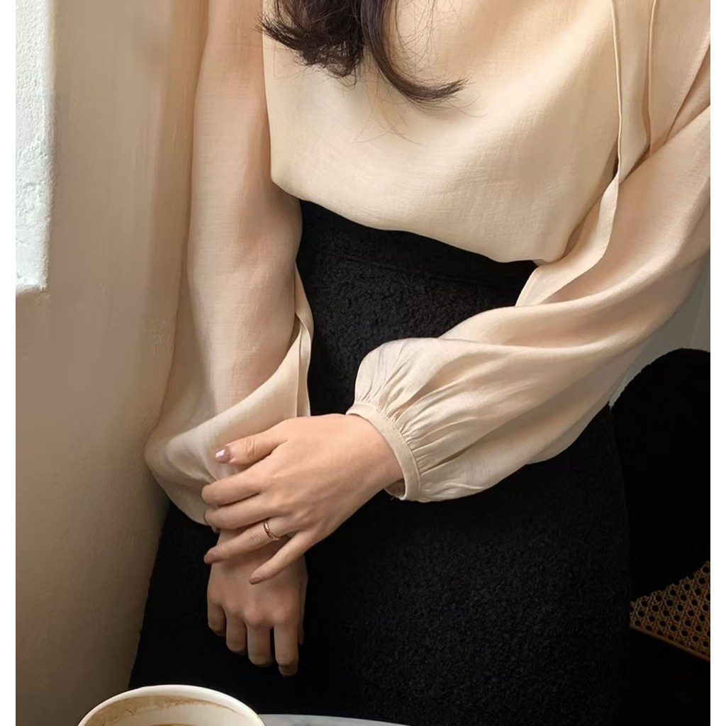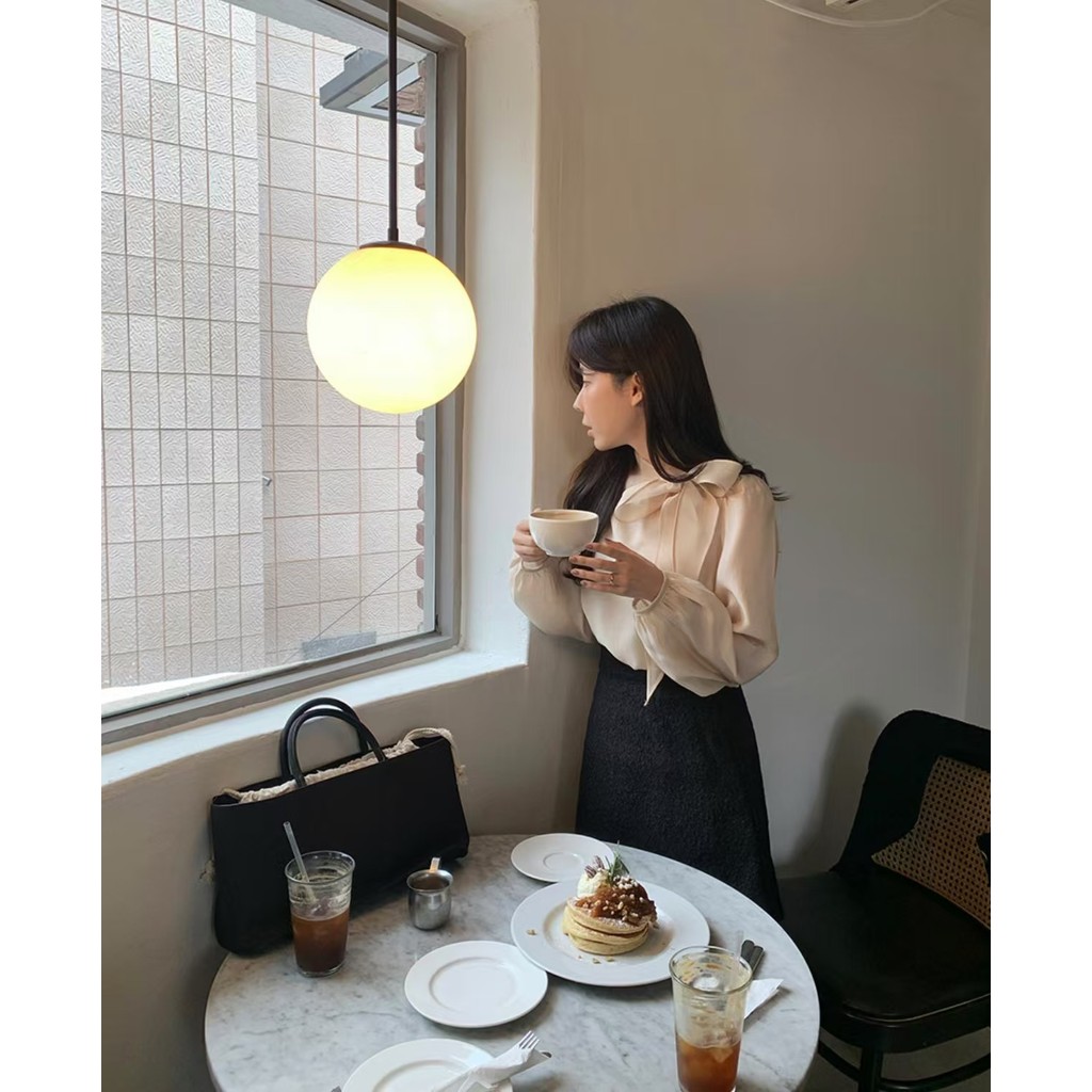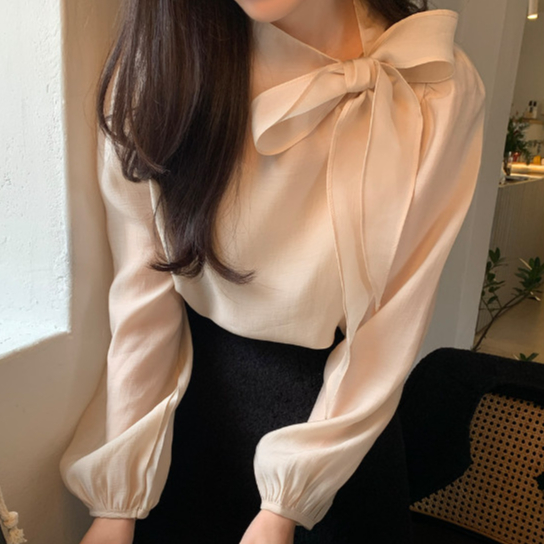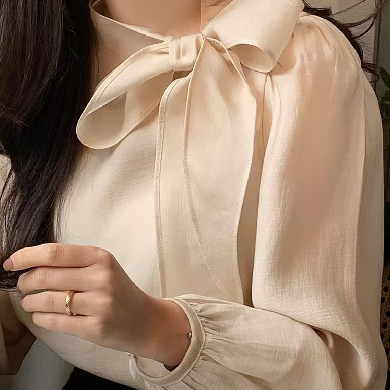 เสื้อเชิ้ตแขนยาวสไตล์เกาหลีใหม่สำหรับฤดูใบไม้ผลิ ผูกโบว์แบบฝรั่งเศส ระบายอากาศได้ดี