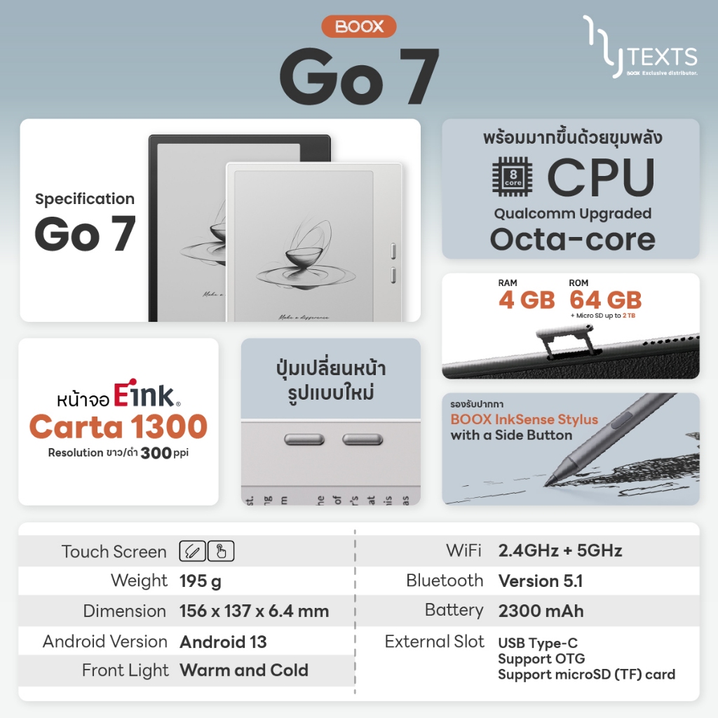 (Pre-Order) สีขาวจัดส่ง 20 เม.ย. E-Reader BOOX GO7 Carta1300 ความคมชัด 300ppi RAM 4GB+ROM 64GB CPU Octa-core
