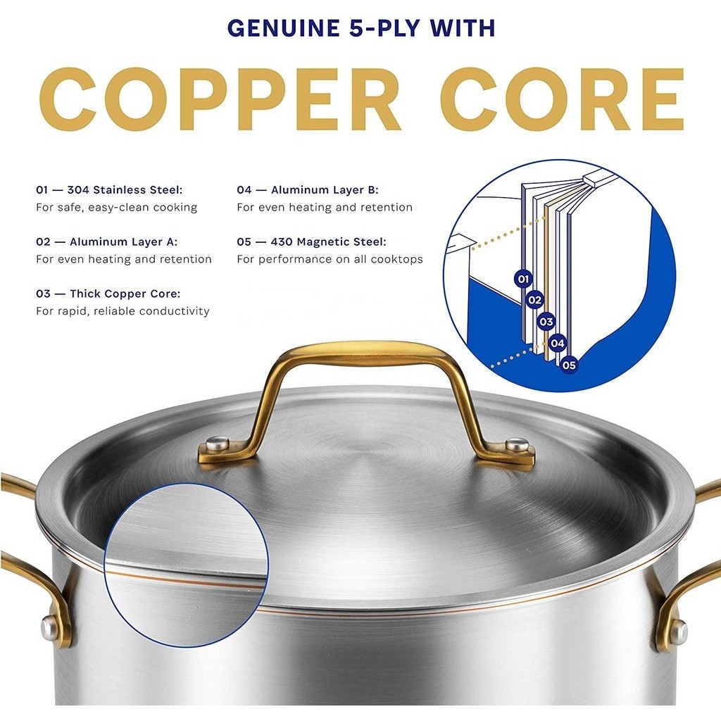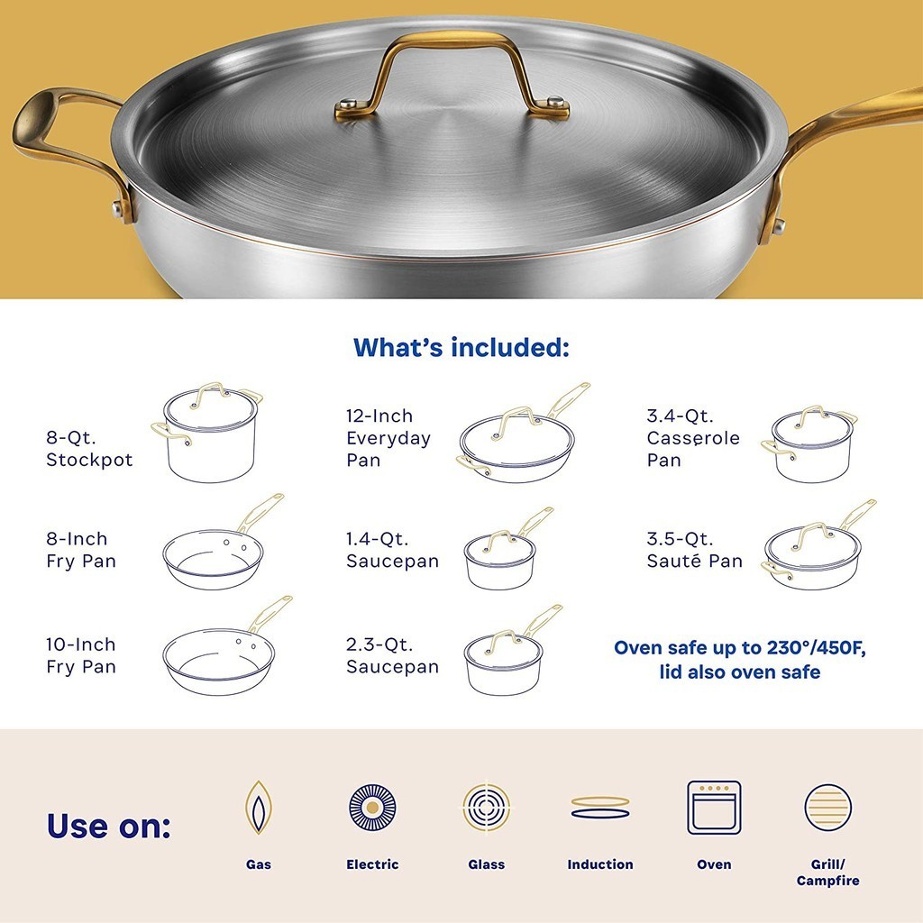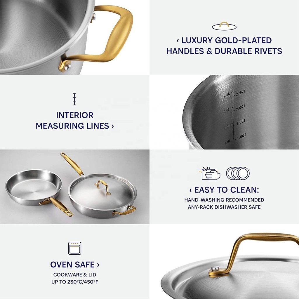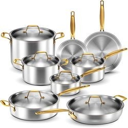 Oven Safe 14 Piece 5-Ply Stainless Steel Cookware Pots and Pan Set With Gold Plated Handle
