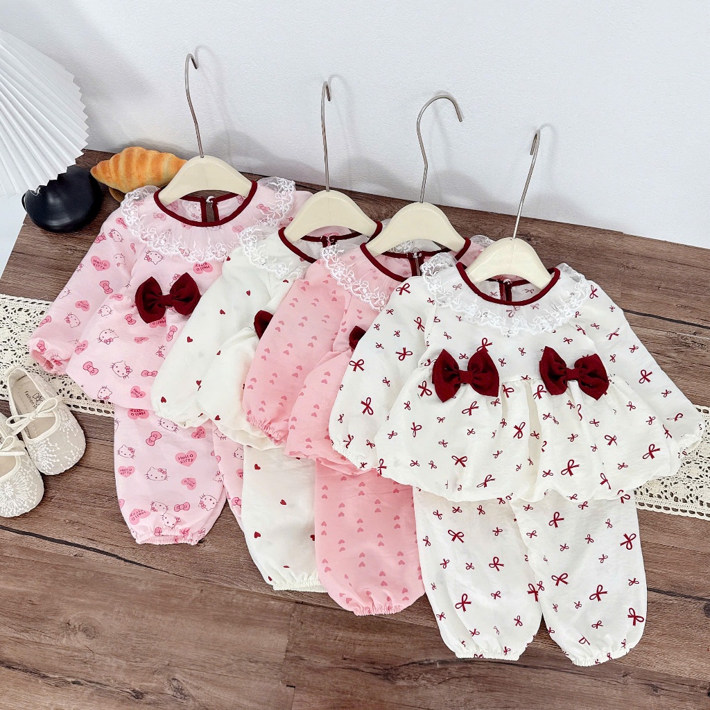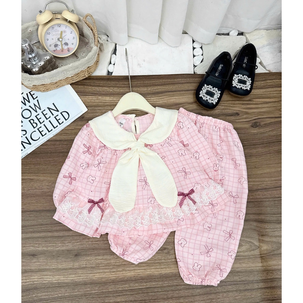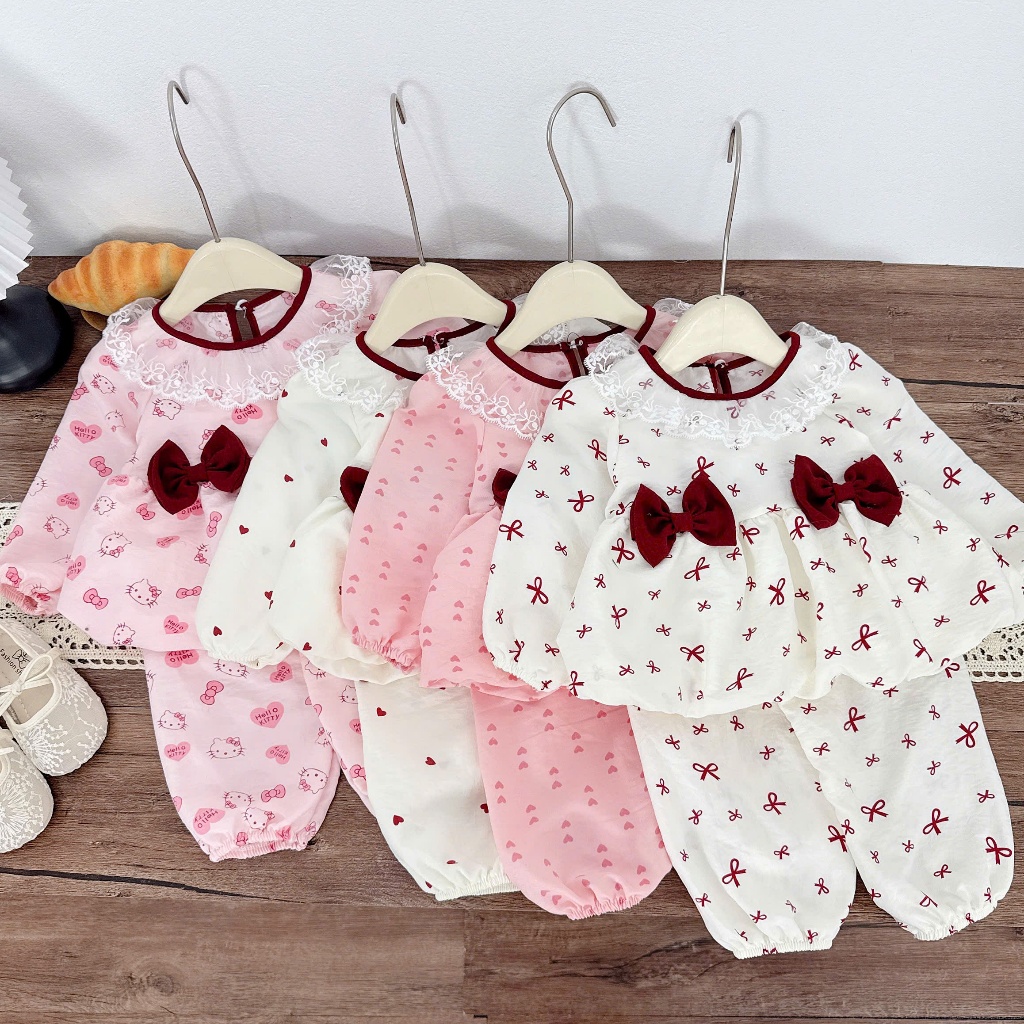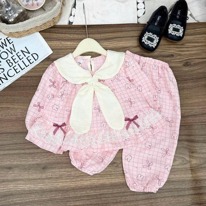 ชุดชุดนอนแขนยาวคอปกระบายและโบว์สําหรับเด็กอายุตั้งแต่ 1 ปีถึง 5 ปี