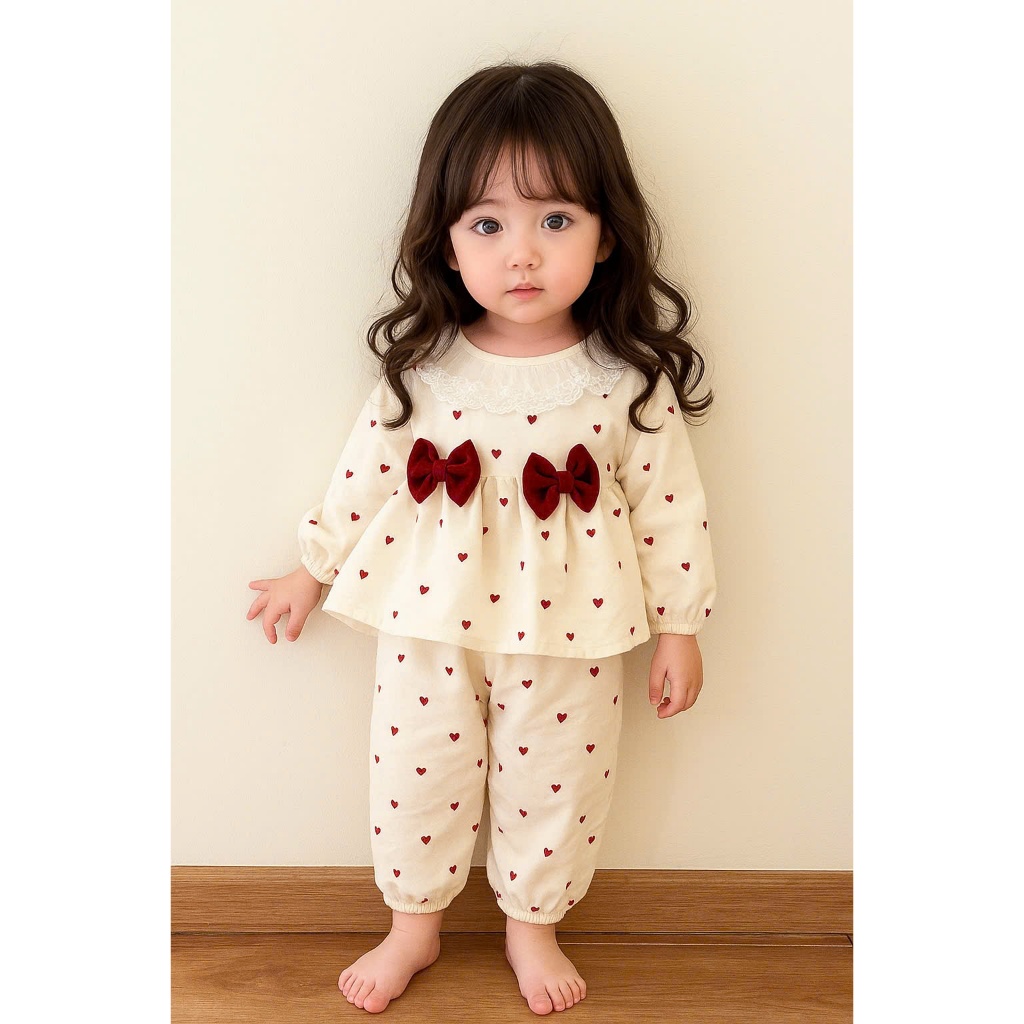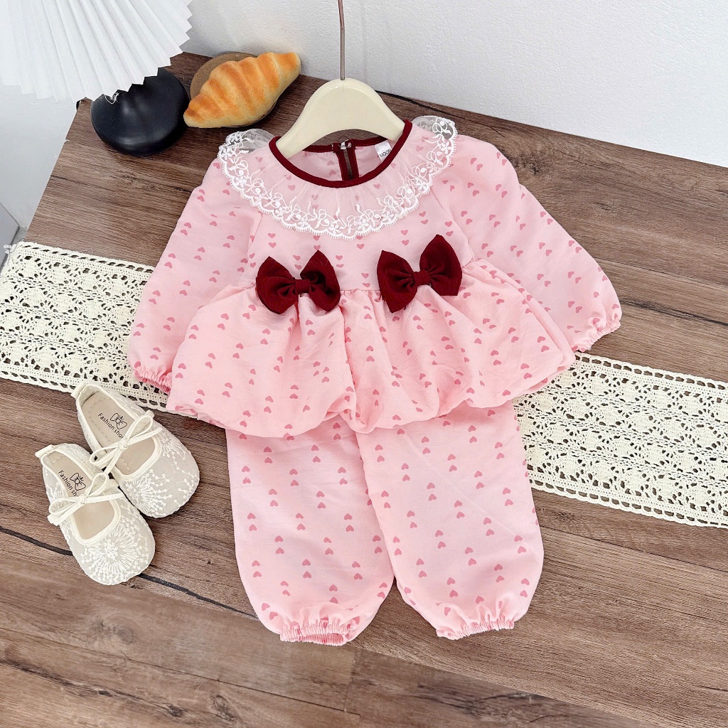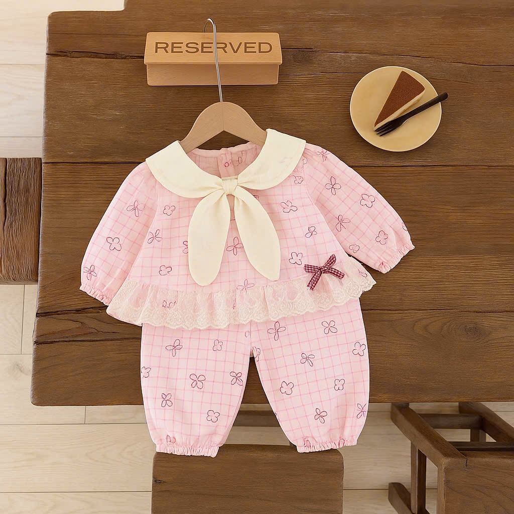 ชุดชุดนอนแขนยาวคอปกระบายและโบว์สําหรับเด็กอายุตั้งแต่ 1 ปีถึง 5 ปี