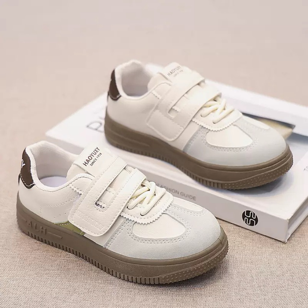 รองเท้าผ้าใบ AHL พร้อมสาย Velcro สีขาวและน้ําเงินครีม – รองเท้าหนังนุ่มสบาย – พื้นยางทนทาน – ขนาด 26–36