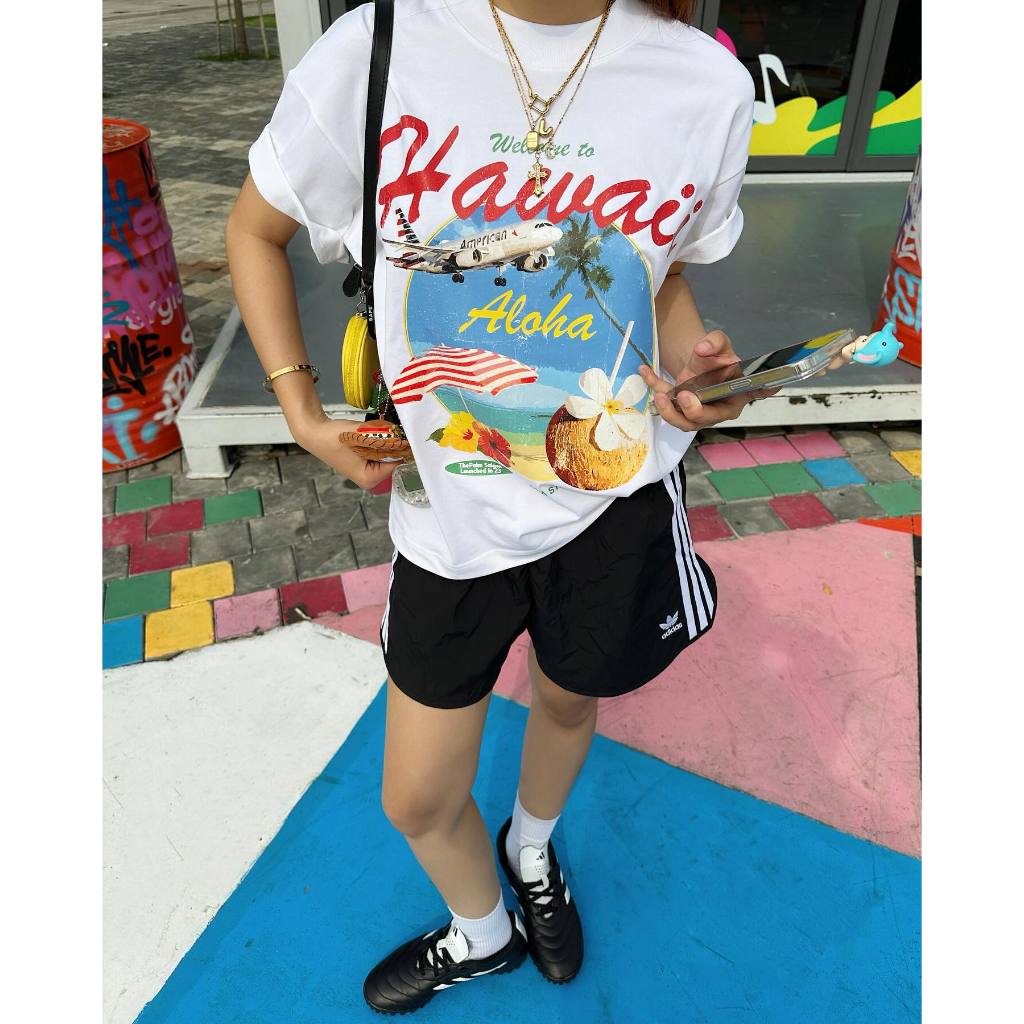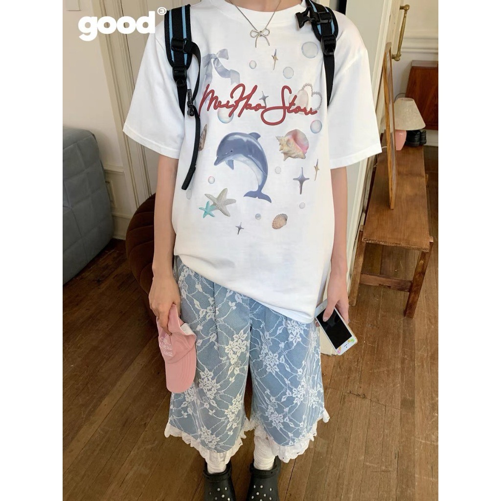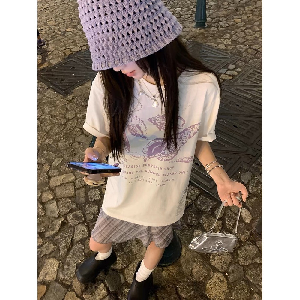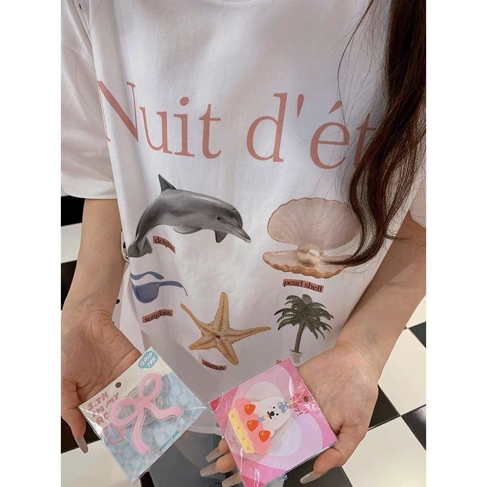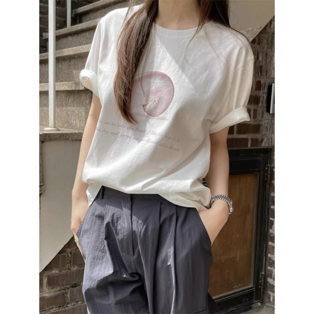 (จัดส่งตลอด 24 ชั่วโมง) เสื้อยืดสตรีทไฮสตรีทสีขาวแขนสั้นผู้หญิงเสื้อคอกลมทรงหลวมสไตล์ฮ่องกงชิคๆแบบใหม่ฤดูร้อน