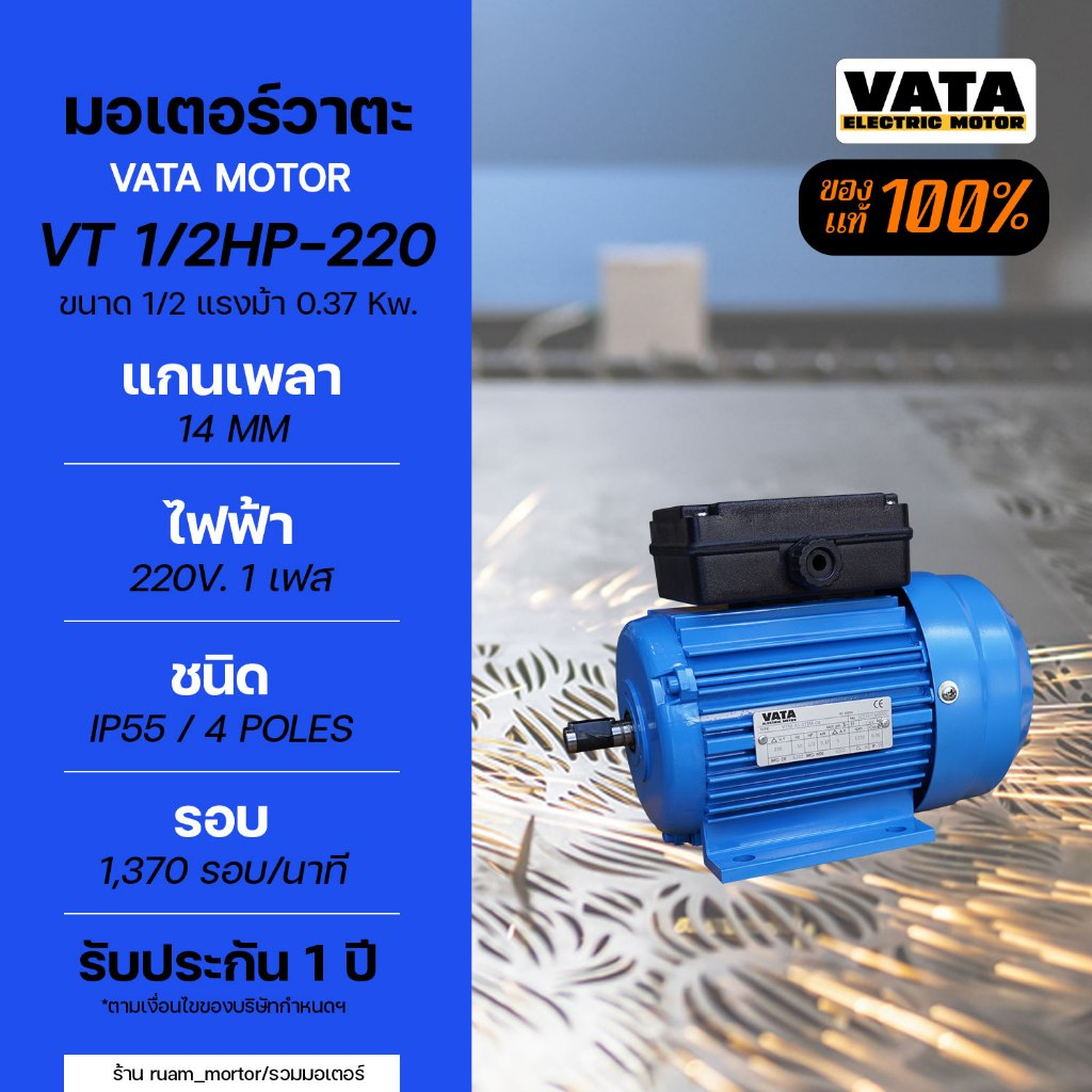 มอเตอร์ไฟฟ้า VATA รุ่น VT 1/2HP ขนาด 1/2 แรงม้า 4P แกนเพลา 14 มม. ไฟฟ้า 1 เฟส 220V. มีของพร้อมส่ง
