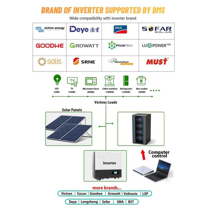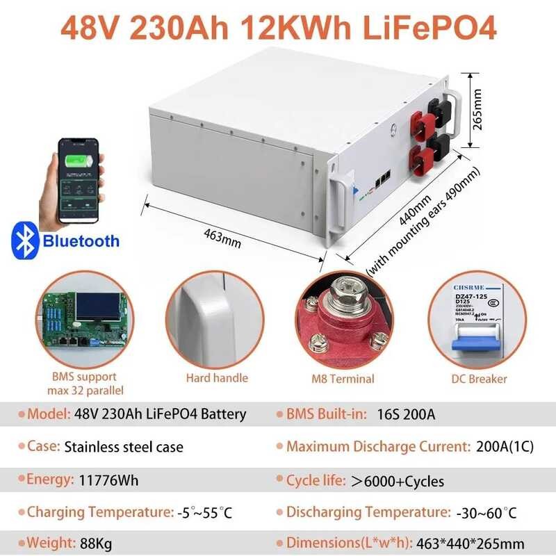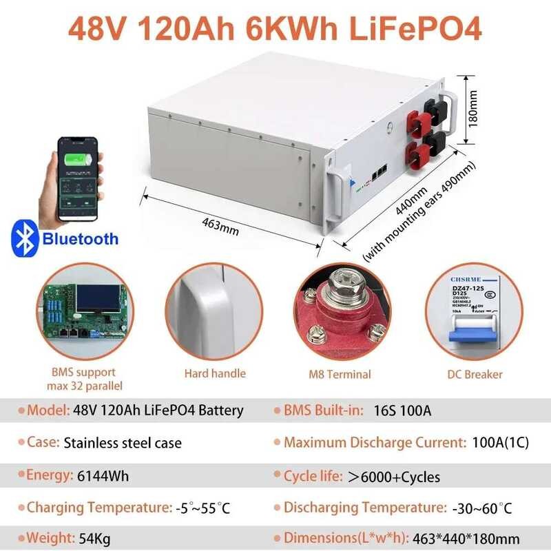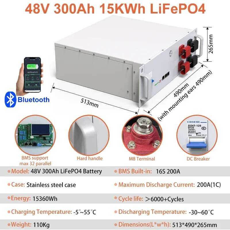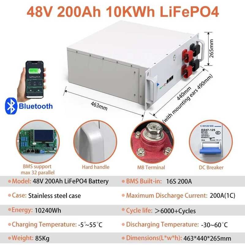 แบตเตอรี่ลิเธียม 48V LiFePO4 100AH 150AH 200AH 51.2V 7.6KW 6000+ รอบ พร้อม Bluetooth BMS สำหรับพลังงานแสงอาทิตย์
