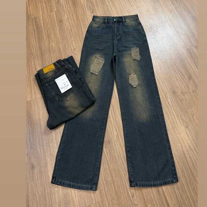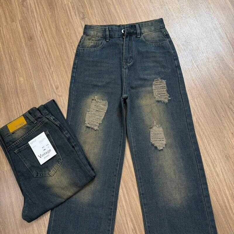 กางเกงยีนส์ทรงกระบอก แต่งขาด สีสนิม ป้ายvintage รหัส6068