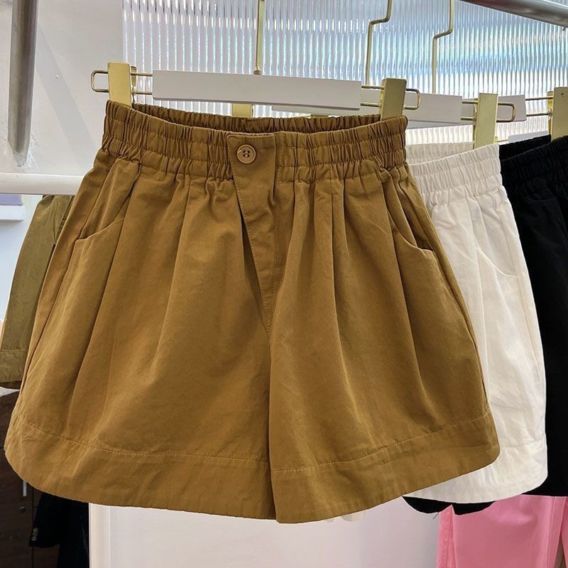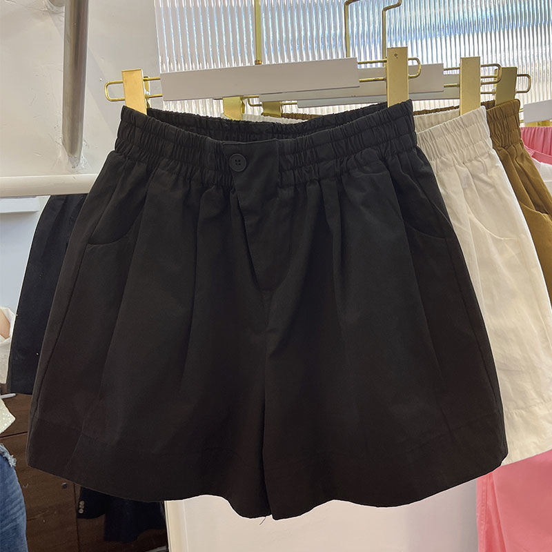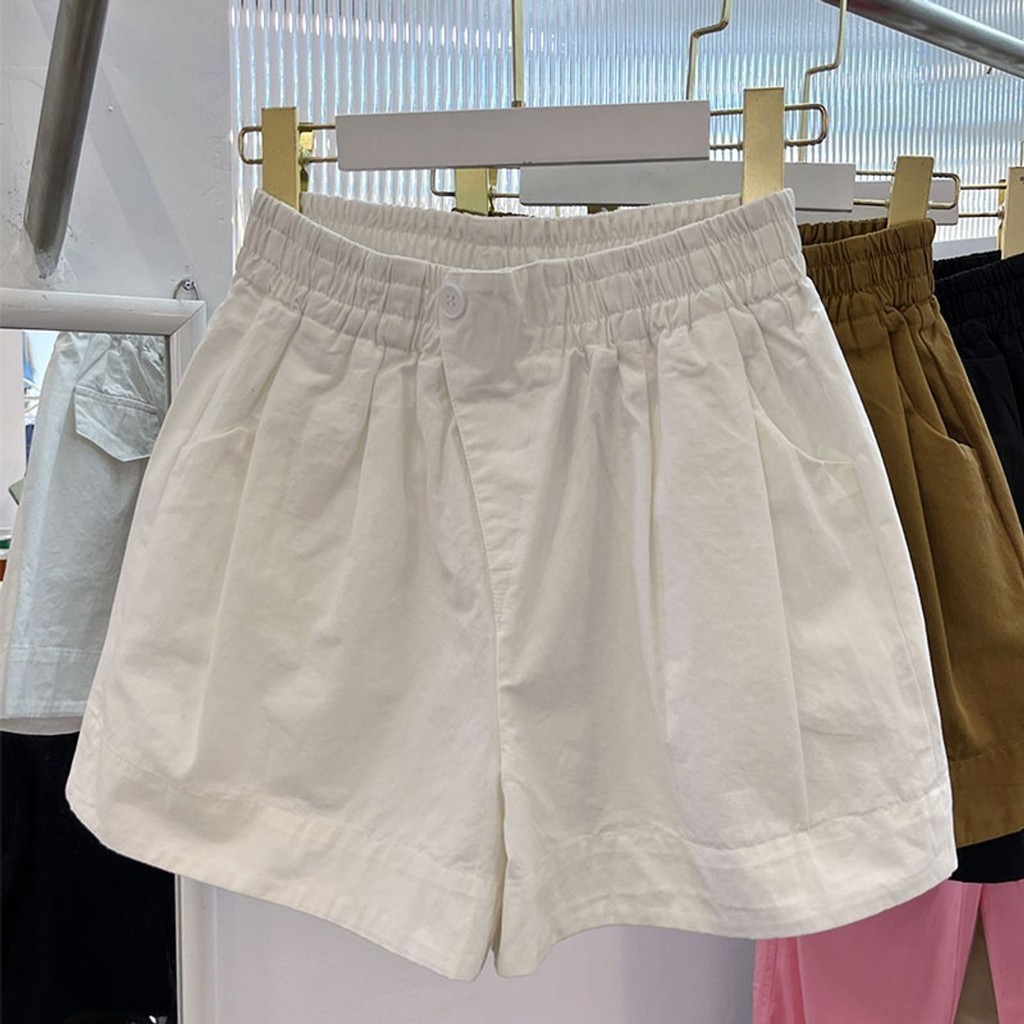 สุภาพสตรีฤดูร้อนสีทึบหลวมสบายๆเอวสูงเอวยางยืดกางเกงขาสั้นขากว้าง
