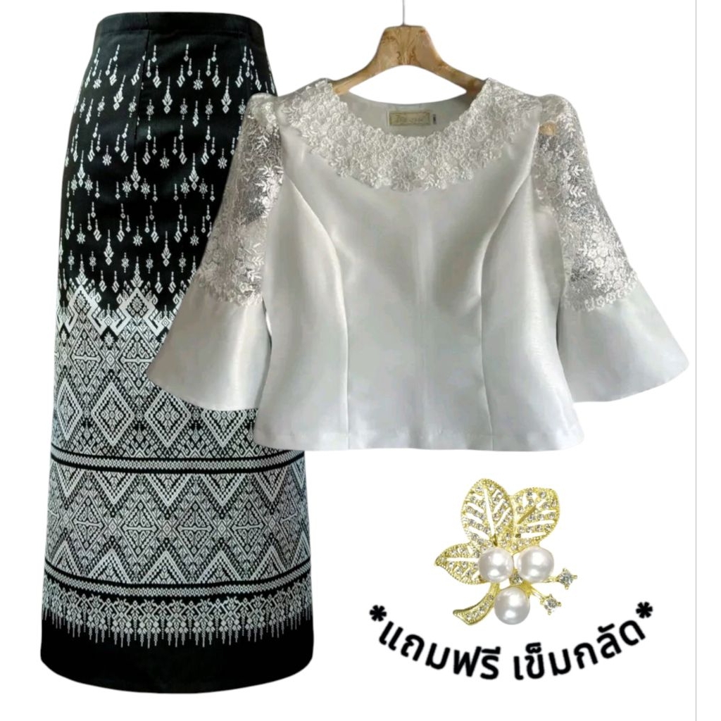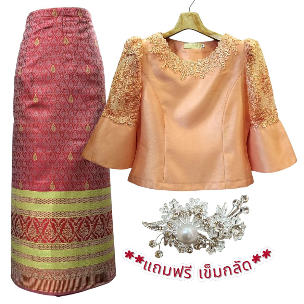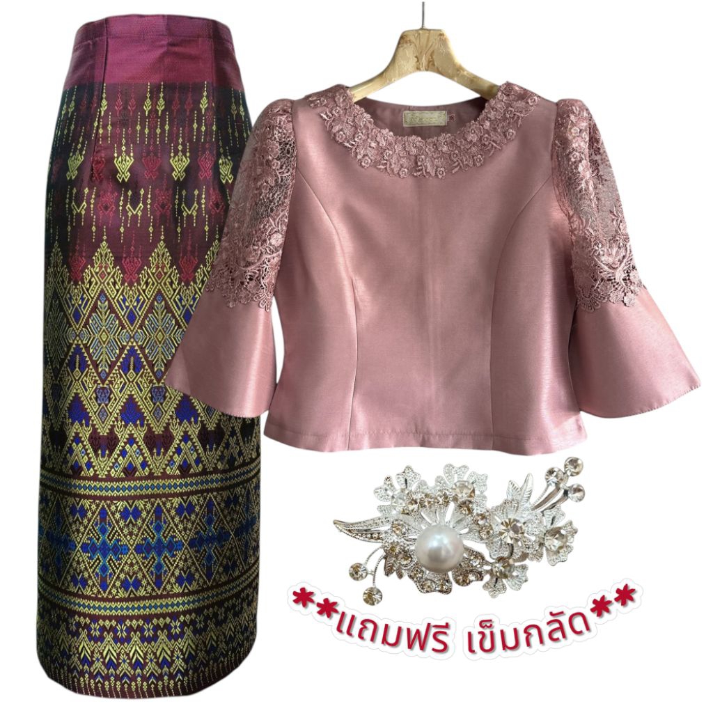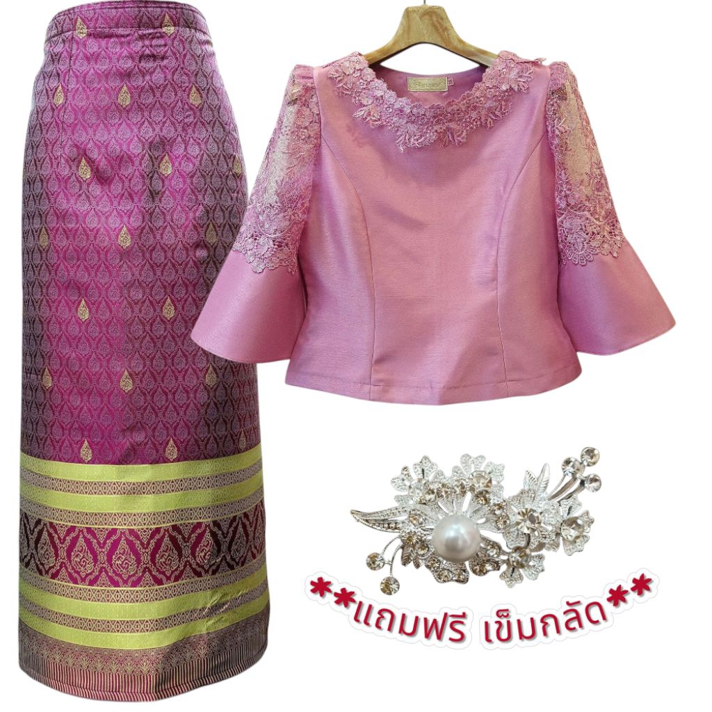 ชุดเซ็ท เสื้อผ้าไหมแขนบาน อัดกาว+ผ้าป้ายฟรีไซส์ อัดกาว