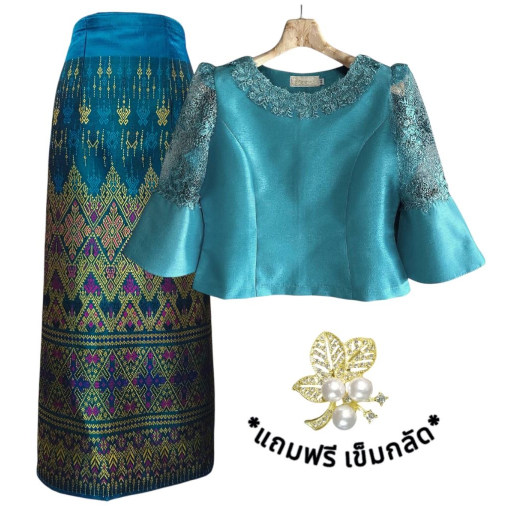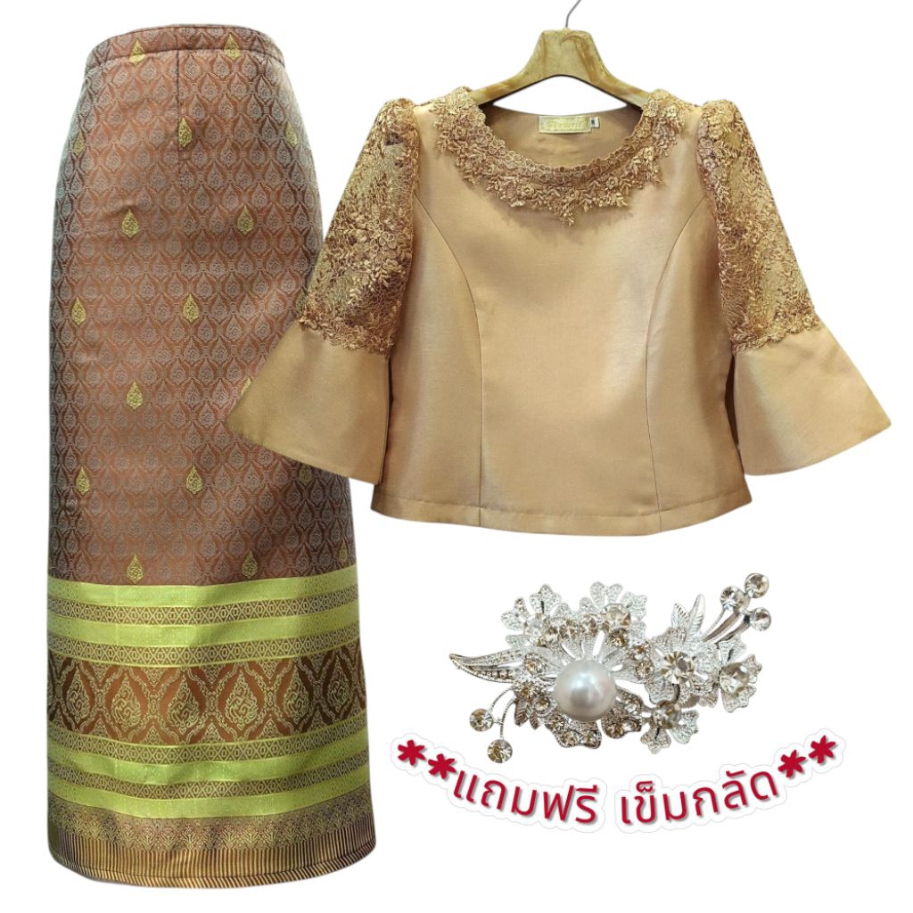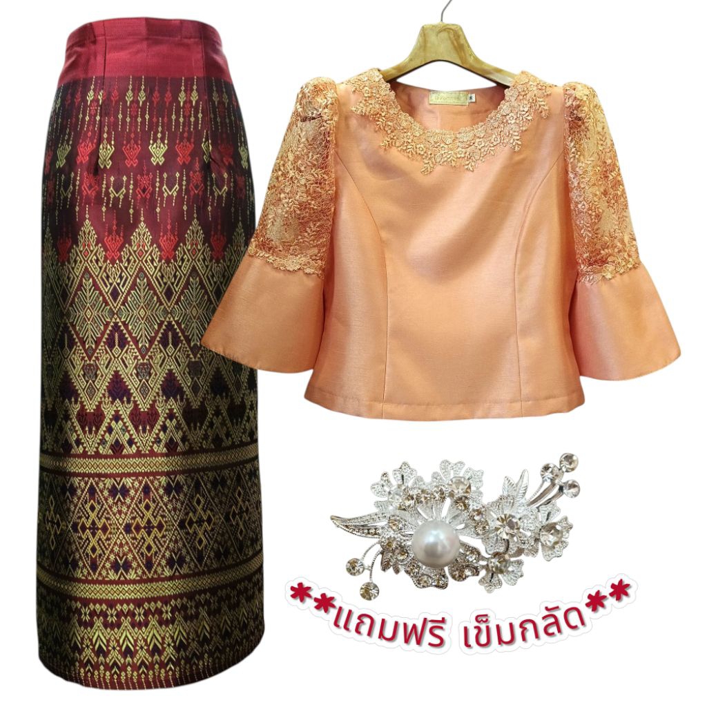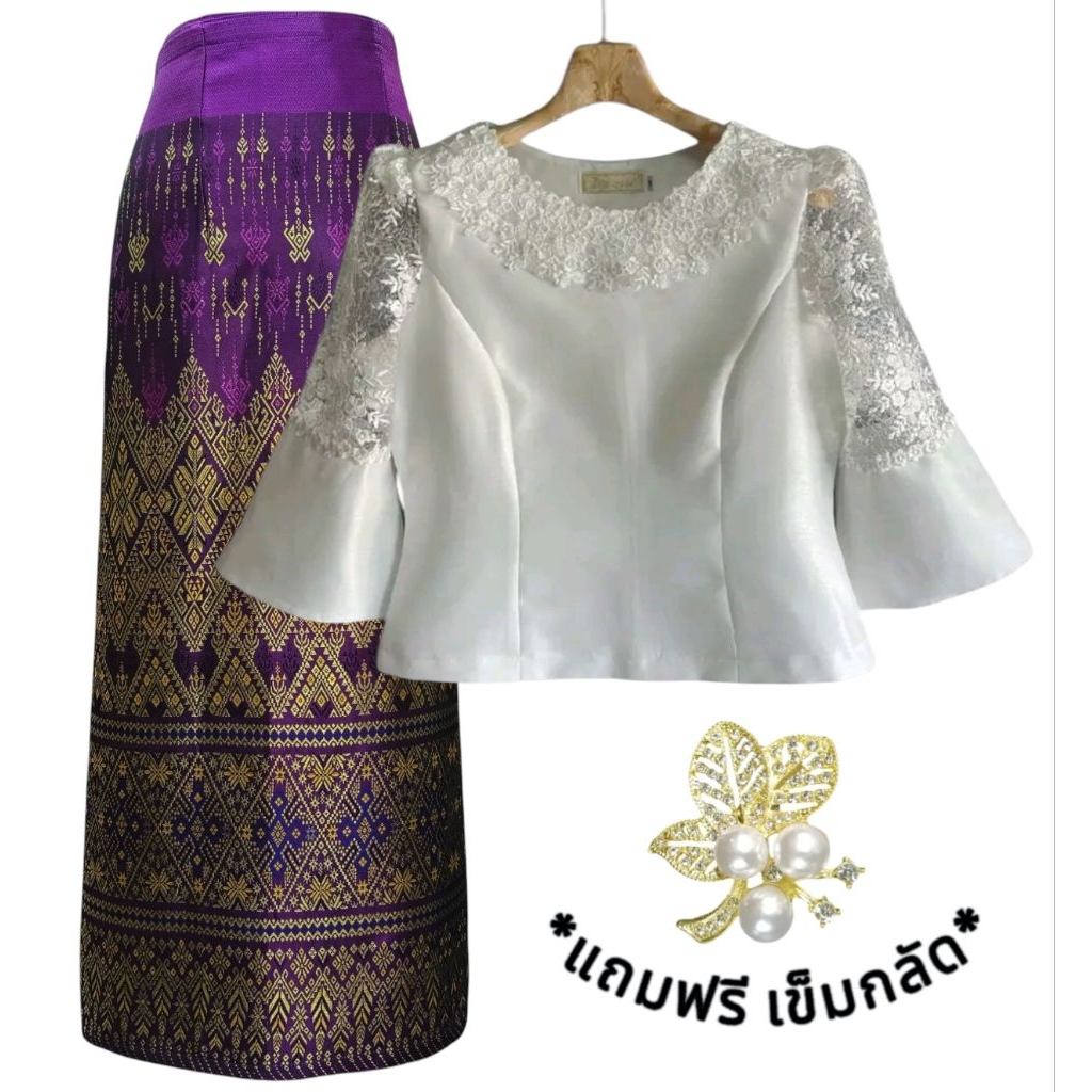 ชุดเซ็ท เสื้อผ้าไหมแขนบาน อัดกาว+ผ้าป้ายฟรีไซส์ อัดกาว