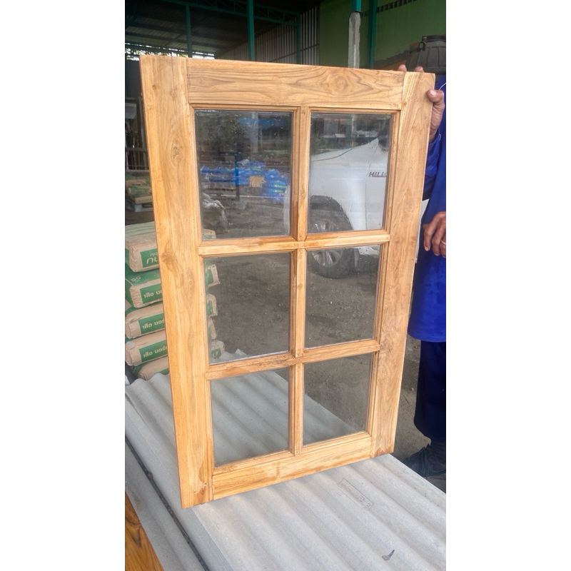 หน้าต่างไม้สัก พร้อมกระจกหกช่อง สามารถเลือกสีกระจกได้ ไม้สักคัดอย่างดีราคาโรงงานโดยตรง