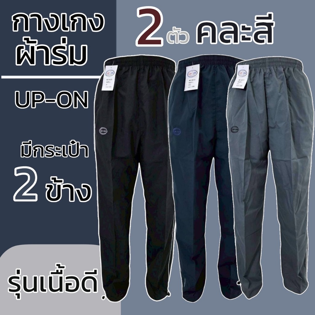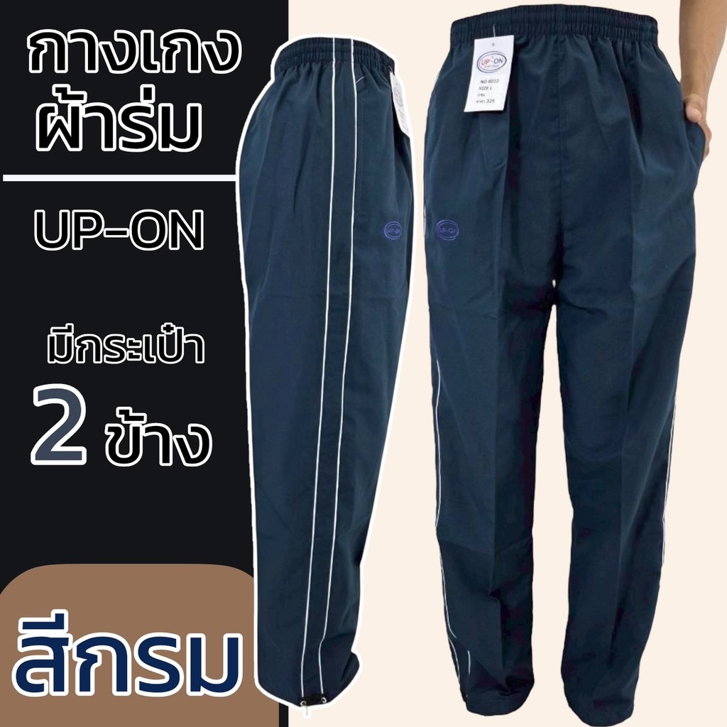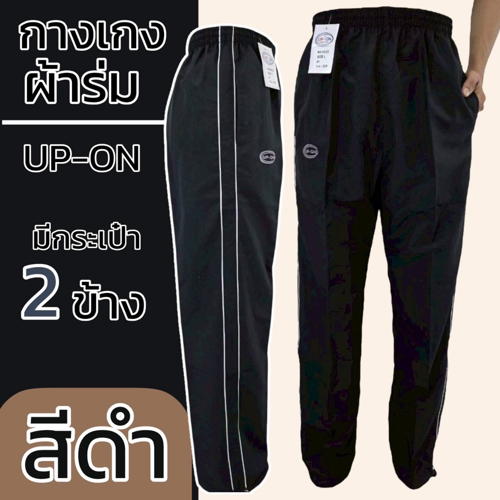 กางเกงผ้าไมโคร ขายาว กางเกงผ้าร่ม ขาสามารถรูดได้ สีดำ แถบ2เส้นสีขาว ยี่ห้อ UP-ON มีกระเป๋า2ข้าง ไม่มีซิป M20