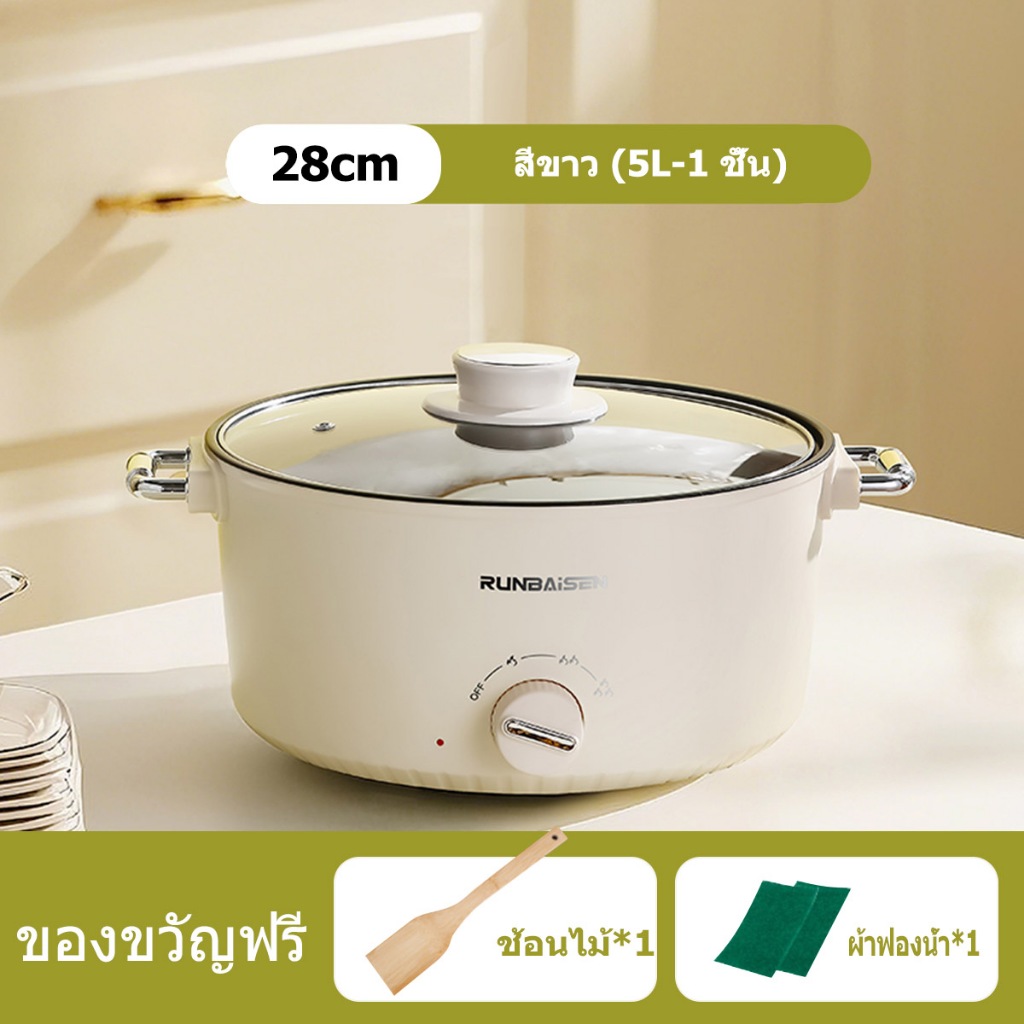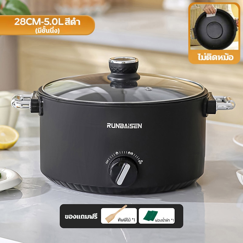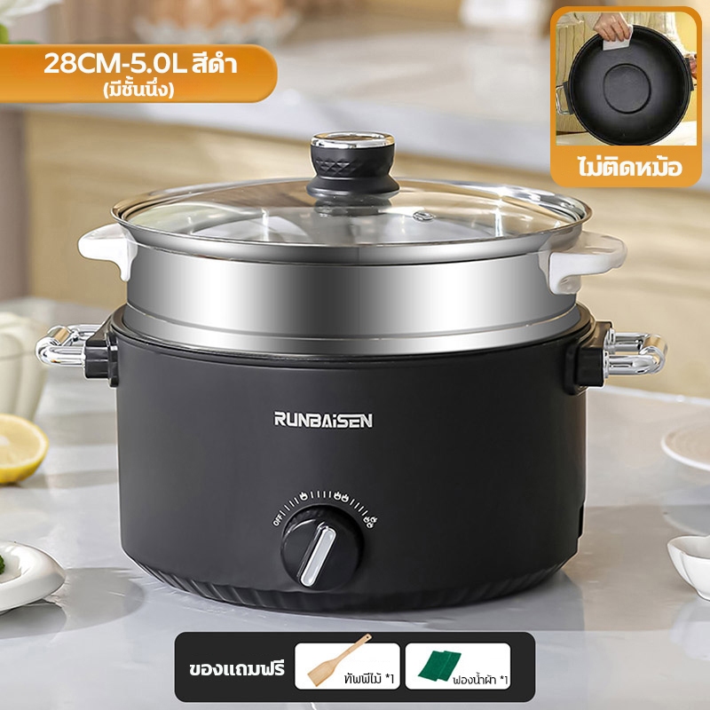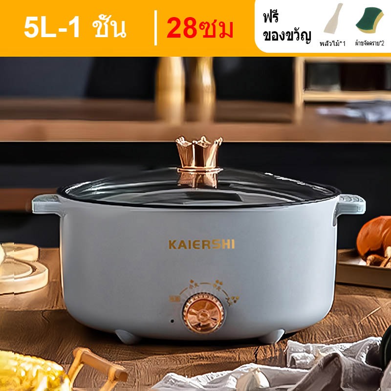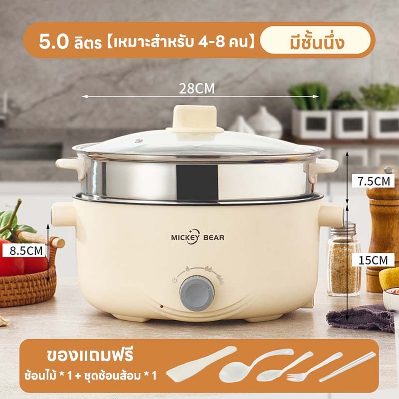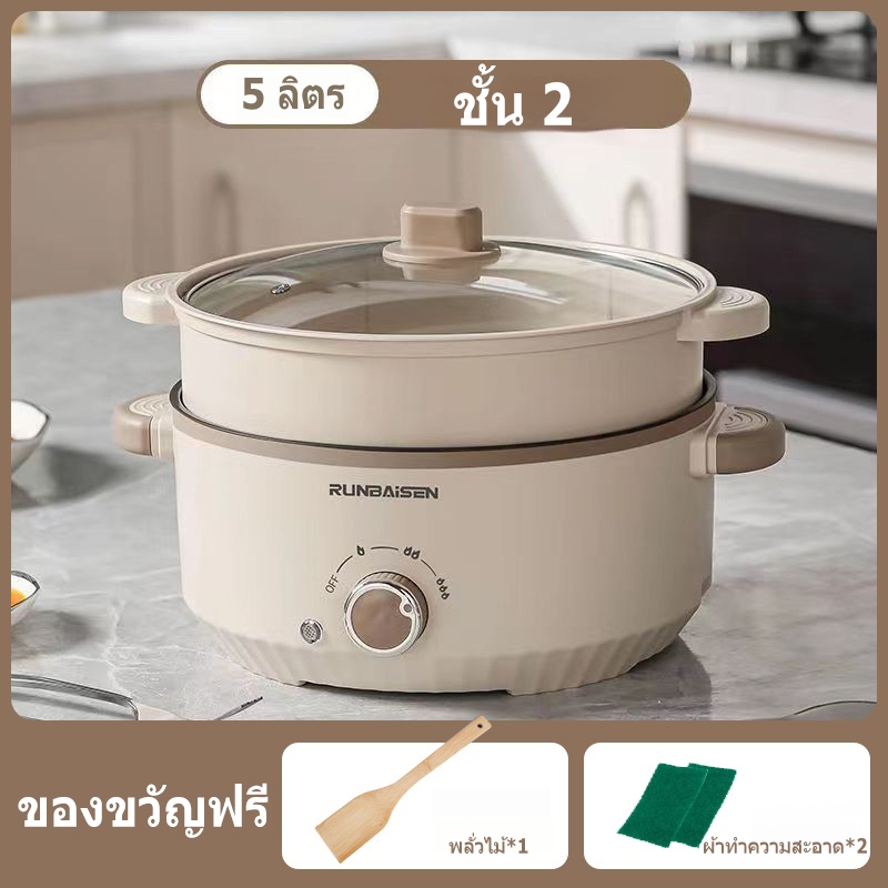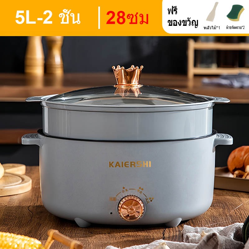 หม้อไฟฟ้า ความจุขนาดใหญ่ 5 ลิตร หม้อไฟฟ้ามัลติฟังก์ชั่น 1000W ไม่ติดหม้อ หม้อนึ่งไฟฟ้า 2 ชั้น หม้อต้มไฟฟ้า 28CM