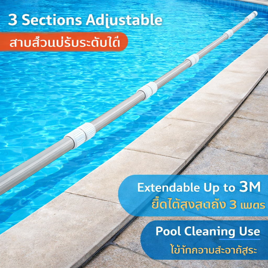 ด้ามดูดตะกอนสระว่ายน้ำ อลูมิเนียมแท้ ยืดได้ 3 ท่อน (1-3 เมตร) เก็บง่าย แข็งแรงทนทาน