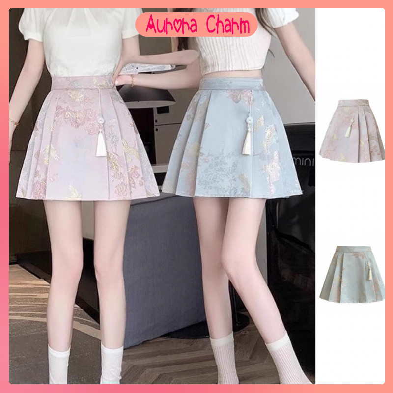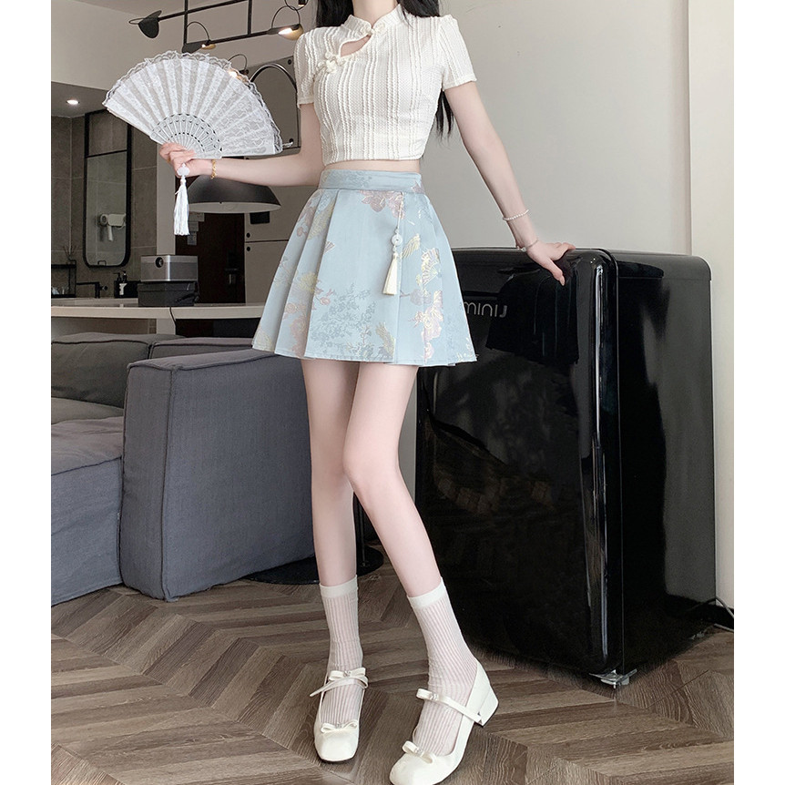 Aurora Charm กระโปรงสั้นกางเกงเอวสูง สีชมพูลายดอกไม้ สไตล์จีนคลาสสิค