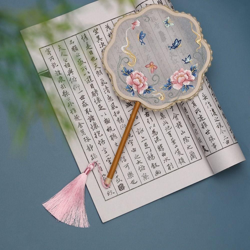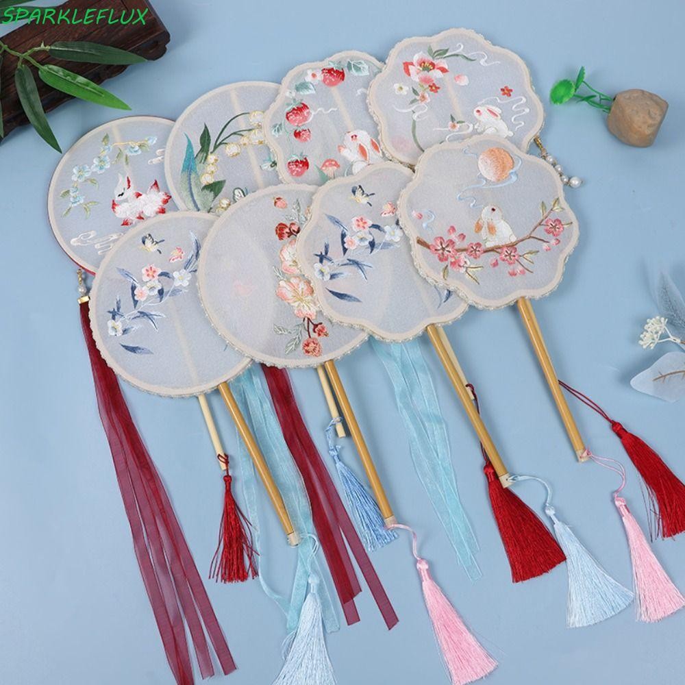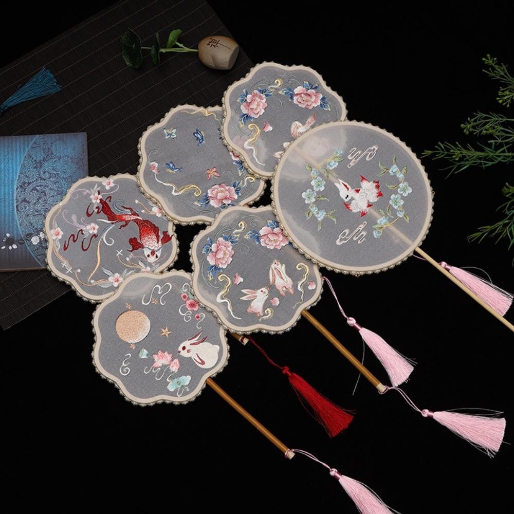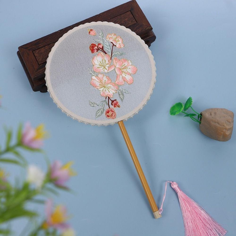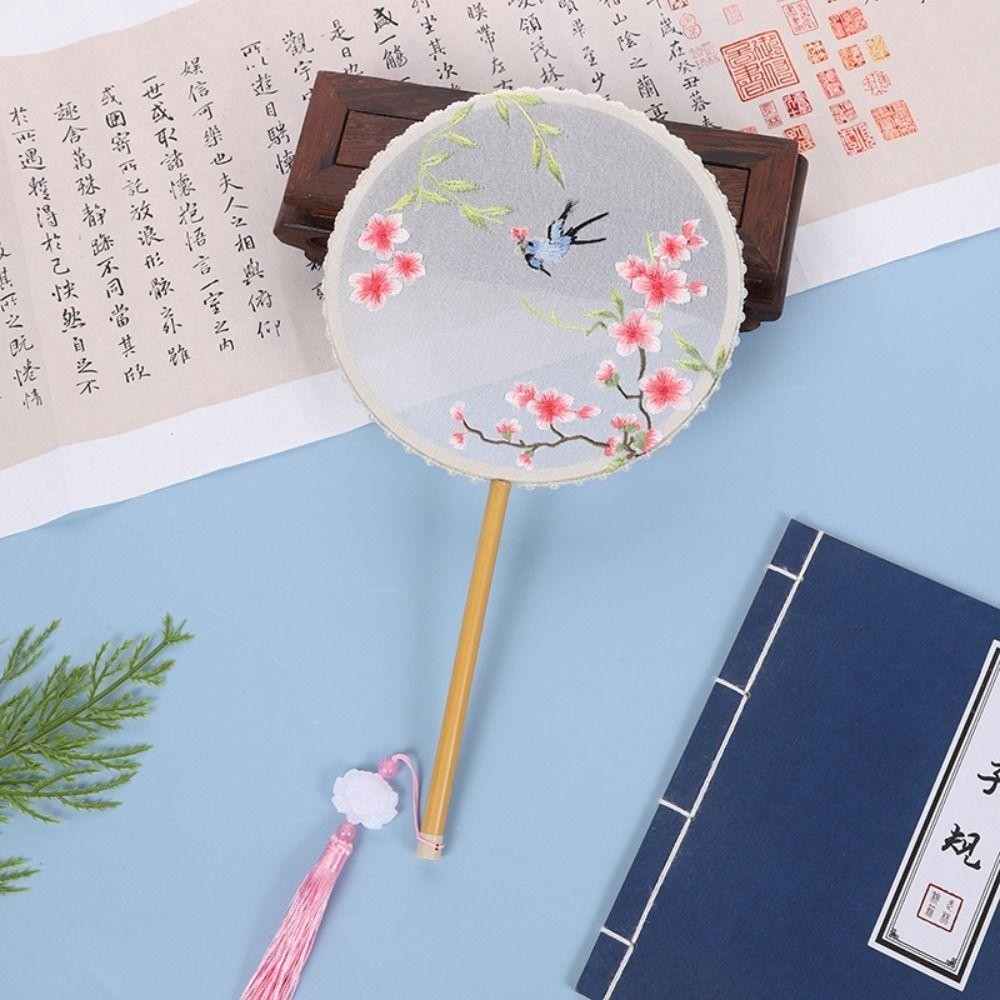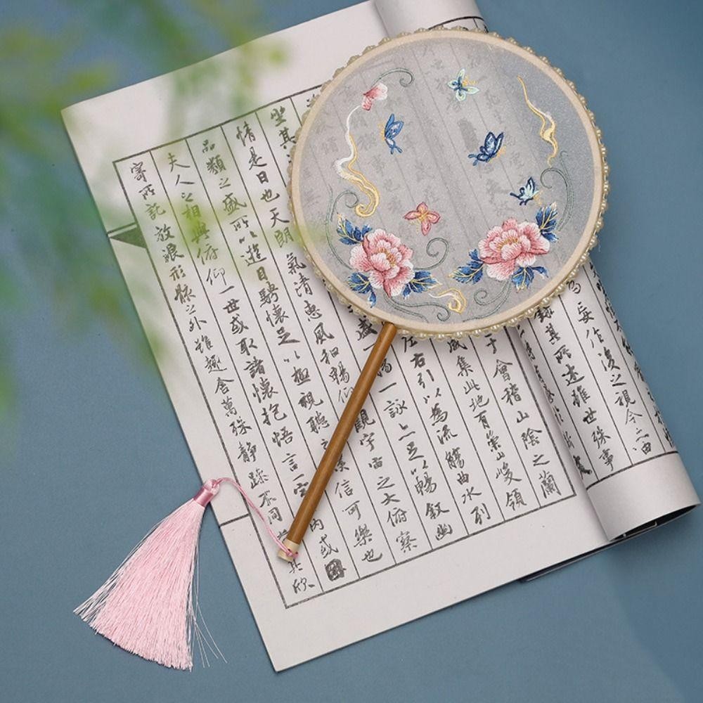 ประกายไฟ พัดลมทรงกลมพัดลมผ้าไหมกึ่งโปร่งใสคลาสสิกสไตล์จีนปักสองด้านด้วยพู่พัดลมมือแต่งงาน