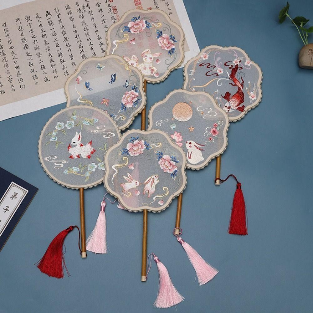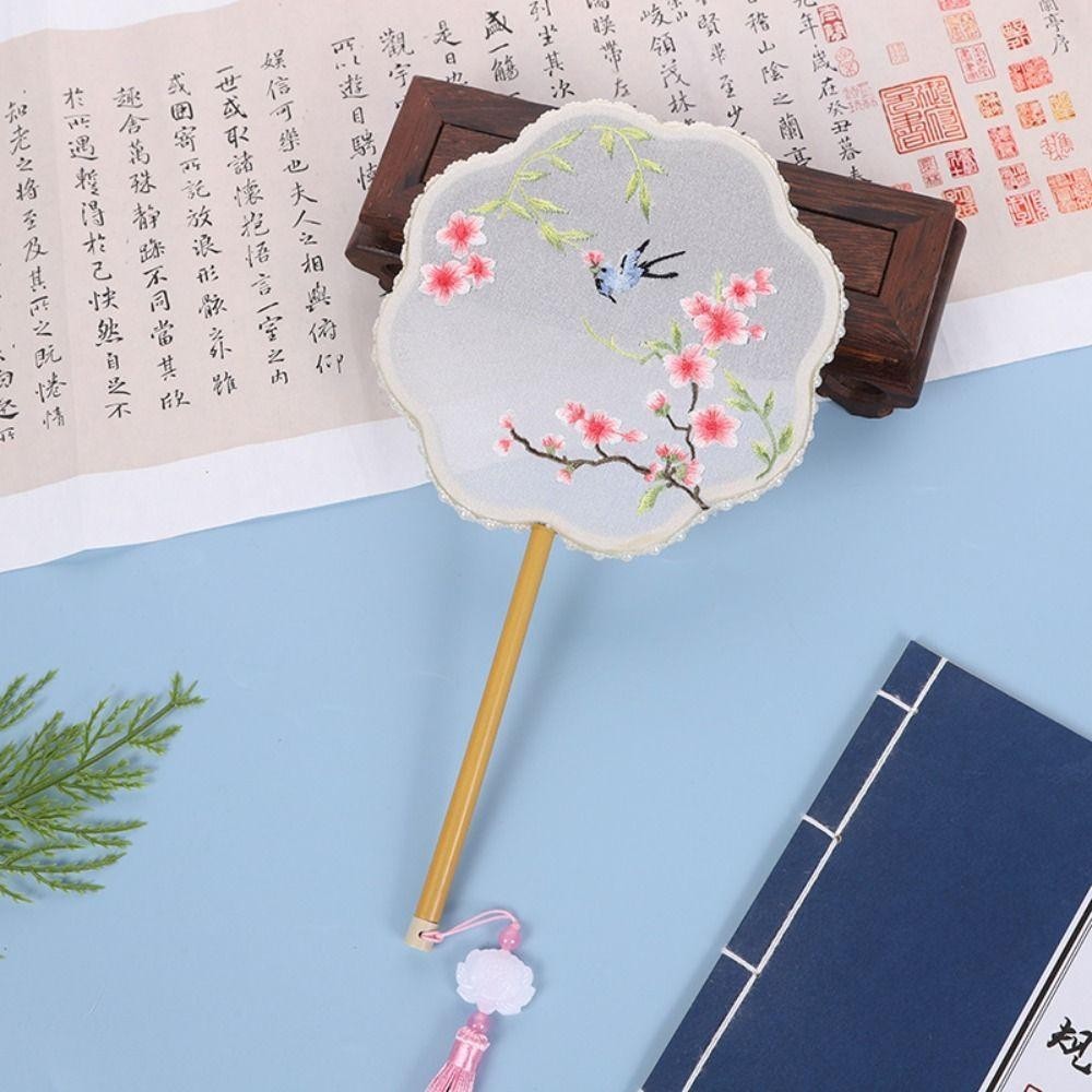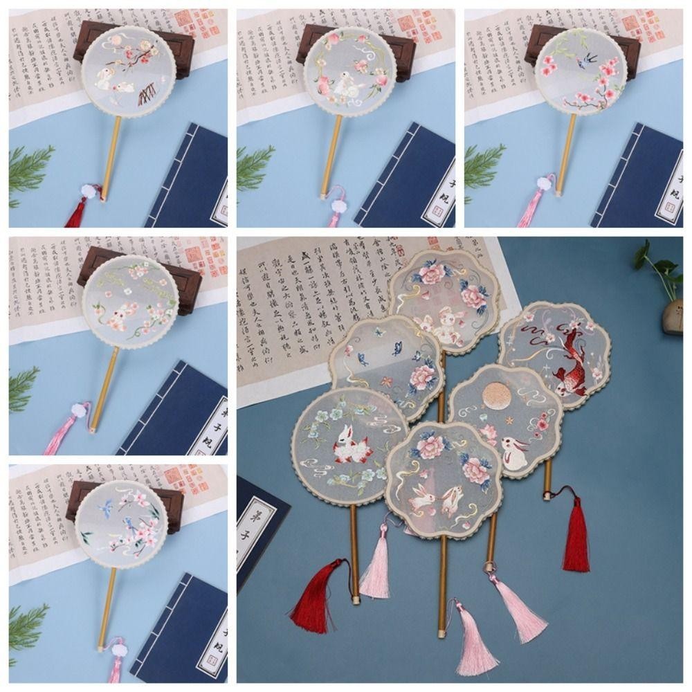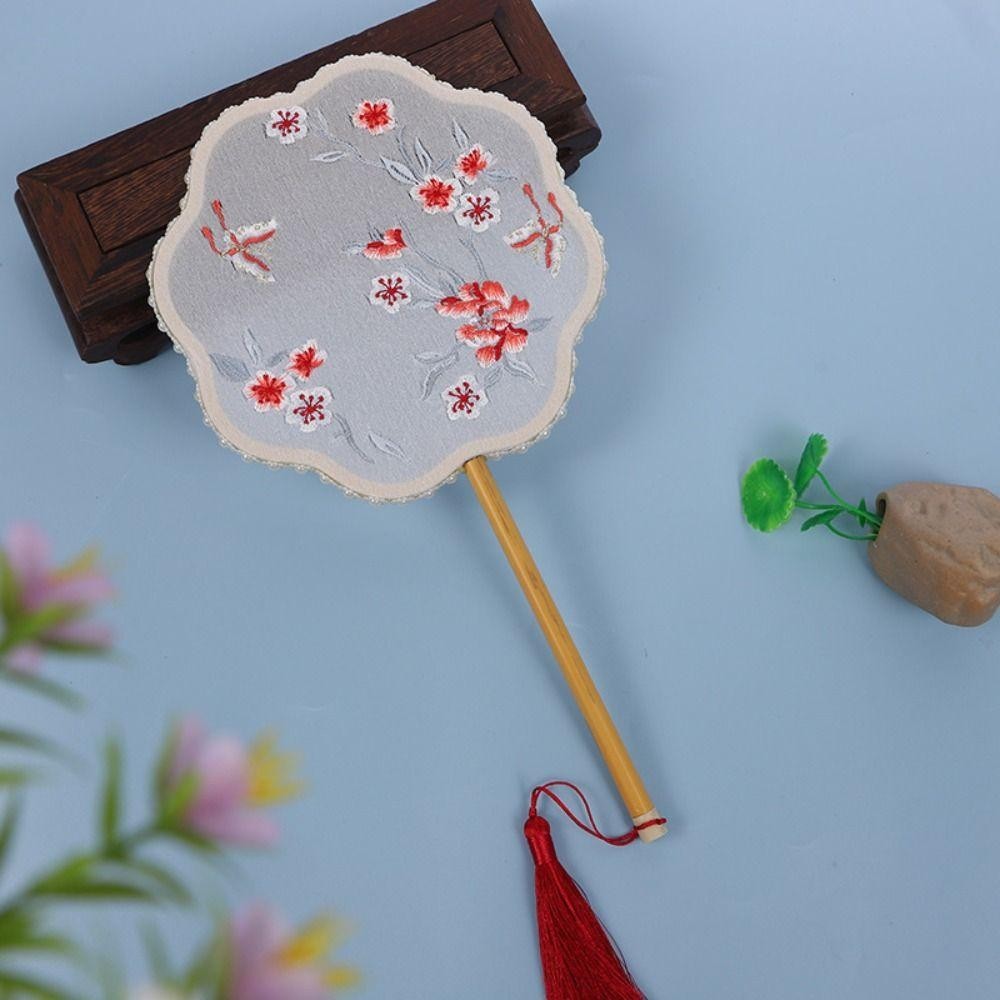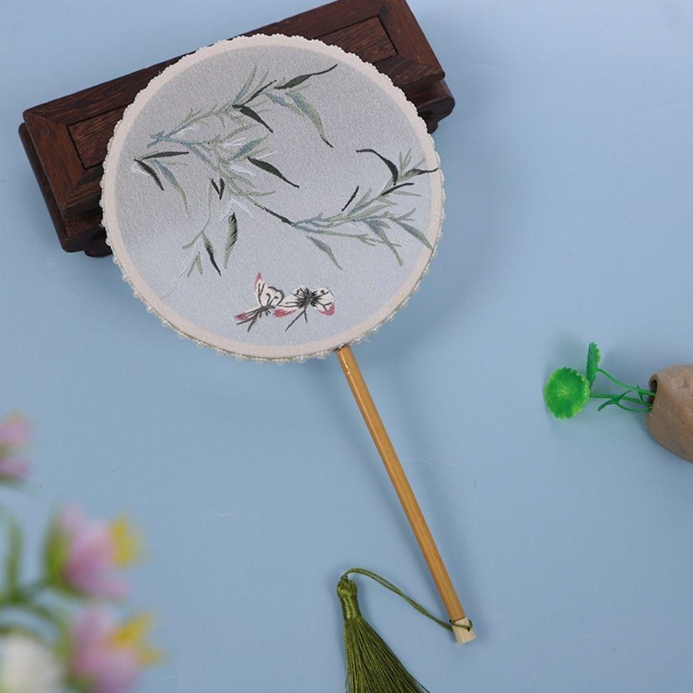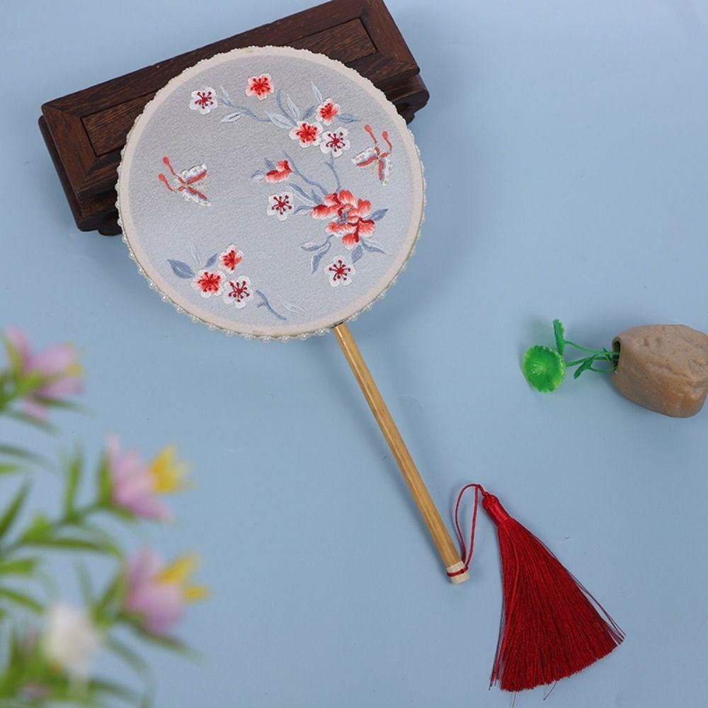 ประกายไฟ พัดลมทรงกลมพัดลมผ้าไหมกึ่งโปร่งใสคลาสสิกสไตล์จีนปักสองด้านด้วยพู่พัดลมมือแต่งงาน