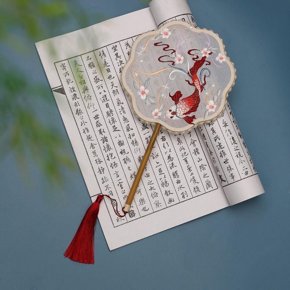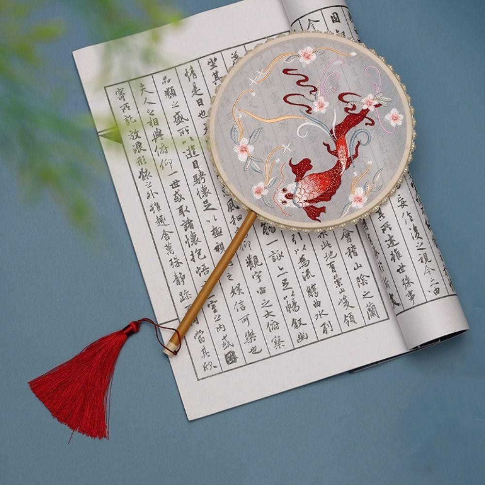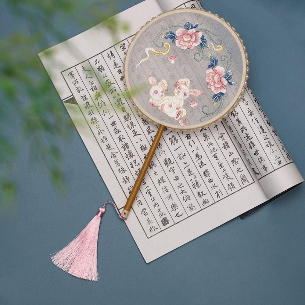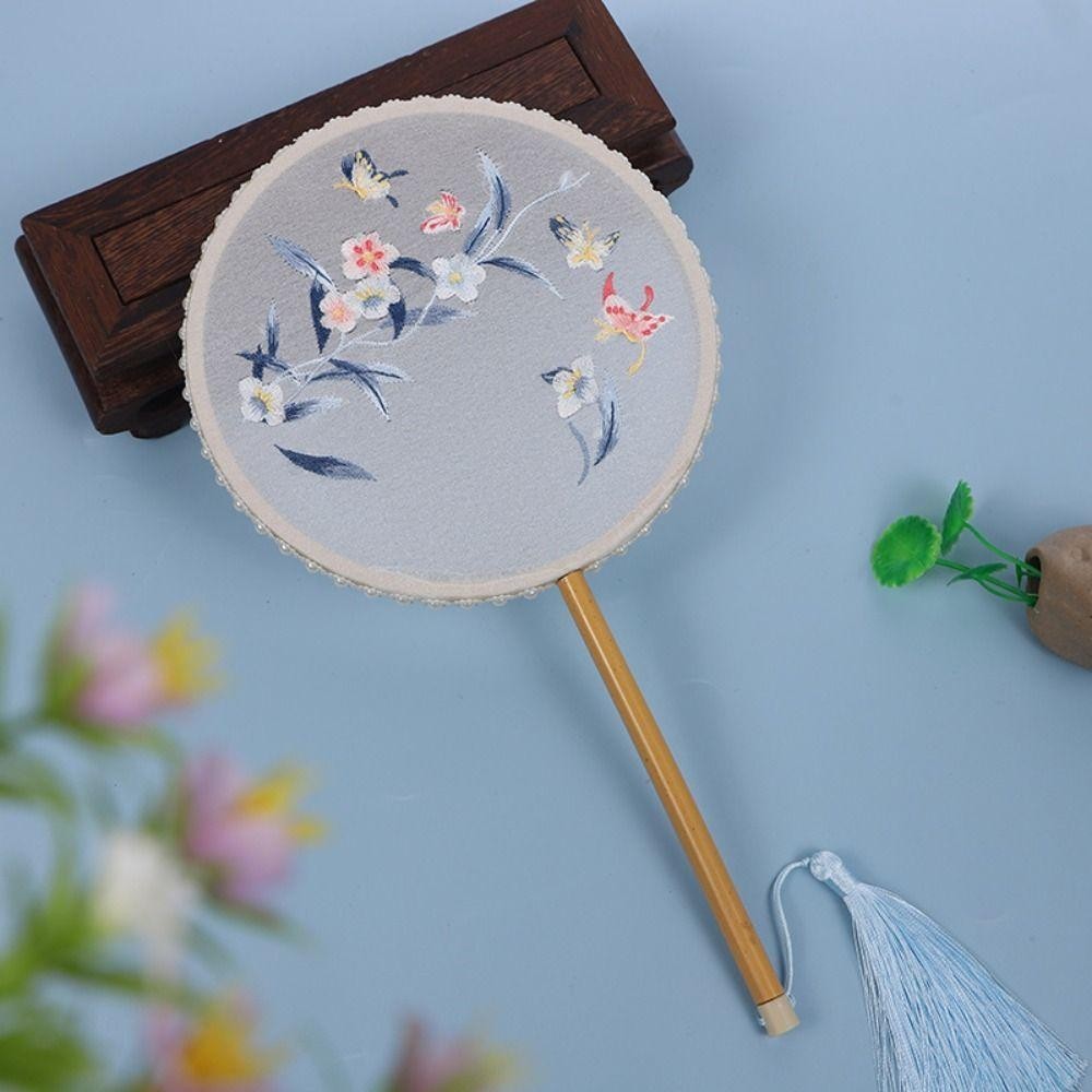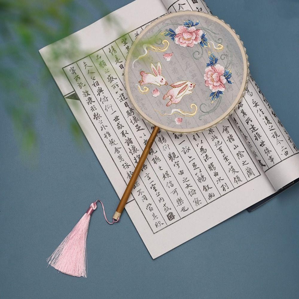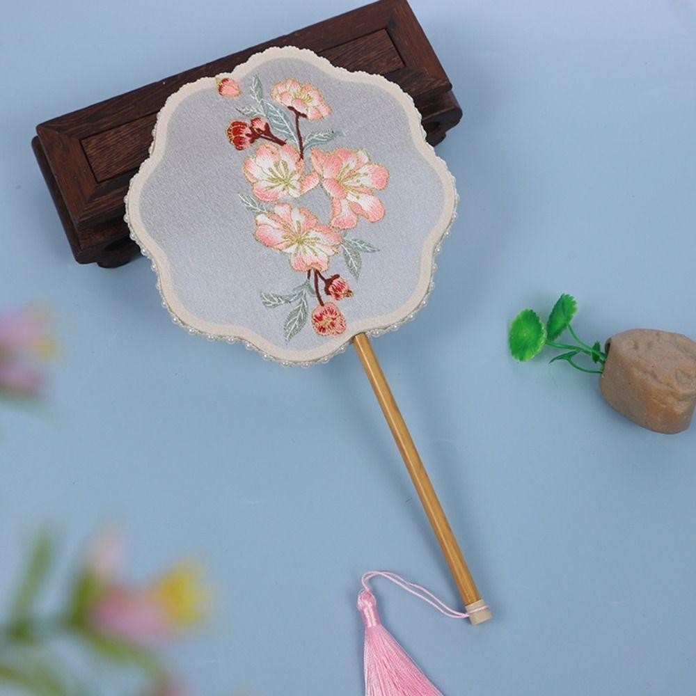 ประกายไฟ พัดลมทรงกลมพัดลมผ้าไหมกึ่งโปร่งใสคลาสสิกสไตล์จีนปักสองด้านด้วยพู่พัดลมมือแต่งงาน