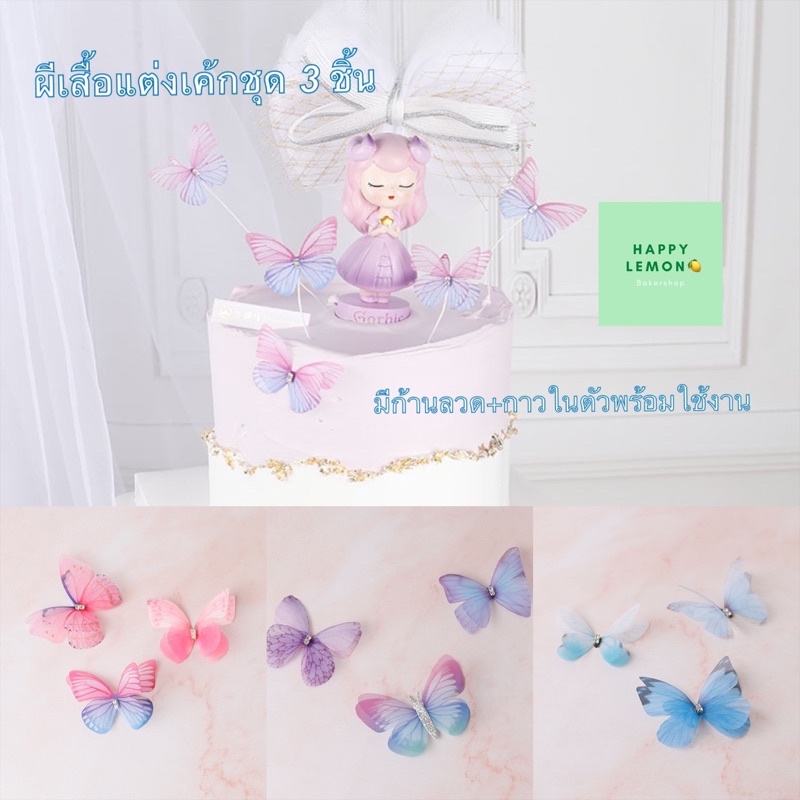 ผีเสื้อแต่งเค้ก ผีเสื้อประดับเค้กสีสดใส ชุด 3 ชิ้น