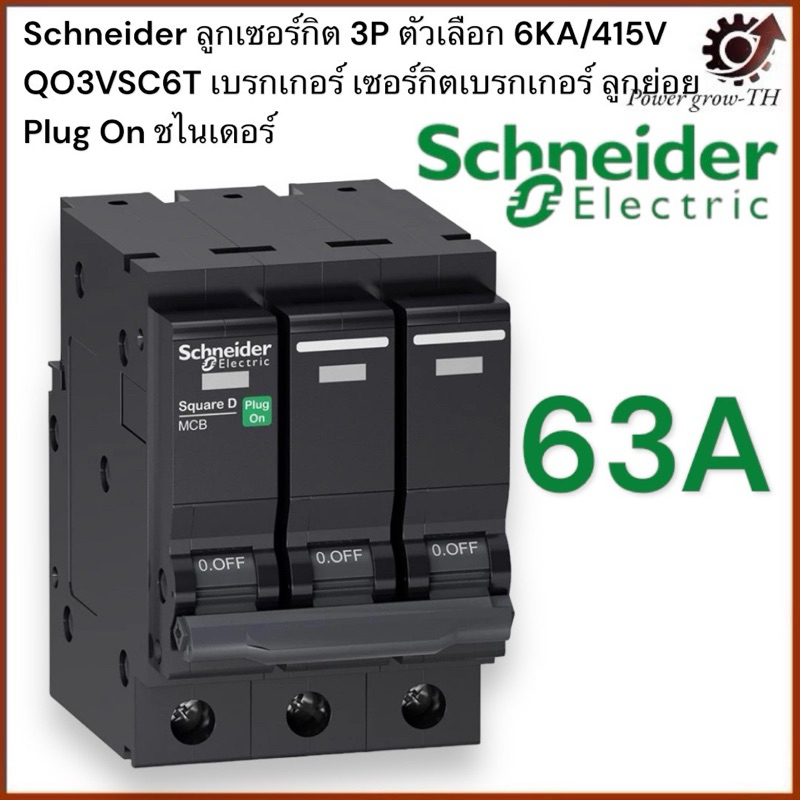 Schneider ลูกเซอร์กิต 3P ตัวเลือก 10A, 16A, 20A, 25A, 32A, 40A, 50A, 63A 6KA/415V QO3VSC6T เบรกเกอร์ Plug On ชไนเดอร์