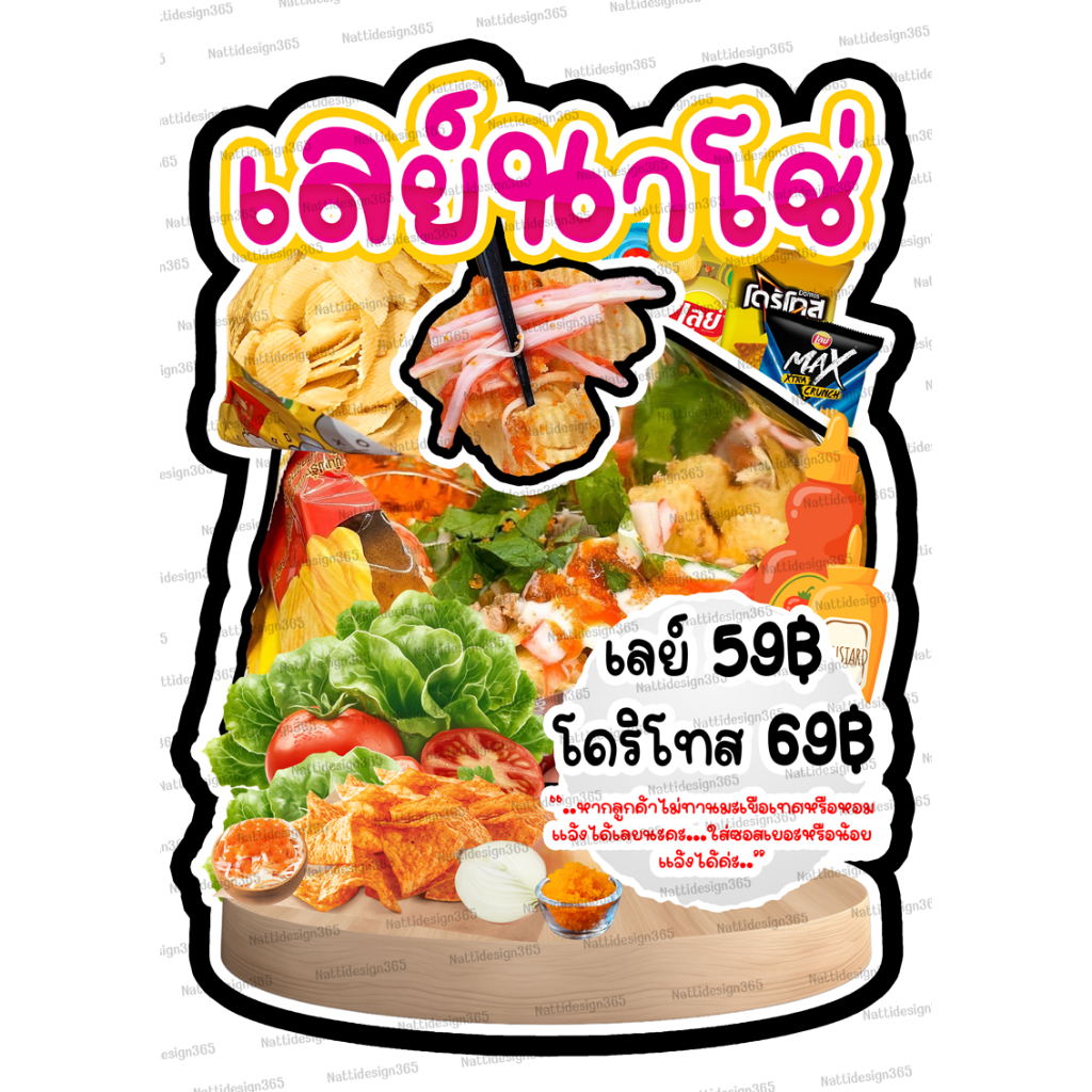 ป้ายเลย์นาโช่ ป้ายมันฝรั่ง ป้ายตกแต่งหน้าร้าน ป้ายเคลือบแข็ง ป้ายพลาสวูด 3 มิล ป้ายฟิวเจอร์บอร์ด 5 มิล