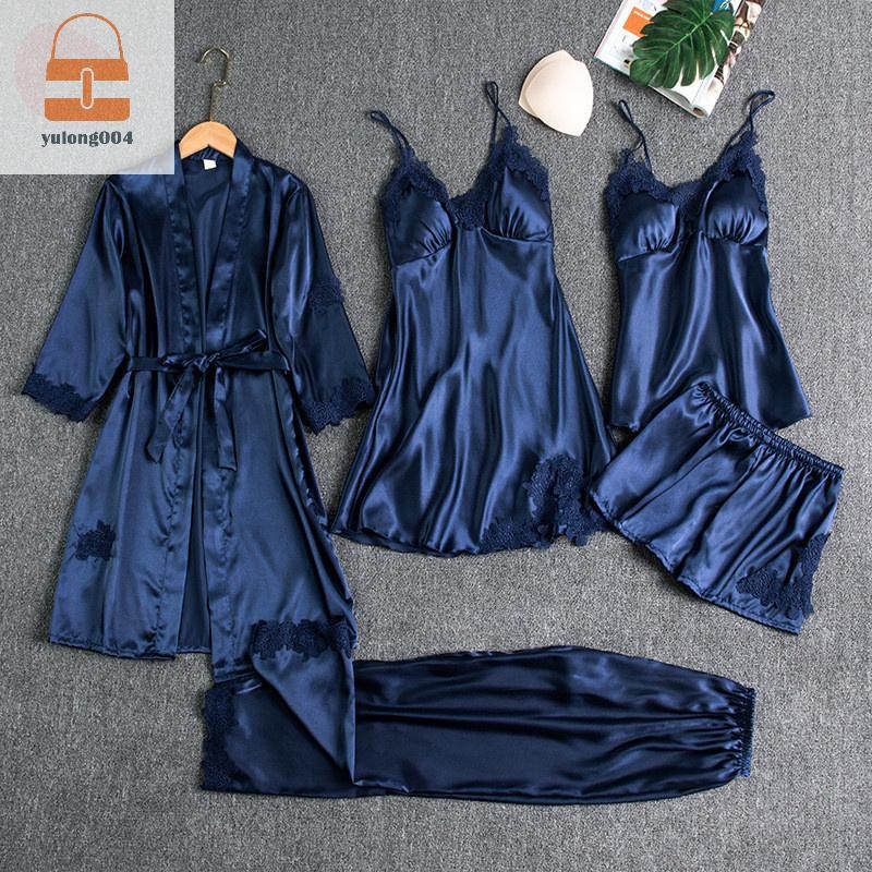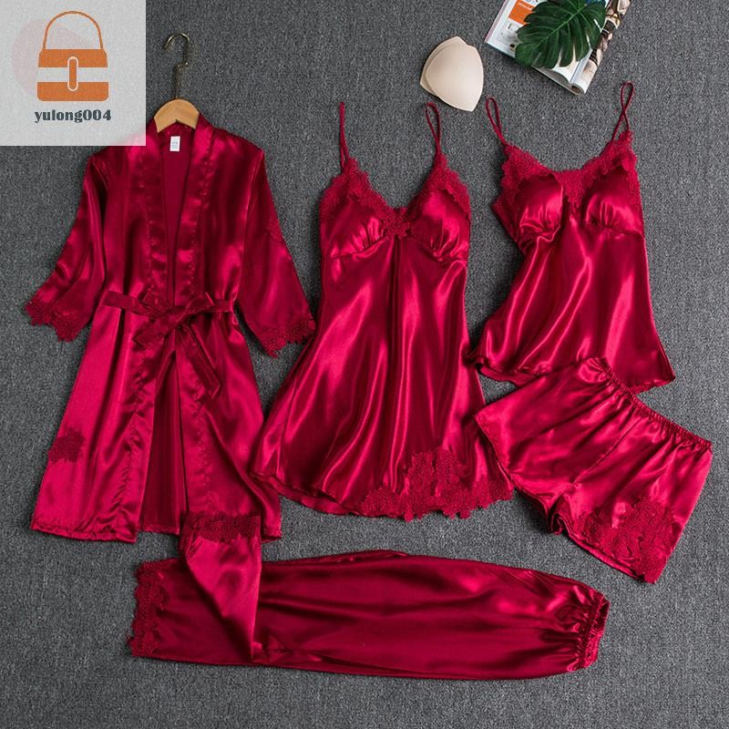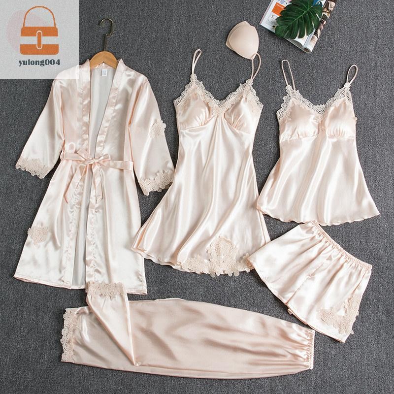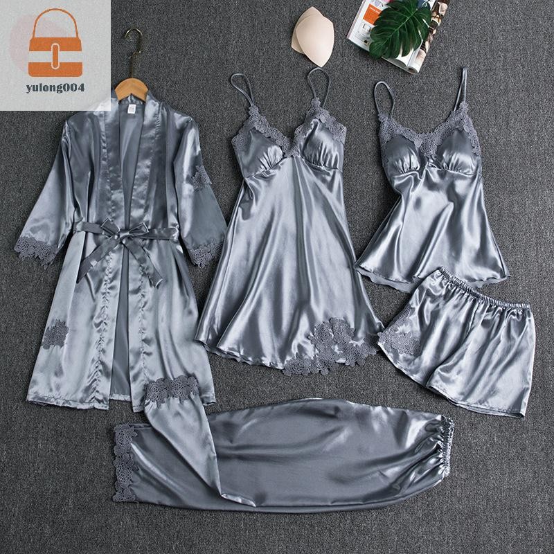 [PE] 5pc ผ้าไหม Robe Sleep ชุดสตรีลูกไม้ซาตินชุดนอนชุดนอนชุด V คอ Cami Nighties สวมใส่ Pijama บ้านชุดนอนฤดูใบไม้ผลิ Nightdress TH