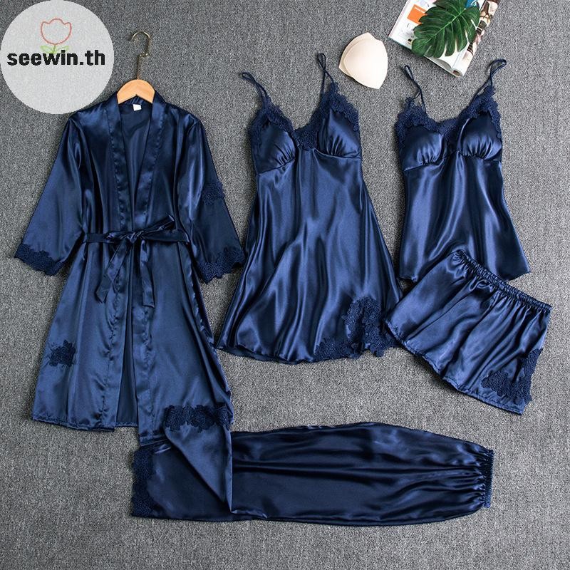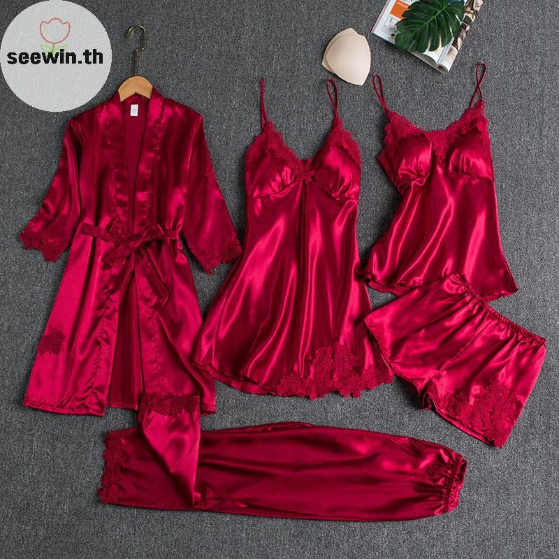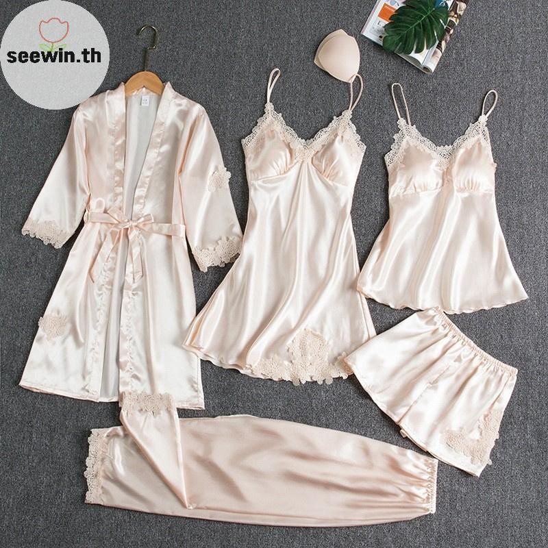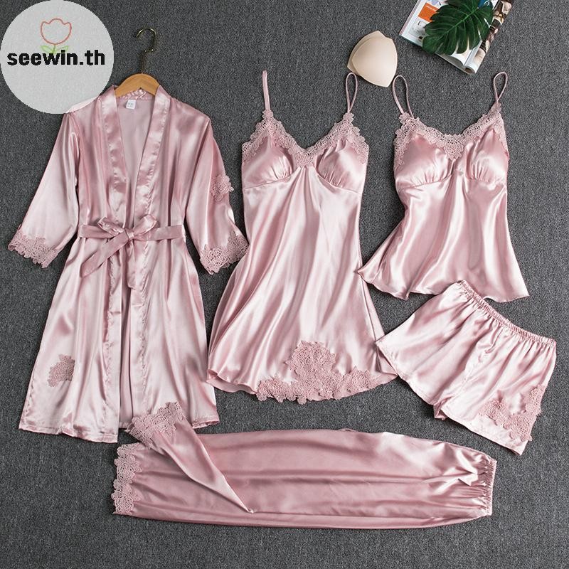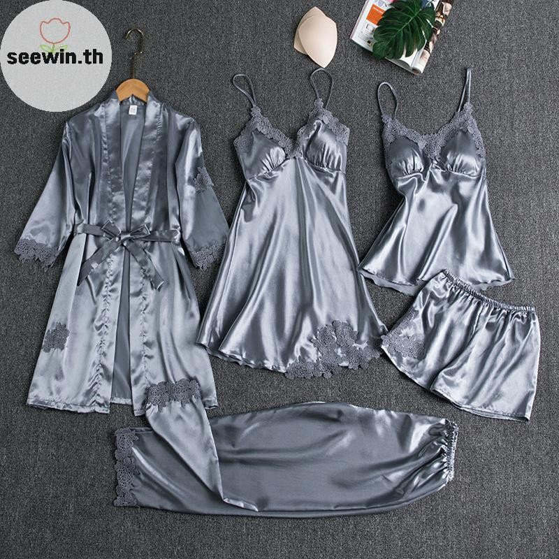 เซวิน ชุดนอนสตรี 5 ชิ้น โรบบี้ สแล็บ คอวี กามิ ไนตี้ ผ้าไหมและซาติน สำหรับใส่ภายในบ้านในฤดูใบไม้ผลิ