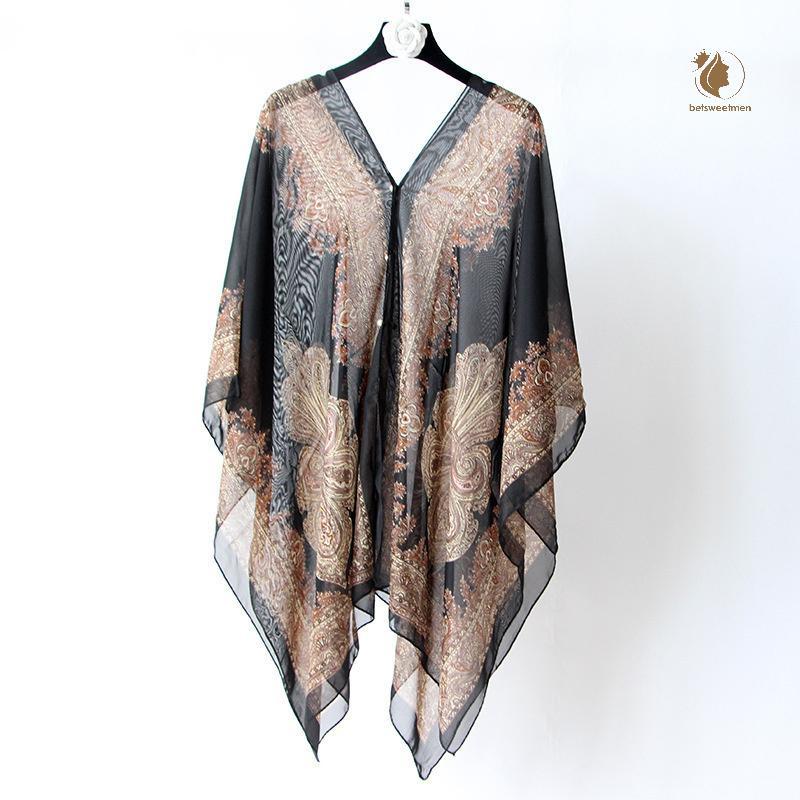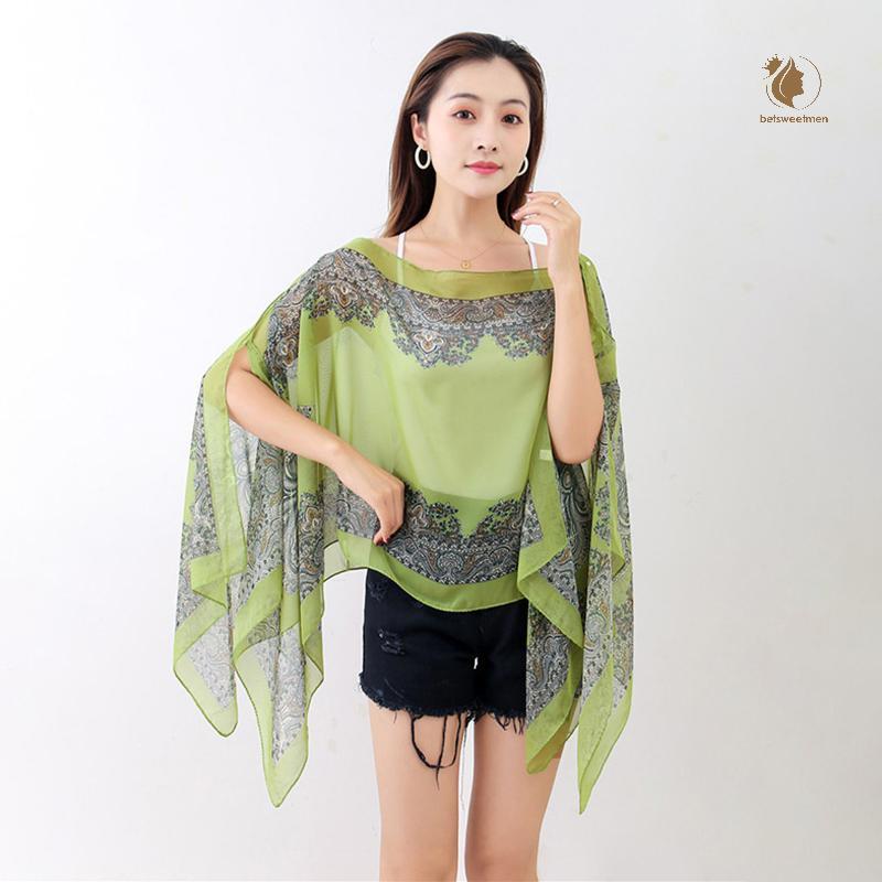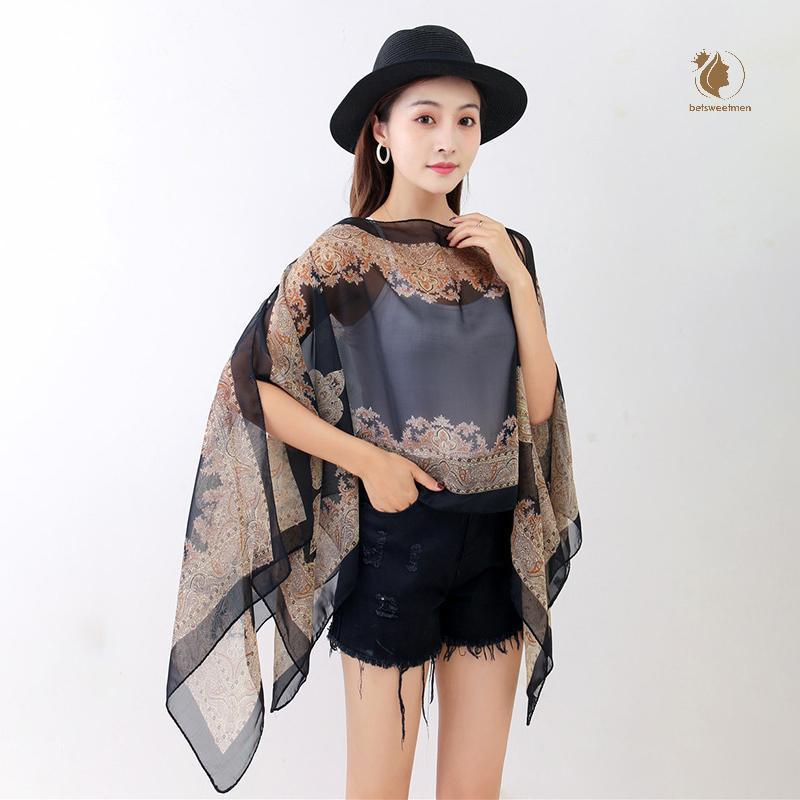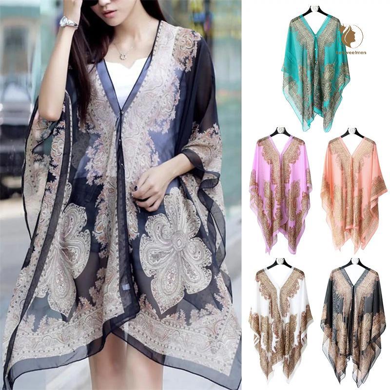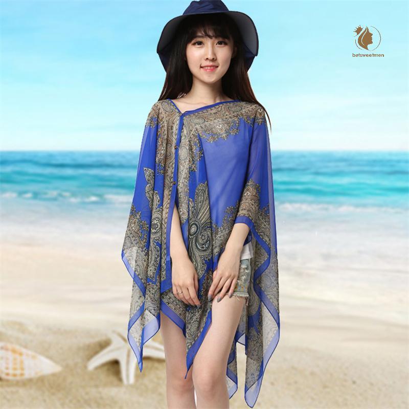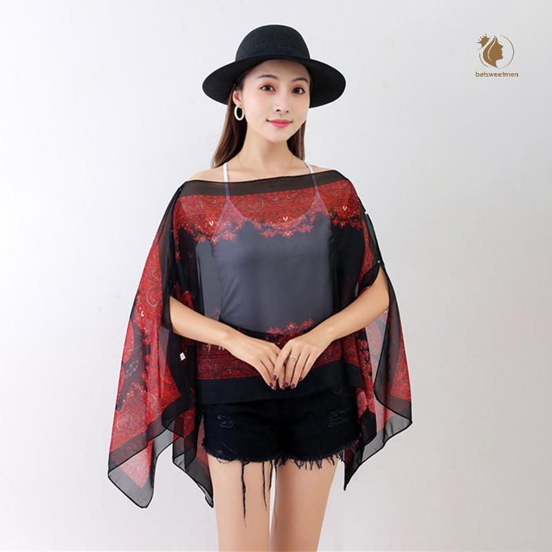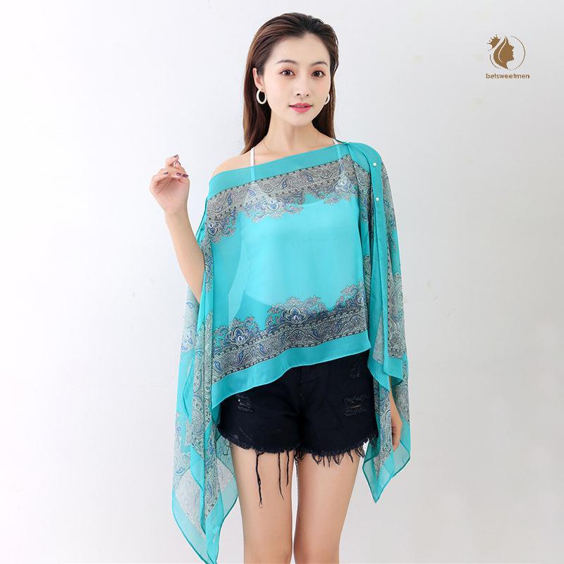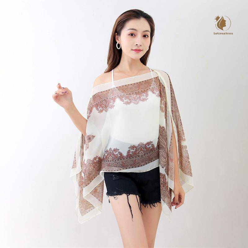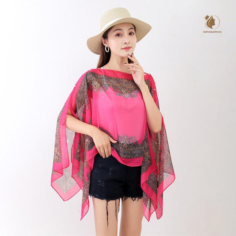 [PE] ผ้าคลุมไหล่กันแดดชายหาดแฟชั่นผู้หญิงเสื้อผ้าฤดูร้อนชายหาดบิกินี่ปิดเสื้อชีฟองหลวมผ้าคลุมไหล่ผ้าพันคอพร้อมปุ่ม TH