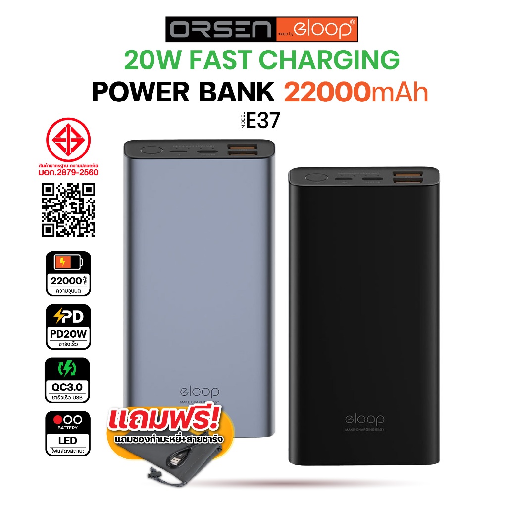 [583บ. โค้ดคุ้ม] Orsen Eloop E37 E36 Quick Charge แบตสำรอง Power Bank 22000mAh PD เพาเวอร์แบงค์