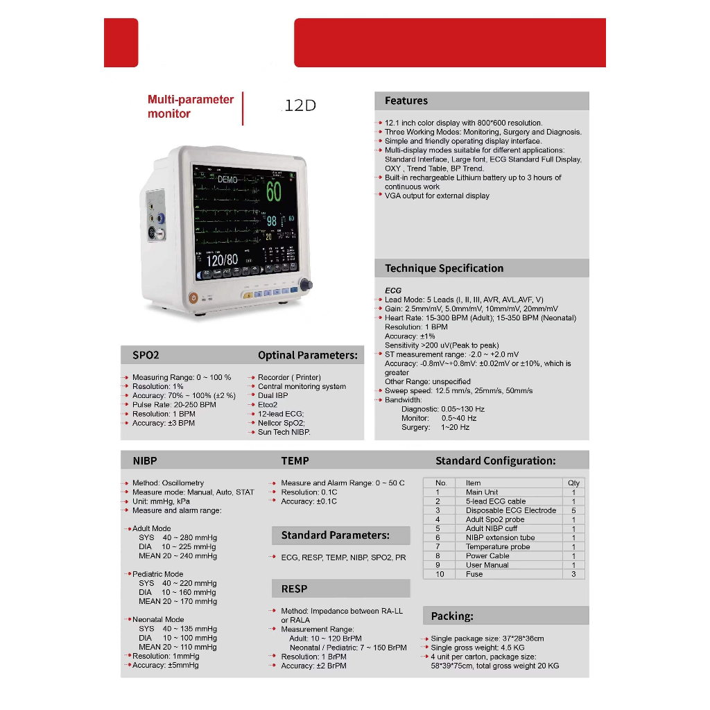 [COD] จอภาพผู้ป่วยทางการแพทย์ 12D, โรงพยาบาล/คลินิก/จอภาพข้างเตียงในครัวเรือน, หน้าจอความละเอียดสูงขนาด 12.1 นิ้ว, จอภาพชีวภาพแบบพกพา, อุปกรณ์เสริมครบชุด, เครื่ องวัดแสงหลายจุด, SSP, ECG, SPO, สัญลักษณ์ฟรี การส่งสินค้า การส่งสินค้า