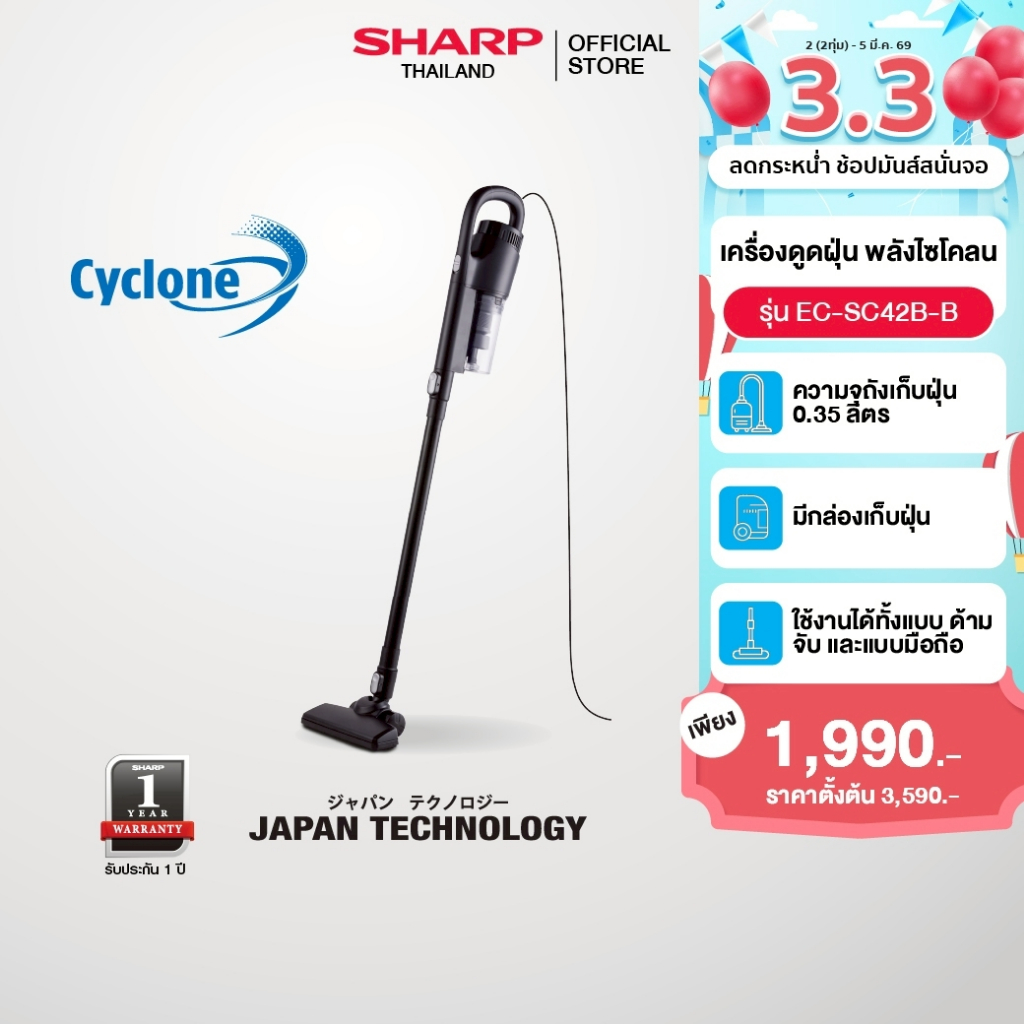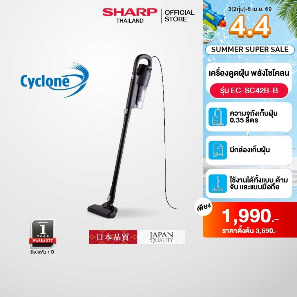 SHARP เครื่องดูดฝุ่นด้ามจับแบบมีสาย 450 วัตต์ ระบบพลังลมไซโคลน น้ำหนักเบา 1.9 กก. รุ่น EC-SC42B-B