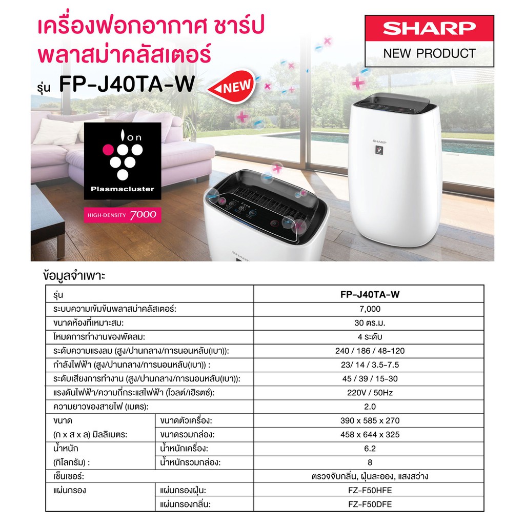 SHARP Air Purifier เครื่องฟอกอากาศ พลาสม่าคลัสเตอร์ รุ่น FP-J40TA-W ขนาด 30 ตร.ม
