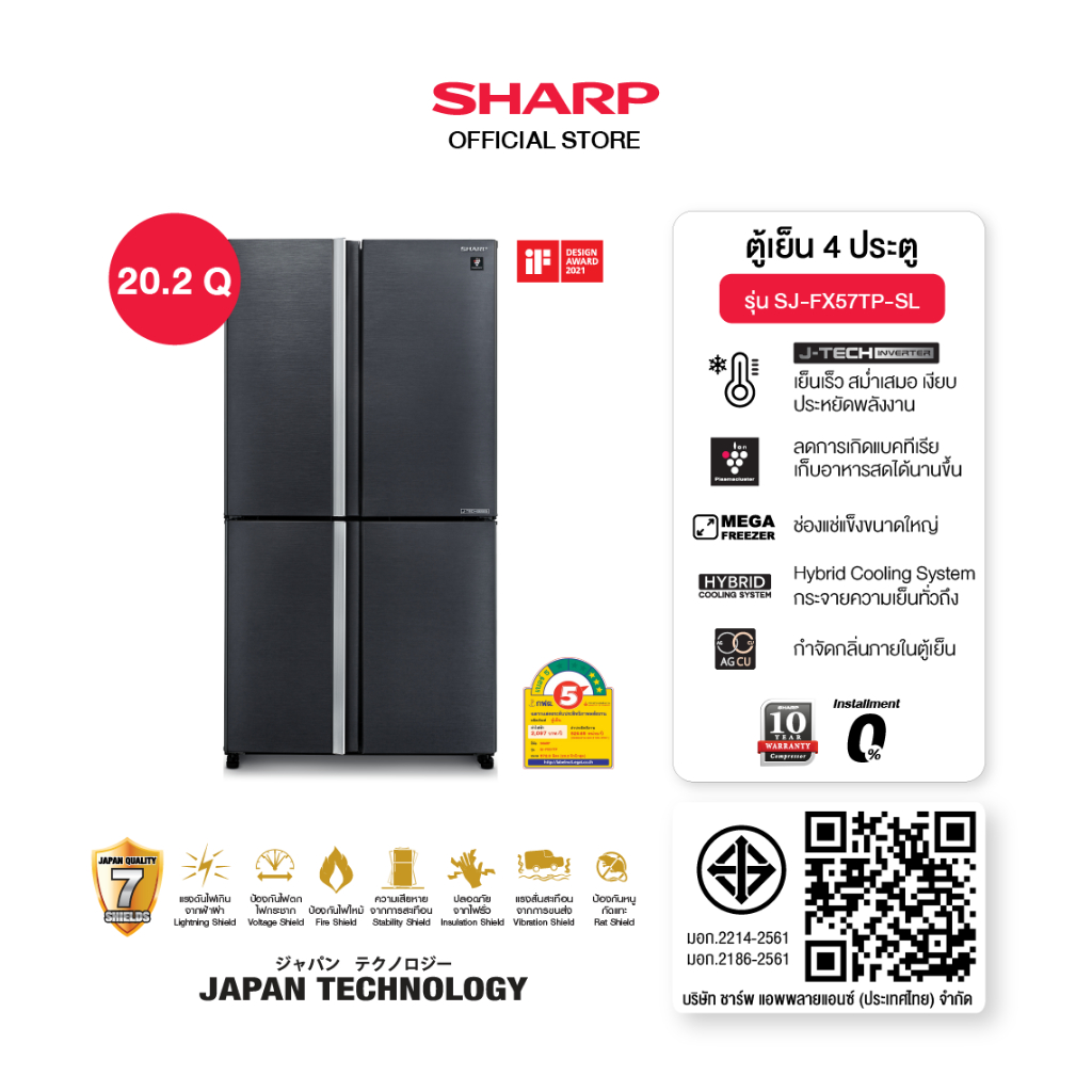 SHARP ตู้เย็น 4 ประตู มี Plasma cluster ขนาด 18.5 - 20.3 คิว รุ่น SJ-FX52TP-SL ,SJ-FX57TP-SL สีเทาเงิน