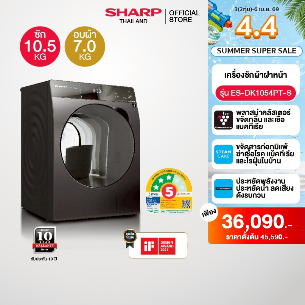 SHARP PRO FLEX เครื่องซักผ้า ฝาหน้า มี Plasmacluster ขนาด 10.5 Kg รุ่น ES-DK1054PT-S