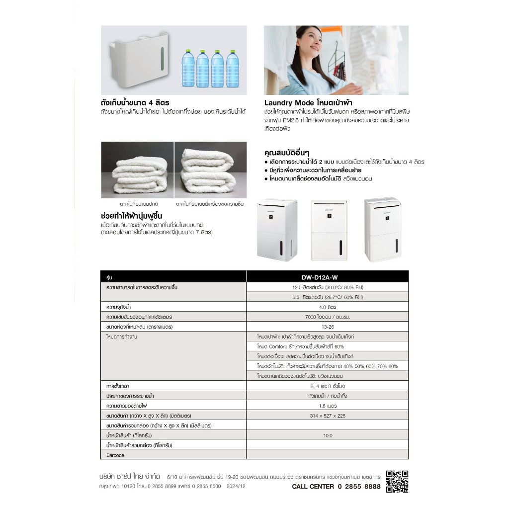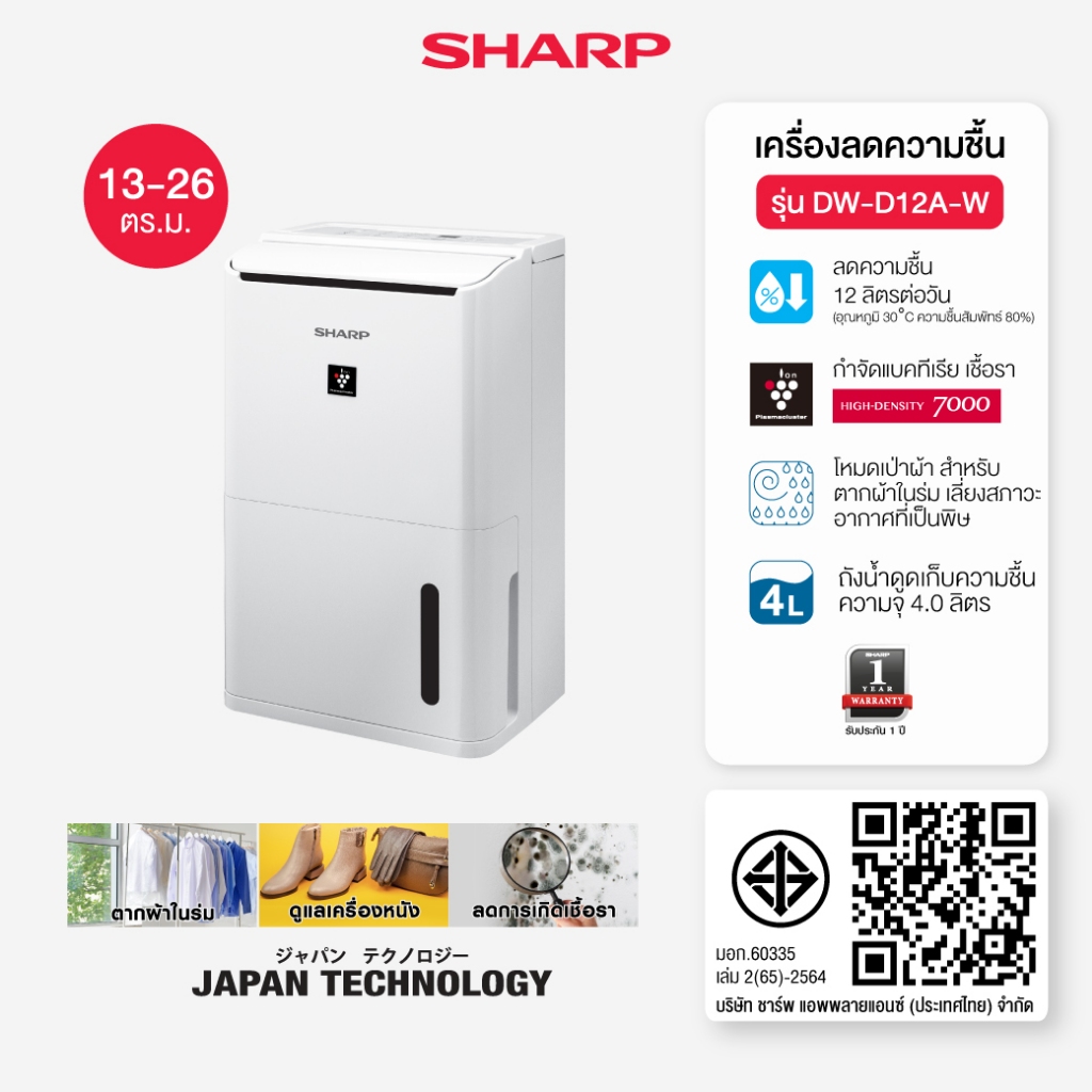 SHARP Dehumidifier เครื่องลดความชื้น ขนาดถังน้ำ 4.0 ลิตร ขนาดห้อง 13-26 ตร.ม รุ่น DW-D12A-W