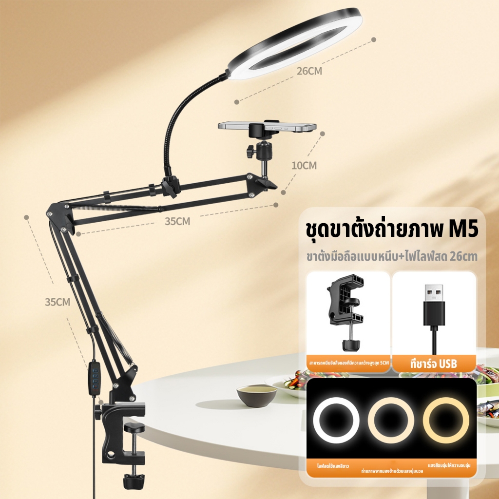 ไฟไลฟ์สดตั้งโต๊ะ ไฟLED 26cm+ที่จับมือถือ โหมดไฟ 3 สี ไฟไลฟ์สด ไฟถ่ายรูป เซลฟี่ อัดวิดีโอ แต่งหน้า ถ่ายรูปสินค้า