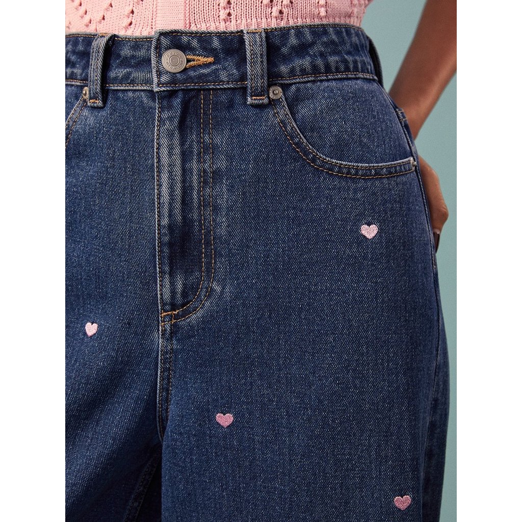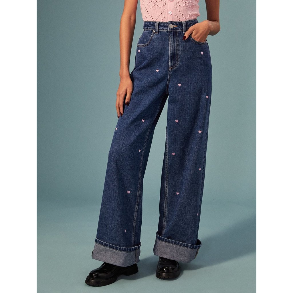 [Pomelo] กางเกงยีนส์ขากว้างแต่งดีเทลลายปักหัวใจอันจิ๋ว / Heart Embroidered Wide-Leg Jeans