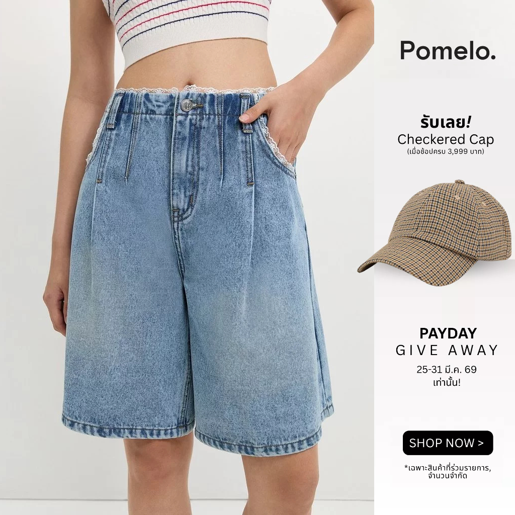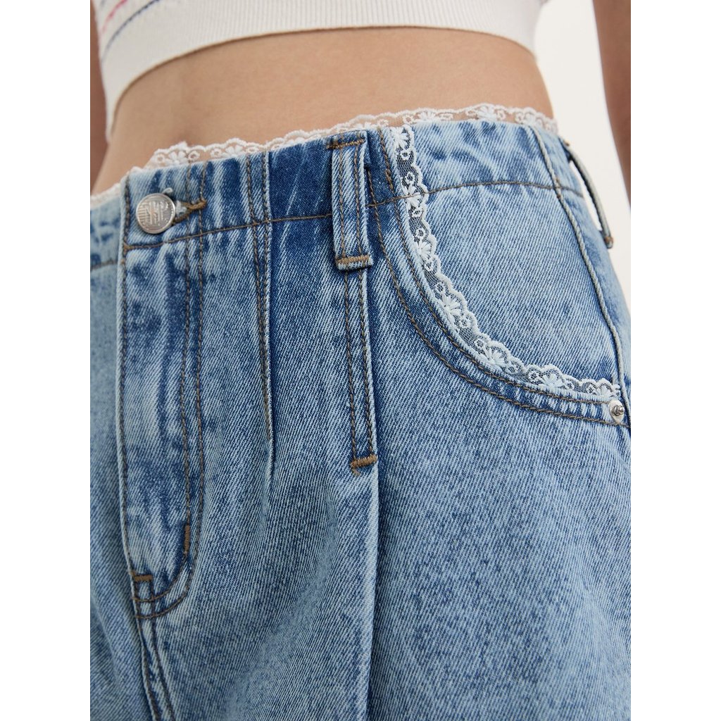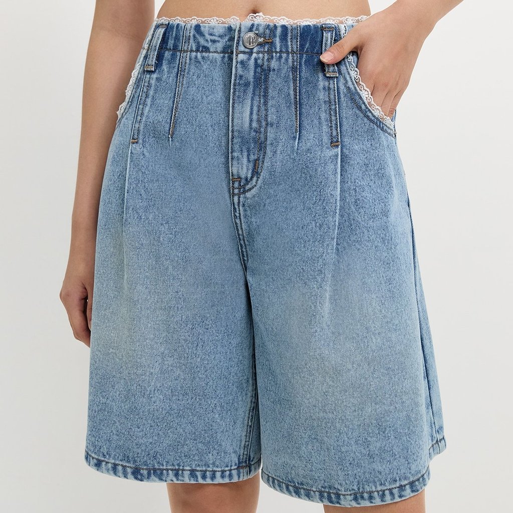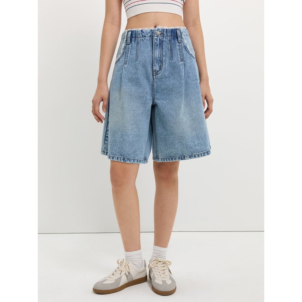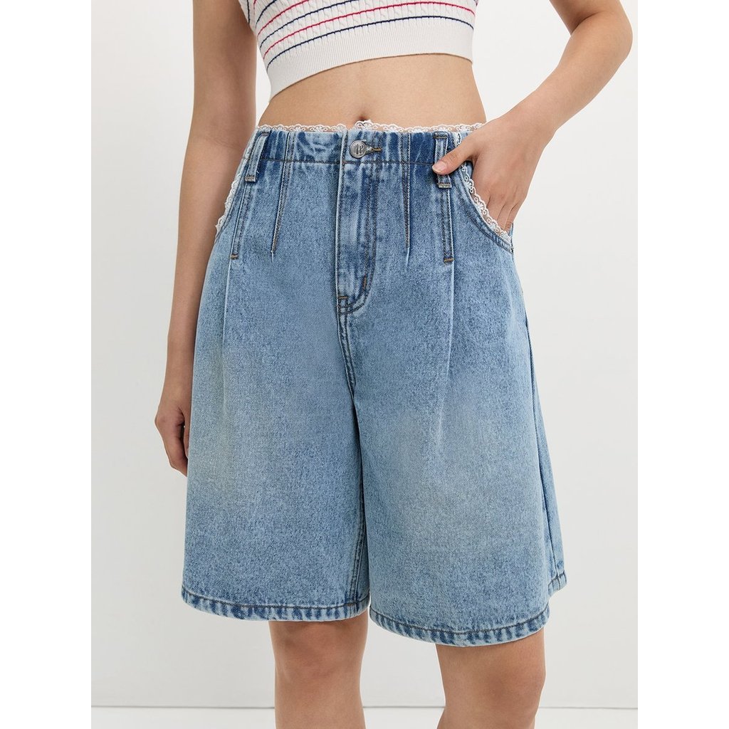 [Pomelo] กางเกงยีนส์แต่งขอบลูกไม้ / Lace Trim Bermuda Shorts